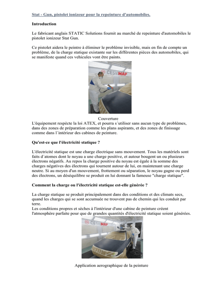 Stat - Gun, pistolet ionizeur pour la repeinture d'automobiles. Introduction Le fabricant anglais STATIC Solutions fournit au marché de repeinture d'automobiles le pistolet ionizeur Stat Gun. Ce pistolet aidera le peintre à éliminer le problème invisible, mais en fin de compte un problème, de la charge statique existante sur les différentes pièces des automobiles, qui se manifeste quand ces vehicules vont être paints. Couverture L'équipement respècte la loi ATEX, et pourra s´utiliser sans aucun type de problèmes, dans des zones de préparation comme les plans aspirants, et des zones de finissage comme dans l´intérieur des cabines de peinture. Qu'est-ce que l'électricité statique ? L'électricité statique est une charge électrique sans mouvement. Tous les matériels sont faits d´atomes dont le noyau a une charge positive, et autour bougent un ou plusieurs électrons négatifs. Au repos la charge positive du noyau est égale à la somme des charges négatives des électrons qui tournent autour de lui, en maintenant une charge neutre. Si au moyen d'un mouvement, frottement ou séparation, le noyau gagne ou perd des électrons, un déséquilibre se produit en lui donnant la fameuse "charge statique". Comment la charge ou l'électricité statique est-elle générée ? La charge statique se produit principalement dans des conditions et des climats secs, quand les charges qui se sont accumuée ne trouvent pas de chemin qui les conduit par terre. Les conditions propres et sèches à l'intérieur d'une cabine de peinture créent l'atmosphère parfaite pour que de grandes quantités d'électricité statique soient générées. Application aerographique de la peinture Mais nous verrons que la charge statique se génère non seulement à l'intérieur des cabines de peinture, mais nombreuses sont les opérations que le peintre doit réaliser chaque jour dans son atelier, qui crée aussi de l´électricité statique. Ponçage En général tous les travaux de ponçage qui sont réalisés sur les surfaces à réparer et peindre, génèrent assez de charge statique, étant l'une des causes les plus importantes de taches et de saletés en phase de finition. Ponçage manuel Nettoyage et soufflage Le nettoyage des pièces au papier de cellulose et le soufflage avec un air comprimé peuvent aussi générer une électricité et charge statique, qui s´ajoute ainsi à d´autres possibles causes de défauts. Masquage Le peintre utilisera du papier et plastique pour réaliser les différents travaux de masquage sur les parties du véhicule que ne doivent pas être peintes. Ces travaux si quotidiens à réaliser de la part des peintres peuvent créer une charge statique. Travail de masquage Dégraissage Le dégraissage est une opération qui se répète constamment le long des processus de travail de peinture. Tous les travaux de dégraissage sont importants, mais le dernier dégraissage, celui que le pientre réalise avec la voiture entièrement masquée et prète à peindre, est le plus détaillé et scrupuleux que le peintre puisse réaliser car il ne lui reste plus qu´à appliquer la couleur et le vernis. Dégraissage Ce dégraissage final, d'une importance vitale dans la réparation, peut aussi créer une charge statique, et par conséquent, un risque d'apparition de défauts en couche finale de peinture. Application aerographique Même quand le peintre réalise des applications de peintures avec son équipement aerographique, il peut se produire également une charge statique, puisque le propre air comprimé après être sorti projeté par le pistolet la génère. Application de l´apprêt. Pourquoi la charge statique est-elle un problème ? La charge statique est un problème invisible avec lequel le peintre doit se battre tous les jours lors des applications de peinture. Elle génère surtout des problèmes de contamination comme des taches de poussière et autres incrustations sur la peinture juste appliquée. Ce sont les pièces en plastique de l´automobile, (parechoque, grilles, moules protege rétros, etc) qui souffrent de ce problème d´électricité statique. Taches de poussière, saletés. Ces défauts de continuation par saleté dans la peinture rarement ne pourront trouver de solution, mais ils vont demander du temps et du matériel extra pour y arriver, au détriment de la productivité de la réparation. D´autres problèmes qui peuvent être causés par l´électricité statique et qui ne sont pas si faciles à éliminer, sont les suivants : - Un placement irrégulier des particules d'effet (aluminium et perlé) dans les couleurs métallisées et perlées, causant de petites zones d´ombres ou « nuages » de différentes intensités. Ombres opu nuages » - Petites différences dans l'égalisation de couleur sur une couleur déterminée (métallisés clair et beige, et perlés clairs). Applications irrégulières de quantité de produit appliqué avec le résultat de surcharge sur de zones comme les bords, etc. Aucun peintre en appliquant dans la cabine la plus propre du monde, n'échappe aux problèmes que l'électricité statique génère. Cabine propre en parfait état. Comment l´éliminer ? Pour éliminer la charge statique de manière éficace, on devra utiliser un air ionisé sur tout le procédé. Pour cette fonction on présente le nouveau pistolet ioniseur STATGUN. Pistolet ioniseur Stat-Gun Les différentes parties métalliques et en plastique de la voiture ont des charges statiques positives et négatives, et ce que le pistolet Stat –Gun génère, ce sont des ions positifs et négatifs qui neutralisent la charge (la négative neutralise la positive et vice versa) STAT-GUN Le pistolet STAT-GUN est conçu spécifiquement pour être utilisé dans les ateliers de carrosserie et de peinture, dans la partie finale du processus, avant la pulvérisation de la peinture et (ou) du vernis. Il a un microprocesseur qui génère un haut voltage transféré au moyen des é