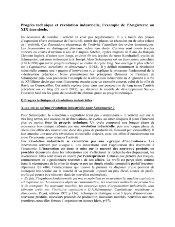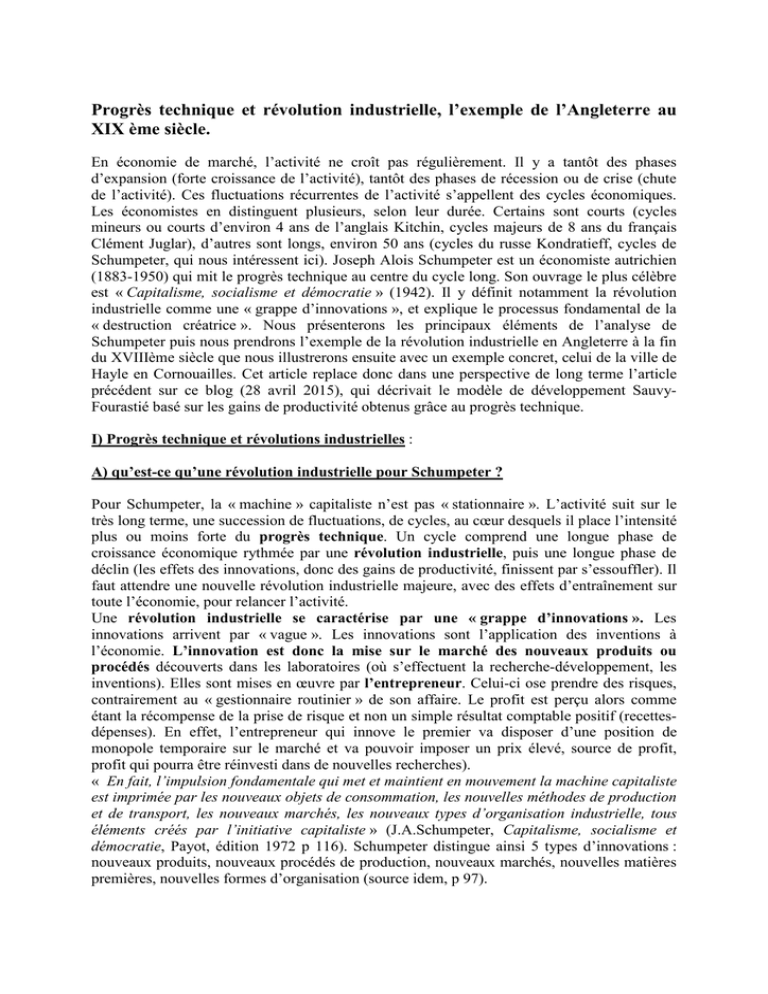 Progrès technique et révolution industrielle, l’exemple de l’Angleterre au XIX ème siècle. En économie de marché, l’activité ne croît pas régulièrement. Il y a tantôt des phases d’expansion (forte croissance de l’activité), tantôt des phases de récession ou de crise (chute de l’activité). Ces fluctuations récurrentes de l’activité s’appellent des cycles économiques. Les économistes en distinguent plusieurs, selon leur durée. Certains sont courts (cycles mineurs ou courts d’environ 4 ans de l’anglais Kitchin, cycles majeurs de 8 ans du français Clément Juglar), d’autres sont longs, environ 50 ans (cycles du russe Kondratieff, cycles de Schumpeter, qui nous intéressent ici). Joseph Alois Schumpeter est un économiste autrichien (1883-1950) qui mit le progrès technique au centre du cycle long. Son ouvrage le plus célèbre est « Capitalisme, socialisme et démocratie » (1942). Il y définit notamment la révolution industrielle comme une « grappe d’innovations », et explique le processus fondamental de la « destruction créatrice ». Nous présenterons les principaux éléments de l’analyse de Schumpeter puis nous prendrons l’exemple de la révolution industrielle en Angleterre à la fin du XVIIIème siècle que nous illustrerons ensuite avec un exemple concret, celui de la ville de Hayle en Cornouailles. Cet article replace donc dans une perspective de long terme l’article précédent sur ce blog (28 avril 2015), qui décrivait le modèle de développement SauvyFourastié basé sur les gains de productivité obtenus grâce au progrès technique. I) Progrès technique et révolutions industrielles : A) qu’est-ce qu’une révolution industrielle pour Schumpeter ? Pour Schumpeter, la « machine » capitaliste n’est pas « stationnaire ». L’activité suit sur le très long terme, une succession de fluctuations, de cycles, au cœur desquels il place l’intensité plus ou moins forte du progrès technique. Un cycle comprend une longue phase de croissance économique rythmée par une révolution industrielle, puis une longue phase de déclin (les effets des innovations, donc des gains de productivité, finissent par s’essouffler). Il faut attendre une nouvelle révolution industrielle majeure, avec des effets d’entraînement sur toute l’économie, pour relancer l’activité. Une révolution industrielle se caractérise par une « grappe d’innovations ». Les innovations arrivent par « vague ». Les innovations sont l’application des inventions à l’économie. L’innovation est donc la mise sur le marché des nouveaux produits ou procédés découverts dans les laboratoires (où s’effectuent la recherche-développement, les inventions). Elles sont mises en œuvre par l’entrepreneur. Celui-ci ose prendre des risques, contrairement au « gestionnaire routinier » de son affaire. Le profit est perçu alors comme étant la récompense de la prise de risque et non un simple résultat comptable positif (recettesdépenses). En effet, l’entrepreneur qui innove le premier va disposer d’une position de monopole temporaire sur le marché et va pouvoir imposer un prix élevé, source de profit, profit qui pourra être réinvesti dans de nouvelles recherches). « En fait, l’impulsion fondamentale qui met et maintient en mouvement la machine capitaliste est imprimée par les nouveaux objets de consommation, les nouvelles méthodes de production et de transport, les nouveaux marchés, les nouveaux types d’organisation industrielle, tous éléments créés par l’initiative capitaliste » (J.A.Schumpeter, Capitalisme, socialisme et démocratie, Payot, édition 1972 p 116). Schumpeter distingue ainsi 5 types d’innovations : nouveaux produits, nouveaux procédés de production, nouveaux marchés, nouvelles matières premières, nouvelles formes d’organisation (source idem, p 97). B) Le processus de destruction créatrice Pour Schumpeter, « le processus de mutation industrielle qui révolutionne continuellement de l’intérieur la structure économique détruit continuellement ses éléments vieillis et crée continuellement des éléments neufs. C’est un processus de destruction créatrice. C’est la donnée fondamentale du capitalisme et toute entreprise doit s’y adapter (source idem p 116). Ainsi les éléments nouveaux rendent obsolètes les éléments anciens. C’est vrai des nouveaux produits (les smartphones et tablettes d’aujourd’hui démodent le téléphone fixe voire les ordinateurs), des nouveaux modes de production (ainsi le flux tendu du toyotisme a remplacé l’organisation scientifique du travail et le fordisme), des nouveaux marchés (la Chine et les pays émergents remplacent la vieille Europe), des nouvelles matières premières (la matière plastique, la fibre de carbone, le titane). Des entreprises disparaissent faute de s’adapter, d’autres apparaissent et se développent (aujourd’hui, les start-up). « Ce processus de mutation industrielle imprime l’élan fondamental qui donne leur ton aux affaires. Pendant que ces nouveautés sont mises en train, la dépense est facile et la prospérité est prédominante, mais en même temps que ces réalisations s’achèvent et que leurs fruits se mettent à affluer, l’on assiste à l’élimination des éléments périmés…Ainsi se succèdent des périodes prolongées de gonflement des prix, des taux d’intérêt, de l’emploi et ainsi de suite, ces phénomènes constituant autant de pièces du mécanisme de rajeunissement récurrent de l’appareil de production » (idem, p 97). Le progrès technique est donc le moteur de l’expansion, notamment par les effets des gains de productivité qu’il engendre sur les prix réels et les salaires réels, mais son essoufflement crée la récession (voir article d’avril 2015 sur ce blog). C) La « respiration de l’histoire » : les enchaînements des Révolutions Industrielles. On peut 