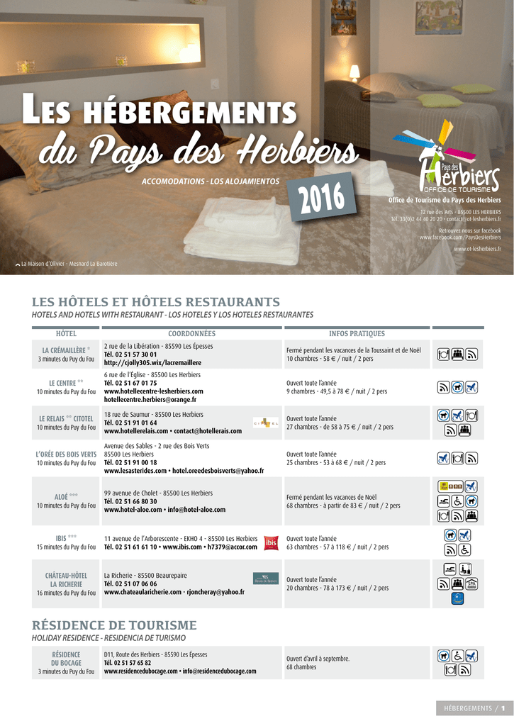 Les hébergements du Pays des Herbiers accomodations - Los alojamientos 2016 Office de Tourisme du Pays des Herbiers 12 rue des Arts - 85500 LES HERBIERS Tél. 33(0)2 44 40 20 20 • [email protected] Retrouvez nous sur facebook www.facebook.com/PaysDesHerbiers www.ot-lesherbiers.fr La Maison d’Olivier - Mesnard La Barotière LES HÔTELS ET HÔTELS RESTAURANTS HOTELS AND HOTELS WITH RESTAURANT - LOS HOTELES Y LOS HOTELES RESTAURANTES HÔTEL LA CRÉMAILLÈRE * 3 minutes du Puy du Fou LE CENTRE ** 10 minutes du Puy du Fou LE RELAIS ** CITOTEL 10 minutes du Puy du Fou COORDONNÉEs INFOS PRATIQUES 2 rue de la Libération - 85590 Les Épesses Tél. 02 51 57 30 01 http://cjolly305.wix/lacremaillere Fermé pendant les vacances de la Toussaint et de Noël 10 chambres - 58 € / nuit / 2 pers 6 rue de l’Église - 85500 Les Herbiers Tél. 02 51 67 01 75 www.hotellecentre-lesherbiers.com [email protected] Ouvert toute l’année 9 chambres - 49,5 à 78 € / nuit / 2 pers 18 rue de Saumur - 85500 Les Herbiers Tél. 02 51 91 01 64 www.hotellerelais.com • [email protected] Ouvert toute l’année 27 chambres - de 58 à 75 € / nuit / 2 pers Avenue des Sables - 2 rue des Bois Verts L’ORÉE DES BOIS VERTS 85500 Les Herbiers 10 minutes du Puy du Fou ALOÉ *** 10 minutes du Puy du Fou IBIS *** 15 minutes du Puy du Fou Tél. 02 51 91 00 18 www.lesasterides.com • [email protected] Ouvert toute l’année 25 chambres - 53 à 68 € / nuit / 2 pers 99 avenue de Cholet - 85500 Les Herbiers Tél. 02 51 66 80 30 www.hotel-aloe.com • [email protected] Fermé pendant les vacances de Noël 68 chambres - à partir de 83 € / nuit / 2 pers 11 avenue de l’Arborescente - EKHO 4 - 85500 Les Herbiers Tél. 02 51 61 61 10 • www.ibis.com • [email protected] Ouvert toute l’année 63 chambres - 57 à 118 € / nuit / 2 pers SAUNA CHÂTEAU-HÔTEL LA RICHERIE 16 minutes du Puy du Fou La Richerie - 85500 Beaurepaire Tél. 02 51 07 06 06 www.chateaularicherie.com • [email protected] Ouvert toute l’année 20 chambres - 78 à 173 € / nuit / 2 pers RÉSIDENCE DE TOURISME HOLIDAY RESIDENCE - RESIDENCIA DE TURISMO Résidence du bocage 3 minutes du Puy du Fou D11, Route des Herbiers - 85590 Les Épesses Tél. 02 51 57 65 82 www.residencedubocage.com • [email protected] Ouvert d’avril à septembre. 68 chambres hébergements / 1 Légendes / legends / leyendas Piscine / swimming pool / Piscina Label Camping Qualité (Sello) Randonnée / hike / caminata Label Gîtes de France (Sello) Tennis / Tenis Label Clévacances (Sello) Animations / Animacionès Label Tourisme et Handicap (Sello) Lac Accessible aux personnes handicapées Accessible to the people handicapped persons Accesible a las personas minusválidos Chiens acceptés / Accepted dogs Perros aceptados Restaurant - Table d’hôtes - Snacks la cena completa Mini golf Salle de réunions / Meeting room de reuniones Sala Label Vacances Pêche Vendée (Sello) Wifi Logis de France (Sello) Label Fleur de Soleil (Sello) EF : e nsemble famille / a family set un conjunto familia Jacuzzi SPA SAUNA Sauna Hammam Chèques vacances acceptés Espace détente Les 4 Chênes (Les Herbiers) Label La Clef Verte (Sello) LES CAMPINGS CAMPSITES - CAMPINGS CAMPING LA BRETÈCHE *** 3 minutes du Puy du Fou LA TRICHERIE *** 18 minutes du Puy du Fou LA MOTTE *** 20 minutes du Puy du Fou LE HAMEAU DU PETIT LAY *** 22 minutes du Puy du Fou L’ÉTANG DU PUY (Aire Naturelle) 5 minutes du Puy du Fou LES LOGES 5 minutes du Puy du Fou LA CHOLETIÈRE 10 minutes du Puy du Fou COORDONNÉEs INFOS PRATIQUES Base de Loisirs - 85590 Les Épesses Tél. 02 51 57 33 34 www.campinglabreteche.com [email protected] Ouvert du 1er avril au 30 septembre • 128 emplacements - 15,60 à 20,30 € / nuit le forfait • 24 chalets (4/6 et 5/7 pers) 290 à 750 € / semaine • 12 bungalows toilés (5 pers) 210 à 445 € / semaine • Ecolodges 5 pers de 250 à 538 € / semaine. Base de Loisirs La Tricherie 85500 Mesnard-la-Barotière Tél. 02 51 66 04 31 www.campinglatricherie.com [email protected] Ouvert du 2 avril au 30 septembre • 43 emplacements - 14,70 à 18,90 € / nuit le forfait • 23 chalets (4/7 pers) - 314 à 669 € / semaine • 1 mobil-home (6 pers) - 357 à 669 € / semaine La Motte - 85250 Vendrennes Tél. 02 51 63 59 67 www.camping-lamotte.com [email protected] Ouvert toute l’année • 46 emplacements - 12,40 à 19,50 € / nuit le forfait • 5 chalets (2/4 pers, 6/7 pers, 8 pers) 245 à 1 030 € / semaine • 31 mobil-home (2/4 pers et 4/6 pers) 225 à 735 € / semaine • 1 caravane (2/4 pers) 210 à 350 € / semaine Chauvin - 85640 Mouchamps Tél. 02 51 66 25 72 www.lehameaudupetitlay.com [email protected] Camping ouvert du 15 juin au 15 septembre ; chalets ouverts à l’année • 24 emplacements 14,50 € / nuit le forfait • 15 chalets (2/4 et 4/6 pers) 199 à 540 € / semaine 2 La Norissonnière - 85590 St-Mars-la-Réorthe Tél. 09 51 52 70 45 • 06 68 37 54 44 www.campingdeletangdupuy.com [email protected] Ouvert du 1er avril au 30 septembre • 35 emplacements - 10 à 15 € / nuit le forfait • 6 bungalows toilés (5 pers) 295 à 390 € / semaine • 1 tente cocoon (2 pers) 30 à 40 € / nuit • 1 campétoile (2 pers) 30 € / nuit • 2 caravanes (3 pers) 30 à 45 € la nuit • 1 tipi (5 pers) 30 à 50 € / nuit M. et Mme GUERIN Les Loges - 85500 Les Herbiers Tél. 02 51 67 02 54 • [email protected] Ouvert du 1er avril au 30 septembre • 6 emplacements - 9 € / nuit le forfait La Choletière - 85500 Les Herbiers Tél. 02 51 67 33 89 • 06 21 11 15 70 [email protected] Ouvert toute l’année • 3 emplacements 16 € / nuit le forfait • 3 mobil-home (4/6 pers) 55 à 65 € / nuit 2 / VOTRE Séjour au Pays des Herbiers HÉBERGEMENT INSOLITE UNUSUAL ACCOMODATION - ALOJAMIENTOS INSOLITOS HÔTEL TERRAGORA LODGES 10 minutes du Puy du Fou LES ROULOTTES DE LA BASSE MAUNERIE 4 minutes du Puy du Fou COORDONNÉEs INFOS PRATIQUES La Poizelière - 85590 Les