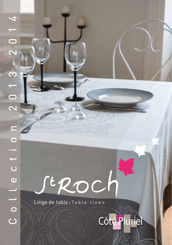 2 0 1 3 - 2 0 1 4 C o l l e c t i o n Linge de table / T a b l e l i n e n Côté Pluriel 1 E lément phare de la collection St Roch depuis toujours, la nappe Jacquard placée en coton est de retour avec 2 nouveaux dessins classiques. Un choix de couleurs dans des tons flamboyants pour les fêtes de fin d’année et dans une gamme de teintes naturelles pour toutes occasions, ces nappes exclusives agrémenteront parfaitement votre table tout au long de l’année. La collection des torchons et essuie-mains coordonnés s’enrichit également de nouveaux modèles. Recettes gourmandes, montagne rétro, city, Art Nouveau et nature... différents styles se côtoient afin que chacun puisse y trouver son bonheur. ST Roch utilise une nouvelle fois son savoir-faire afin de vous satisfaire. Très belle fin d’année à tous ! Edito A lways the standard-bearer for the St Roch collections, the woven cotton Jacquard tablecloth is back with two new classical designs. With a selection of colours in extravagant tones for the end-of-year celebrations as well as a range of natural shades for any occasion, these exclusive tablecloths will perfectly liven up your table throughout the year. Our collection of tea towels and co-ordinated hand towels is enhanced with the inclusion of exciting new models. Mouth-watering recipes, mountain scenes in a retro style, cityscape, Art Nouveau and Nature ensure that each and everyone will find what they seek. Once again St Roch weaves its magic in order to enchant you ! We wish you all a very nice end-of-year. 2 3 Sommaire Collection St Roch Collection St Roch Jacquard tablecloths, placemats & napkins, table runner, cotton set design p6 Nappes jacquard, sets & serviettes, vis-à-vis, coton dessin placé p6 Jacquard tablecloths, napkins, cotton ‘‘all-over’’ design p 16 Nappes jacquard, serviettes, coton all-over p 16 Coated cotton jacquard tablecloths ‘‘all-over’’ design p 21 Nappes jacquard coton enduit all-over p 21 Polyester linen tablecloths ‘‘all-over’’ design p 24 Nappes jacquard polyester-lin all-over p 24 Plain polyester linen-effect tablecloths p 26 Nappes unies polyester effet lin p 26 Printed polyester tablecloths & table runners p 28 Nappes & vis à vis polyester imprimés p 28 Printed polyester placemats p 32 Sets polyester imprimés p 32 Plain cotton napkins p 36 Serviettes de table unies coton p 36 Tea towels & hand towels p 38 Torchons et essuie-mains p 38 Collection Côté Pluriel Collection Côté Pluriel Jacquard tablecloths, napkins, cotton ‘‘all-over’’ design p 72 Nappes jacquard, serviettes, coton all-over p 72 Tablecloths jacquard napkins, polyester ‘‘all-over’’ design p 78 Nappes jacquard, serviettes, polyester all-over p 78 Printed polyester tablecloths p 86 Nappe imprimée polyester all-over p 86 Tea towels & hand towels p 88 Torchons et essuie-mains p 88 Hors collection - Promotions End-of-line - Promotions Tablecloths, table runner, placemats, tea towels & hand towels Care instructions & Maintenance 4 p 96 p 115 Nappes, tissu, vis à vis, sets, serviettes, torchons, essuie-mains p 96 Conditions de lavage & d’entretien p 115 5 placées coton Nappes Jacquard AURELIA Rouge 21 AURELIA Argent 91 AURELIA Nappe Jacquard / Jacquard tablecloth Traitement déperlant / Water-repellent treatment Pur coton / Pure cotton 175 X 175 cm - 175 X 265 cm - 175 X 320 cm. Nouveauté New 6 7 Nouveauté New 59 Rubis BEAUVOIS Nappe Jacquard / Jacquard tablecloth Traitement déperlant / Water-repellent treatment Pur coton / Pure cotton 175 X 175 cm - 175 X 265 cm - 175 X 320 cm. 8 9 MADRI Nappe Jacquard / Jacquard tablecloth Traitement déperlant / Water-repellent treatment Pur coton / Pure cotton 175 X 175 cm - 175 X 265 cm - 175 X 320 cm. Beige 63 10 Safran 49 11 Gris 91 Prune 96 MESSANA Or argent 15 Nappe Jacquard / Jacquard tablecloth Traitement déperlant / Water-repellent treatment Pur coton / Pure cotton 175 X 175 cm - 175 X 265 cm - 175 X 320 cm. Serviette / Napkin 50 x 50 Set / Placemat 37 x 48 NOËL Nappe Jacquard / Jacquard tablecloth Traitement déperlant / Water-repellent treatment Pur coton / Pure cotton 175 X 175 cm - 175 X 265 cm - 175 X 320 cm. Serviette / Napkin 50x50 12 13 PALATINE Nappe Jacquard / Jacquard tablecloth Traitement déperlant / Water-repellent treatment Pur coton / Pure cotton 175 X 175 cm - 175 X 265 cm - 175 X 320 cm. Tomette 60 Gris 91 ZOÉ Nappe Jacquard / Jacquard tablecloth Traitement déperlant / Water-repellent treatment Pur coton / Pure cotton 175 X 175 cm - 175 X 265 cm - 175 X 320 cm. Or lin 15 Ivoire mastic 35 14 13 15 MEDICIS Jacquard all-over coton & métis (lin coton) Cotton & cotton / linen mix Jacquard with « all-over » pattern Nappes Jacquard all-over coton Laize 320 cm - Width 320 cm. Blanc 00 Ivoire 05 Mastic 35 Or lin 15 Carmin 54 PATCHPOP Jacquard all-over coton Jacquard with « all-over » pattern Laize 320 cm - Width 320 cm. Clémentine 13 Coloris Or lin 15 16 14 17 Grenade 57 Blanc 00 Ivoire 05 Mastic 35 Gris 92 Carmin 54 Or lin 15 Moka 91 Platine 19 TOSCANE Jacquard all-over coton & métis (lin coton) Cotton & cotton / linen mix Jacquard with « all-over » pattern Laize 320 cm - Width 320 cm. TOSCATIVAL Jacquard all-over - Coton - Cotton mix Jacquard with « all-over » pattern Laize 320 cm - Width 320 cm. Mastic 35 18 17 19 all-over coton enduit Jacquard all-over coton / Cotton mix Jacquard with « all-over » pattern Laize 320 cm - Width 320 cm. TOSCATIVAL Jacquard all-over coton - ENDUCTION ACRYLIQUE Cotton mix Jacquard with « all-over » pattern with acrylic coating Blanc 00 Laize 160 cm - Width 160 cm. Mastic 35 20 21 Nappes Jacquard VENDANGE ASTER Jacquard all-over - coton - Cotton Jacquard with « all-over » pattern Enduction acrylique - Acrylic-coated Laize 175 cm - Width 175 cm. Pacifique 54 Gris 91 Mûre 34 Fuschia 33 PAVOT Jacquard all-over - coton - Cotton Jacquard with « all-over » pattern Enduction acrylique - Acrylic-coated Laize 175 cm - Width 17