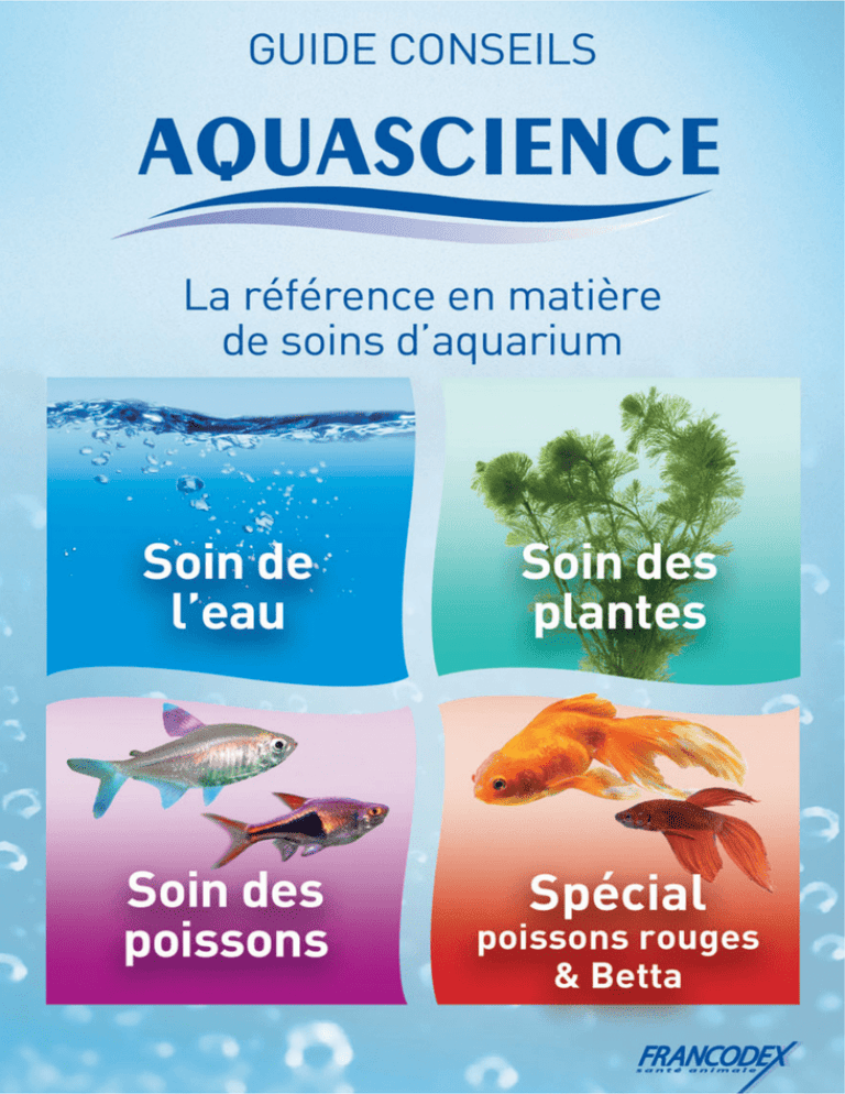 Ce guide n’a pas pour objectif de remplacer un manuel d’aquariophilie, mais, nous espérons qu’il vous donnera des bases utiles et le goût de continuer à vous documenter et à vous informer. Chez AQUASCIENCE, marque spécialisée en aquariophilie et élaborée par un laboratoire vétérinaire français, le conseil est notre maître mot. Vous retrouverez ces conseils tout au long de ce guide qui rassemble les principes de base et répond aux principales attentes des aquariophiles. Avec AQUASCIENCE, vous entrez dans l’univers de l’aquariophilie «nouvelle génération». En effet, les produits de traitement AQUASCIENCE ont été dotés d’une innovation technologique majeure : la Thérapie Vectorisée. La Thérapie Vectorisée, c’est la performance de « téléguider » des Biosphérules chargées de principes actifs vers les parties à traiter des poissons pour une efficacité renforcée. Mais AQUASCIENCE ne se contente pas de mettre au point des spécialités performantes, elles doivent également être faciles d’utilisation, pour que le plaisir procuré par l’aquarium soit encore plus grand. Chez AQUASCIENCE les produits sont facilement identifiables grâce à une segmentation de couleur : bleu pour le soin de l’eau, vert pour les plantes et rose pour les poissons. Efficacité, simplicité d’utilisation et innovation technologique, tels sont les impératifs d’AQUASCIENCE pour répondre à vos attentes. Aquariophilement vôtre ! Sommaire soin de l’eau soin des plantes soin des poissons spécial poissons rouges et Betta p. 3 p. 10 p. 14 p. 23 Il n’existe pas « une eau », mais différents types d’eau. Selon leur origine, elles sont plus ou moins acides, calcaires, chargées en sels minéraux. En d’autres termes, la qualité de l’eau est très variable, et détermine des écosystèmes spécifiques, dans lesquels évoluent et se développent une faune et une flore particulières. Aussi il est primordial de connaître la nature de l’eau dont on dispose, de la contrôler et de la préparer pour le bien-être des poissons. soin de l’eau BIEN CONNAÎTRE L’EAU DE SON AQUARIUM Les six principaux paramètres qui définissent la qualité de l’eau et qu’il faut donc surveiller à tout prix sont : • la concentration en composés azotés (nitrites, nitrates) • le pH • le T.A.C. (dureté carbonatée) • le T.H. (dureté totale) • le chlore Afin de contrôler les paramètres de l’eau de votre aquarium, AQUASCIENCE propose AQUATEST® 6 en 1, rapide et simple d’utilisation pour un résultat précis. Aquatest 6 en 1 mesure pH, Nitrites, Nitrates, T.A.C., T.H. et Chlore 3 soin de l’eau LE CYCLE DE L’AZOTE ET LES PARAMÈTRES DE L’EAU : QU’EST-CE QUE LE CYCLE DE L’AZOTE ? L’Azote (N) est un élément fondamental de la matière vivante. Dans l’aquarium, les composés azotés se retrouvent notamment dans les excréments des poissons, les surplus de nourriture, les feuilles mortes, etc. On parle de déchets organiques. Ces derniers se transforment en composés ammoniacaux (NH /NH +), puis en nitrites (NO ) très - 3 4 2 toxiques, et en nitrates (NO ) beaucoup moins toxiques. Ce sont les bactéries épuratrices (Nitrosomonas, Nitrobacter) qui vont détoxifier ces déchets azotés en nitrites, puis en nitrates, et perpétuer ainsi le cycle de l’azote : les nitrates sont en petite partie absorbés par les plantes et éliminés partiellement lors de changements d’eau réguliers. - 3 Bactérie Nitrobacter Le cycle de l’azote LES PARAMÈTRES DE L’EAU LES NITRITES ET LES NITRATES Nous vous conseillons vivement de contrôler la concentration en nitrites de votre eau une fois par semaine. Les nitrites doivent être pratiquement indécelables dans un aquarium dont le cycle biologique est normalement établi. Une concentration en nitrites de 0,25 mg/l est un seuil à partir duquel la santé de vos poissons est en danger. N’oubliez pas que le surpeuplement, l’excès de nourriture ou un filtre défaillant sont bien souvent à l’origine de montées de nitrites. Dans de tels cas, réagissez rapidement en renouvelant les 2/3 de l’eau de l’aquarium et en aérant votre eau abondamment. Evitez tout écart de température, et ensemencez en bactéries épuratrices (voir Filtrobacter). 4 soin de l’eau Les nitrates sont beaucoup moins toxiques que les nitrites, mais cette toxicité est très variable selon les espèces. On estime que de hautes teneurs en nitrates provoquent un stress et donc une plus grande sensibilité aux maladies (affaiblissement du système immunitaire). Les poissons marins et les invertébrés sont particulièrement sensibles à la présence de nitrates. Les nitrates ont de plus la caractéristique de favoriser le développement d’algues indésirables. Nous vous conseillons de maintenir une concentration en nitrates inférieure à 50 mg/l. Renouvelez 1/3 de l’eau de l’aquarium chaque mois. Profitez-en pour couper et retirer les feuilles jaunes ou couvertes d’algues. QU’EST-CE QUE LE pH ? Le pH mesure l’état d’équilibre acidité / alcalinité de l’eau. Cette acidité ou cette alcalinité se détermine au moyen d’une échelle universellement graduée de 0 à 14. Un pH inférieur à 7 correspond à une eau acide alors qu’un pH supérieur à 7 indique que l’eau est alcaline (ou basique). Acidité 0 1 2 3 Alcalinité 4 5 6 7 8 9 10 11 12 13 14 Domaine de la vie aquatique pH = 7 est le point de neutralité. La vie aquatique est possible entre une acidité pH=3 et une alcalinité pH=9 environ, en fonction des espèces et du biotope auquel ils appartiennent. Cependant, dans la plupart des cas, les valeurs sont comprises entre 6 et 9. En aquariophilie, 2 approches sont possibles : La première est de vouloir mélanger dans un même bac des poissons issus de biotopes différents. La solution : adapter le pH aux poissons présents dans l’aquarium (demandez conseil à votre animalier). La deuxième approche 