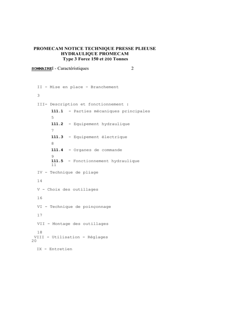 PROMECAM NOTICE TECHNIQUE PRESSE PLIEUSE HYDRAULIQUE PROMECAM Type 3 Force 150 et 200 Tonnes SOMMAIREI - Caractéristiques 2 II - Mise en place - Branchement 3 III- Description et fonctionnement : 111.1 - Parties mécaniques principales 5 111.2 - Equipement hydraulique 7 111.3 - Equipement électrique 8 111.4 - Organes de commande 9 111.5 11 - Fonctionnement hydraulique IV - Technique de pliage 14 V - Choix des outillages 16 VI - Technique de poinçonnage 17 VII - Montage des outillages 18 VIII - Utilisation - Réglages 20 IX - Entretien PROMECAM NOTICE TECHNIQUE PRESSE PLIEUSE HYDRAULIQUE PROMECAM Type 3 Force 150 et 200 Tonnes II - MISE EN PLACE BRANCHEMENT Le montage des parties démontées, les différents réglages et la mise en service de la machine sont effectués par notre Service Après-vente, lequel se chargera également de 1 instruction du personnel utilisateur. A réception de la machine, l'utilisateur devra effectuer : - La mise en place de la presse sur sa fosse, - Le raccordement du démarreur électrique au secteur. I - MISE EN PLACE DE LA PRESSE. La machine devra être placée sur la fosse, préparée préalablement selon le plan communiqué par nos services. Les efforts de levage devront être appliqués exclusivement aux points d'élinguage indiqués dans nos instructions de manutention. En aucun cas l'accrochage ne devra être effectué sur les tabliers supérieur ou inférieur. Dans le cas d'absence de matériel de levage courant, la presse pourra être déplacée sur rouleaux, ou de préférence sur patins à chenille L'utilisateur devra exécuter le plancher destiné à recouvrir la fosse autour de la machine, nous conseillons l'emploi de tôles striées 5 x 7» le mettre en place provisoirement sur les appuis prévus à cet effet sur les bords de fosse, sur la machine à l'avant et sur les côtés de celle-ci. Faire le plein d'huile en respectant le niveau indiqué par le voyant et en utilisant l'huile contenue dans les containers livrés avec la machine. II - BRANCHEMENT. AVANT D'EFFECTUER LE BRANCHEMENT, S'ASSURER QUE LE PLEIN b*HUILE A ETE REALISE. Retirer les notices, schémas et trousse d'outils se trouvant à l'intérieur du pupitre de commande. Effectuer le branchement de la ligne au contacteur de ligne suivant schéma. Raccorder la terre. Commuter l'interrupteur à clé et vérifier par une impulsion sur le bouton "Marche" quête sens de rotation du moteur correspond à celui indiqué par la flèche. Dans le cas contraire, inverser deux phases. Appuyer sur le bouton "Arrêt", retirer la clé de l'interrupteur et attendre l'arrivée des agents techniques P.S.L. Votre contact : Gérald PERRIN Tél. : 03 88 08 39 35 PROMECAM NOTICE TECHNIQUE PRESSE PLIEUSE HYDRAULIQUE PROMECAM Type 3 Force 150 et 200 Tonnes 1°) Le bâti Le bâti mécano-soudé est composé de : . Deux flasques (24) supportant les efforts de pliage. Ces flasques sont reliés entre eux par : - 1 table supérieure 70) - 1. plaque avant (71) - 1 semelle (72). Toutes ces pièces sont soudées et forment un ensemble rigide. Le bâti est complété par une plaque démontable (75) appelée "aile volante". Cette plaque est en appui sur les extrémités des flasques en (74). Elle forme ainsi avec la plaque avant du bâti un caisson au milieu duquel se trouvent t . Les vérins d’équilibrage. . Le vérin d’approche. . Les vérins de travail . Le tablier mobile supportant les matrices et qui est situé dans l'axe du caisson. 2*) Le tablier mobile. Le tablier mobile est guidé par t • Des roulements À galets de manière À assurer son Alignement par rapport à l'axe de poussée des vérins. . Un guidage central assurant le maintien latéral pendant le déplacement et constituant le point d'articulation lors de l'inclinaison du tablier. . Le dispositif d'équilibrage assurant son parallélisme par rapport au tablier fixe. Alignement ou guidage transversal du tablier, est obtenu par des roulements à galets (76^ montés en boggie sur un support réglable et solidaire du bâti. Tous les roulements de ces guidages travaillent légèrement serrés afin d'éliminer les jeux. Parallélisme. Il est obtenu par l'action de deux vérins double effet (22) alimentés par une valve soumise à l'action d'un détecteur de parallélisme (voir paragraphe fonctionnement). Votre contact : Gérald PERRIN Tél. : 03 88 08 39 35 PROMECAM NOTICE TECHNIQUE PRESSE PLIEUSE HYDRAULIQUE PROMECAM Type 3 Force 150 et 200 Tonnes 3°) Le tablier fixe. A la partie supérieure les flasques reçoivent la poussée exercée au moment du pliage par l1intermédiaire l . D’un tablier supérieur (23) en appui sur des Rotules (76) . D’éléments intermédiaires (77) . de 1»outillage„ Le tablier est réglable et bloqué dans le plan du tablier mobile par quatre systèmes à vis (78). 4*) Sécurité en porte-à-faux. La pressa mat équipés d'un dispositif de sécurité destiné à protéger le bâti lors des utilisations en porte- à-faux. Ce dispositif est constitué par deux ensembles comprenant chacun : . Une lame se déformant en fonction de l'effort exercé en porte-à-faux et agissant sur un micro- rupteur (3b) lorsqu'une force de 50% de la force machine est appliquée en extrémité du tablier au droit du flasque. Le micro-rupteur coupe l'alimentation de la bobine du contacteur, provoque l'ouverture de celui-ci et l'arrêt immédiat du moteur entraînant la pompe. Votre contact : Gérald PERRIN Tél. : 03 88 08 39 35 PROMECAM NOTICE TECHNIQUE PRESSE PLIEUSE HYDRAULIQUE PROMECAM Type 3 Force 150 et 200 Tonnes III.2 - EQUIPEMENT HYDRAULIQUE (voir planche 2) L* équipement hydraulique comprend : - Un groupe motopompe (12) à simple débit. - - Un vérin d'approche (4). Deux vérins de travail (3). Une valve d'équilibrage (2). Deux vérins (1) du type double effet, situés aux extrémités de la machine et faisant partie du dispositif d'équilibrage. Un distributeur (M) avec limiteur de force incorporé la commande de celui-ci 