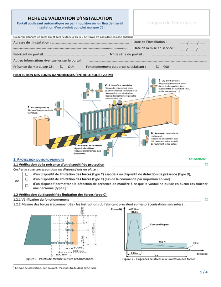 FICHE DE VALIDATION D’INSTALLATION Tampon de l’entreprise Portail coulissant automatique ou par impulsion sur un lieu de travail (installation d’un produit complet marqué CE) Un portail donnant un accès direct avec l’extérieur du lieu de travail est considéré en zone publique Adresse de l’installation : ……………………………………………………………………………… Date de l’installation : ……./………./……… ………………………………………………………………………………………….............................. Date de la mise en service : ……./………./………. Fabricant du portail :………………………………………………………….... Autres informations éventuelles sur le portail : Présence du marquage CE : OUI N° de série du portail : ………………………………………………………. …………………………………………………………………………………………………………………………. Fonctionnement du portail satisfaisant : OUI PROTECTION DES ZONES DANGEREUSES (ENTRE LE SOL ET 2,5 M) SATISFAISANT 1. PROTECTION DU BORD PRIMAIRE 1.1 Vérification de la présence d’un dispositif de protection Cocher la case correspondant au dispositif mis en place : d’un dispositif de limitation des forces (type C) associé à un dispositif de détection de présence (type D), d’un dispositif de limitation des forces (type C) (cas de la commande par impulsion en vue) OU d’un dispositif permettant la détection de présence de manière à ce que le vantail ne puisse en aucun cas toucher 1 une personne (type E) 1.2 Vérification du dispositif de limitation des forces (type C) 1.2.1 Vérification du fonctionnement 1.2.2 Mesure des forces (recommandée - les instructions du fabricant prévalent sur les préconisations suivantes) : Figure 1 - Points de mesure sur site recommandés 1 Figure 2 - Exigences relatives à la limitation des forces Ce type de protection, non courant, n’est pas traité dans cette fiche. 1/4 voir figure 1 Si données disponibles sur l’instrument de mesure (voir figure 2), indiquer les valeurs Période dynamique Période statique Effort maximal (N) Durée maximale de 0,75 s Effort Effort au-delà (< 400 N, ou < 1400 N pour (à compter du moment où maximal (N) de la période une ouverture > 500 mm) l’effort dépasse 150 N) (< 150 N) statique (< 25N) Point 1 ……………………………. N Point 2 SATISFAISANT Dans tous les cas, limitation des forces (valeurs et durées) satisfaisante ……………………………. N …………………………………. s …………………………………. s ……………………. N ……………………. N ……………………. N ……………………. N Point 3 ……………………………. N …………………………………. s ……………………. N ……………………. N Point 4 ……………………………. N …………………………………. s ……………………. N ……………………. N Point 5 ……………………………. N …………………………………. s ……………………. N ……………………. N 1.3 Vérification du dispositif de détection de présence (type D) NB : Cette section couvre le cas de la détection de présence par photocellules. D’autres systèmes de détection peuvent être utilisés, il convient alors de vérifier que le gabarit est bien détecté sur toute la zone dangereuse. Le dispositif doit être à sécurité positive ou doit faire l’objet de contrôle périodique (au maximum semestriel) comme spécifié dans la notice de maintenance du fabricant du portail. Figure 3 - Positionnement de la détection de présence satisfaisant (voir figure 3) - Fonctionnement de la détection de présence satisfaisant 2. PROTECTION DE LA SURFACE DU VANTAIL - Cocher le cas considéré : Type de clôture Mur plein Clôture barreaudée Clôture grillagée Vantail barreaudé cas 1.1 cas 1.2 cas 1.3 Vantail grillagé cas 2.1 cas 2.2 cas 2.3 Vantail plein cas 3.1 cas 3.2 cas 3.3 - Respect des prescriptions de la fiche ‘’Protection des zones de cisaillement de la surface du vantail d’un portail coulissant’’ 3. PROTECTION DU BORD ARRIERE Cocher la case correspondant au type de protection mis en place : Par limitation des forces par une détection de contact Par un système de détection de présence OU Par protection mécanique (idem point 2.) Par des distances de sécurité respectant les prescriptions ci-contre 4. PROTECTION DES RAILS DE ROULEMENT / GALETS 4.1 En partie basse - Espace ≤ 8 mm entre la protection des galets de roulement et les rails - Distance entre le bas du portail et le rail (ou le sol) : Cocher le cas correspondant : > 25 mm OU ≤ 8 mm - Cas d’un portail coulissant autoportant : distance entre le bas du portail et le sol > 25 mm 4.2 En partie haute - Espace entre le haut du tablier et les galets de guidage ≤ 8 mm 5. PROTECTION DE LA LIAISON PIGNON / CREMAILLERE - Espace entre la protection du pignon et la crémaillère ≤ 8 mm 6. RACCORDEMENTS AUX ENERGIES Sauf alimentation en très basse tension de sécurité (≤ 50V), vérifier : - Le raccordement à la terre - La présence d’un dispositif différentiel (maxi 300 mA) - La présence d’un organe de coupure à proximité 2/4 7. PROTECTION CONTRE LA SORTIE DU VANTAIL DES GUIDES SATISFAISANT - Présence de butées mécaniques en fin de course (ouverture et fermeture) et vérification de leur efficacité - Vérification de l’efficacité des butées en fonctionnement manuel 8. EXIGENCES D’INSTALLATION 8.1 Protection contre le trébuchement Cocher le cas correspondant : Absence de seuil ou surélévation de plus de 5 mm OU Si non, marquage des parties surélevées non visibles d’elles mêmes 8.2 Manœuvre manuelle - Présence d’une manœuvre manuelle 8.3 Obligations r