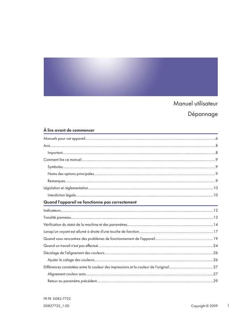 Manuel utilisateur Dépannage À lire avant de commencer Manuels pour cet appareil.............................................................................................................................................6 Avis...................................................................................................................................................................................8 Important.....................................................................................................................................................................8 Comment lire ce manuel.................................................................................................................................................9 Symboles.....................................................................................................................................................................9 Noms des options principales...................................................................................................................................9 Remarques...................................................................................................................................................................9 Législation et réglementation.......................................................................................................................................10 Interdiction légale.....................................................................................................................................................10 Quand l'appareil ne fonctionne pas correctement Indicateurs.....................................................................................................................................................................12 Tonalité panneau..........................................................................................................................................................13 Vérification du statut de la machine et des paramètres.............................................................................................14 Lorsqu'un voyant est allumé à droite d'une touche de fonction................................................................................17 Quand vous rencontrez des problèmes de fonctionnement de l'appareil...............................................................19 Quand un travail n'est pas effectué.............................................................................................................................24 Décalage de l'alignement des couleurs......................................................................................................................26 Ajuster le calage des couleurs................................................................................................................................26 Différences constatées entre la couleur des impressions et la couleur de l'original................................................27 Alignement couleur auto..........................................................................................................................................27 Retour au paramètre précédent..............................................................................................................................29 FR FR D082-7722 D0827722_1.00 Copyright © 2009 1 Problèmes lors de l'utilisation de la fonction Copieur/Serveur de documents Messages affichés lors de l'utilisation de la fonction Copieur/Serveur de documents..........................................32 S'il est impossible de réaliser des copies nettes.........................................................................................................38 Lorsque vous ne pouvez pas effectuer de copies comme vous le souhaitez...........................................................41 Message affiché lorsque la fonction Kit Duo est en cours....................................................................................47 Si la fonction Kit Duo est annulée...........................................................................................................................48 Si vous ne parvenez pas à quitter la fonction Kit Duo...........................................................................................49 Lorsque la mémoire est pleine.................................................................................................................................50 Dépannage lors de l'utilisation de la Fonction Télécopieur Réglage du volume.......................................................................................................................................................53 Messages affichés lors de l'utilisation de la fonction télécopieur.............................................................................55 Lorsque vous ne pouvez pas envoyer ou recevoir des messages fax comme souhaité.........................................64 Lorsque la mémoire est pleine.................................................................................................................................69 Si un rapport d'erreur est imprimé...............................................................................................................................71 Désactivation de l'alimentation principale/En cas de panne de courant...............................................................72 Lorsqu'une erreur se produit durant l'utilisation de la fonction Internet Fax.............................................................73 Notification de message d'erreur............................................................................................................................73 Rapport d'erreur (e-mail).........................................................................................................................................73 E-mail d'erreur gén