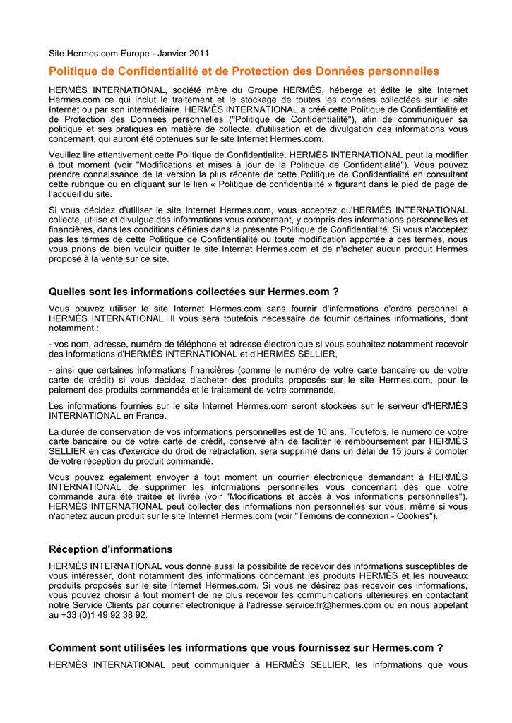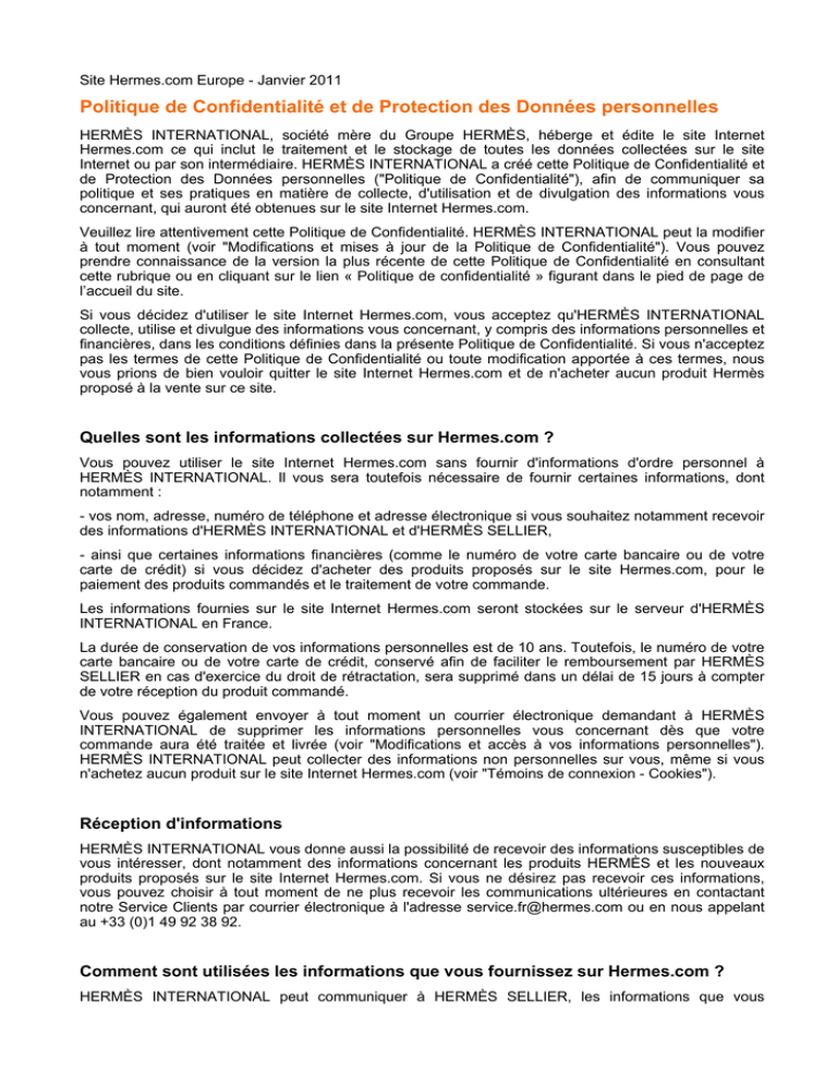 Confidentialité révisée sera mise en ligne sur le site Internet Hermes.com, avec mention de la dernière