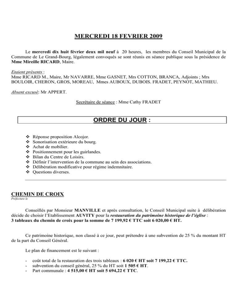 MERCREDI 18 FEVRIER 2009 Le mercredi dix huit février deux mil neuf à 20 heures, les membres du Conseil Municipal de la Commune de Le Grand-Bourg, légalement convoqués se sont réunis en séance publique sous la présidence de Mme Mireille RICARD, Maire. Etaient présents : Mme RICARD M., Maire, Mr NAVARRE, Mme GASNET, Mrs COTTON, BRANCA, Adjoints ; Mrs BOULOIR, CHERON, GROS, MOREAU, Mmes AUBOUX, DUBOIS. FRADET, PEYNOT, MATHIEU. Absent excusé: Mr APPERT. Secrétaire de séance : Mme Cathy FRADET ORDRE DU JOUR : Réponse proposition Alcojor. Sonorisation extérieure du bourg. Achat de mobilier. Positionnement pour les guirlandes. Bilan du Centre de Loisirs. Définir l’intervention de la commune au sein des associations. Délibération modificative pour régime indemnitaire. Questions diverses. CHEMIN DE CROIX Préfecture le Conseillés par Monsieur MANVILLE et après consultation, le Conseil Municipal suite à délibération décide de choisir l’Etablissement AUVITY pour la restauration du patrimoine historique de l’église : 3 tableaux du chemin de croix pour la somme de 7 199,92 € TTC soit 6 020,00 € HT. Ce patrimoine historique, non classé à ce jour, peut prétendre à une subvention de 25 % du montant HT de la part du Conseil Général. Le plan de financement est le suivant : - coût total de la restauration des trois tableaux : 6 020 € HT soit 7 199,22 € TTC. subvention du conseil général, 25 % du HT soit 1 505 € HT. Part communale : 4 515,00 € HT soit 5 694,22 € TTC. COMPLEMENT REGIME INDEMNITAIRE DES EMPLOYES COMMUNAUX Préfecture le Madame le Maire rappelle la délibération du Conseil Municipal du 24 avril 2008 concernant le régime indemnitaire des employés communaux, et demande que les critères de fondement soient complétés. Après délibération, le Conseil Municipal décide d’ajouter les critères suivants pour l’attribution de l’indemnité d’administration et de technicité (IAT), l’indemnité de missions des préfectures (IEMP), l’indemnité forfaitaire pour travaux supplémentaires (IFTS), l’indemnité spécifique de service (ISS), la prime de service et de rendement (PSR) et la prime technique de l’entretien des travaux et de l’exploitation (PTETE) : . absentéisme : les indemnités seront suspendues en cas d’absences pour tous motifs exceptés les congés annuels. . manière de servir : lorsque celle-ci est considérée insatisfaisante, les indemnités pourront être réduites de 50 %. Au préalable, l’agent sera informé de cette réduction. RECONSTRUCTION DES VESTIAIRES DU STADE Gabriel Adenis de Grand-Bourg2ème tranche DEMANDE de DOTATION GLOBALE d’EQUIPEMENT (DGE) Préfecture le Madame le Maire fait part au Conseil Municipal de Grand-Bourg que, suite à la consultation des entreprises, la nouvelle estimation de l’opération est de 220 113,00 € HT soit 263 255,15 € TTC. Donc celle-ci est en diminution par rapport à l’estimation initiale de 231 050 € HT soit 276336 € TTC. D’autre part, a fin d’optimiser les possibilités de financement, il est possible de scinder le projet en 2 tranches équivalentes, soit 110 056,50 € HT. 1ère tranche : Coût HT : 110 056,50 € TTC : 131 627,57 € - Conseil Général - FAI de la fédération française de football - Subvention DGE sollicitée 40 % - Emprunt - Part communale qui sont financés par : 8 100 € 20 000 € 44 022,60 € 30 000,00 € 29 504,97 € 2ème tranche : Coût HT : 110 056,50 € TTC : 131 627,57 € - Subvention DGE sollicitée 40 % - Emprunt - Part communale qui sont financés par : 44 022,60 € 70 000,00 € 17 604,97 € Après avoir entendu ces explications et en avoir délibéré, le Conseil Municipal : - approuve la nouvelle estimation - approuve le phasage en deux tranches - sollicité l’octroi d’une subvention au titre de la Dotation Globale d’Equipement pour la 2ème tranche - approuve le plan de financement suivant pour la deuxième tranche. - Subvention DGE à 40 % Emprunt Quote- part communale prévoit l’inscription du BP 2009-02-18 44 022,60 € 70 000,00 € 17 604,97 € Les dépenses correspondantes devraient s’effectuer au cours de 2ème semestre 2009. ADHESION COMMUNE FELLETIN au SDIC 23 Préfecture le Le Maire fait part au Conseil Municipal de la délibération n°2009-01/04 adoptée lors de la réunion du Comité Syndical du SDIC 23 en date du 14 janvier 2009 acceptant l’adhésion de la commune suivante : FELLETIN Le Conseil Municipal, après en avoir délibéré, accepte l’adhésion au SDIC 23 de la commune précitée. ACHAT DE MOBILIER POUR L’ECOLE Préfecture le Madame le Maire présente au conseil municipal les différents besoins en mobilier pour l’école : Meuble informatique, chevalet maternelle, meuble album pour un montant de 877,86 € TTC Draps et bavoirs pour un montant de 249,97 € TTC Total de la commande auprès de la CAMIF : 1127,83 € TTC. Mobilier d’éveil pour la salle de motricité pour un montant de 413,90 € TTC auprès des Ets NATHAN. Le Conseil donne son accord pour ces acquisitions, charge le Maire de passer les commandes et décide d’inscrire la dépense de 877,86 € TTC de la Camif et de 413,90 € TTC des Ets Nathan, en section d’investissement de BP 2009 sur le programme 073 « acquisitions diverses ». ACHAT DE MOBILIER POUR L’ESPACE SPORTS ET LOISIRS, CONSERVATOIRE MUSIQUE ET SALLE MULTI SERVICES Préfecture le Mme le Maire présente les besoins en matériel supplémentaire pour équiper l’Espace Sports et Loisirs en fonction de la demande des utilisateurs. Afin de continuer l’équipement mobilier avec les mêmes modèles, les Ets Souvignet ayant fourni le matériel existant ont présenté les devis suivants : - 9 tables pour un montant de 40 chaises pour un montant de Chariot pour ranger les chaises pour un montant de Diables pour un montant de Soit une dépense de 1 205,57 € 1 193,61 € 251,18 € 231,67 €. 2 882,03 € TTC. Pour compléter l