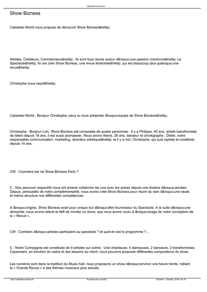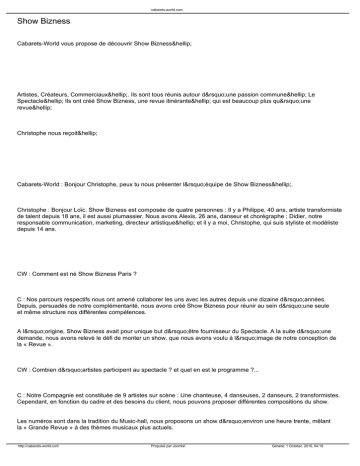 cabarets-world.com Show Bizness Cabarets-World vous propose de découvrir Show Bizness… Artistes, Créateurs, Commerciaux…. Ils sont tous réunis autour d’une passion commune… Le Spectacle… Ils ont créé Show Bizness, une revue itinérante… qui est beaucoup plus qu’une revue… Christophe nous reçoit… Cabarets-World : Bonjour Christophe, peux tu nous présenter l’équipe de Show Bizness…. Christophe : Bonjour Loïc. Show Bizness est composée de quatre personnes : Il y a Philippe, 40 ans, artiste transformiste de talent depuis 18 ans, il est aussi plumassier. Nous avons Alexis, 26 ans, danseur et chorégraphe ; Didier, notre responsable communication, marketing, directeur artistique… et il y a moi, Christophe, qui suis styliste et modéliste depuis 14 ans. CW : Comment est né Show Bizness Paris ? C : Nos parcours respectifs nous ont amené collaborer les uns avec les autres depuis une dizaine d’années. Depuis, persuadés de notre complémentarité, nous avons créé Show Bizness pour réunir au sein d’une seule et même structure nos différentes compétences. A l’origine, Show Bizness avait pour unique but d’être fournisseur du Spectacle. A la suite d’une demande, nous avons relevé le défi de monter un show, que nous avons voulu à l’image de notre conception de la « Revue ». CW : Combien d’artistes participent au spectacle ? et quel en est le programme ?... C : Notre Compagnie est constituée de 9 artistes sur scène : Une chanteuse, 4 danseuses, 2 danseurs, 2 transformistes. Cependant, en fonction du cadre et des besoins du client, nous pouvons proposer différentes compositions du show. Les numéros sont dans la tradition du Music-hall, nous proposons un show d’environ une heure trente, mêlant la « Grande Revue » à des thèmes musicaux plus actuels. http://cabarets-world.com Propulsé par Joomla! Généré: 1 October, 2016, 04:19 cabarets-world.com Le spectacle est conçu pour tout public et toute génération. Glamour, plumes, humour, sexy, participation du public… CW : qui met en scène et chorégraphie le spectacle ?... C : Pour nous, il est évident qu’un spectacle ne se monte pas seul, et c’est donc tous ensemble que nous avons créé Show Bizness « La Revue ». Alexis a monté et chorégraphié la majeure partie des tableaux, Anne-Sophie (les Pro-Phyl) a chorégraphié le tableau « One », tiré de « Chorus line », et pour nos solos nous laissons la personnalité de chacun s’exprimer. CW : Depuis combien de temps existe cette compagnie ? C : La Compagnie a vu le jour juste un an après le début de l’aventure Show Bizness. Nous avons présenté notre premier gala en juin 2009. CW : Où vous produisez-vous ? C : Etant également concepteurs d’évènements, nous privilégions des sites de prestiges ou originaux pour présenter nos galas. A la demande d’un client, nous avons par exemple transformé la base Sous-marine de Bordeaux en un véritable cabaret le temps d’une soirée. CW : Quelle est l’actualité de la Compagnie ? C : Nous sommes actuellement en train de créer de nouveaux numéros, et réfléchissons à un spectacle pour enfants…de 7 à 77 ans ! http://cabarets-world.com Propulsé par Joomla! Généré: 1 October, 2016, 04:19 cabarets-world.com http://cabarets-world.com Propulsé par Joomla! Généré: 1 October, 2016, 04:19 cabarets-world.com http://cabarets-world.com Propulsé par Joomla! Généré: 1 October, 2016, 04:19 cabarets-world.com http://cabarets-world.com Propulsé par Joomla! Généré: 1 October, 2016, 04:19 cabarets-world.com CW : Tu m’as dis que Show Bizness a été créé en avril 2008 et qu’à l’origine c’était surtout un fournisseur pour le spectacle. Comment en êtes-vous venus à créer cette association ? C : Au fur et à mesure de nos collaborations à divers spectacles, travaillant régulièrement ensemble dans un même esprit, et ayant des conceptions communes des métiers de la scène, notre association s’est imposée comme une évidence ! Nous unissons nos idées, nos connaissances et nos savoir-faire. CW : Vous disposez d’un atelier de Couture. Combien de personnes travaillent dans cet atelier ? C : Nous sommes deux en permanence à l’atelier : Philippe pour les plumes et mois pour la couture et les maquettes. Mais face à de grosses commandes, l’équipe peut s’étoffer ponctuellement. CW : Pour qui travaillez-vous ? Qui peut solliciter vos services ? C : Nous avons des clients très divers ! Des artistes indépendants, des petites formations ou encore des cabarets de province prestigieux, pour des tableaux complets… Nous avons travaillé pour des Compagnie de danse, de Music-hall, des chanteurs/chanteuses, transformistes/Dragqueens, magiciens… La liste est longue ! Le Théâtre, le Cinéma et la Mode font parfois aussi appel à nos services. On nous appelle pour une pièce, un costume ou un accessoire en plumes, ou encore pour travailler à l’ensemble http://cabarets-world.com Propulsé par Joomla! Généré: 1 October, 2016, 04:19 cabarets-world.com des costumes d’une revue, comme c est le cas depuis plus de 10 ans avec la troupe des Magics, à Lille (http://lesmagics.skyrock.com). Nous travaillons aussi pour des marques, pour des lancements de produits, évènementiels… CW : Quelle est la plus belle pièce que vous avez réalisée ? C : Une de nos grandes fiertés est notre participation à la grande illusion du duo de magie « les PRO-PHYL », champion de France de Magie 2007, www.pro-phyl.com . Ils nous ont confié le soin de créer les costumes de « Biosphère », leur dernier numéro : un univers onirique autour de l’Esprit de la Nature… Un énorme travail mais un résultat saisissant ! La collaboration avec un sculpteur pour des prothèses en mousse de latex enrichi encore nos créations. CW : L’actualité de l’atelier de Couture ? En parallèle avec de nouvelles créations pour Show Bizness, « La Revue », nous travaillo
