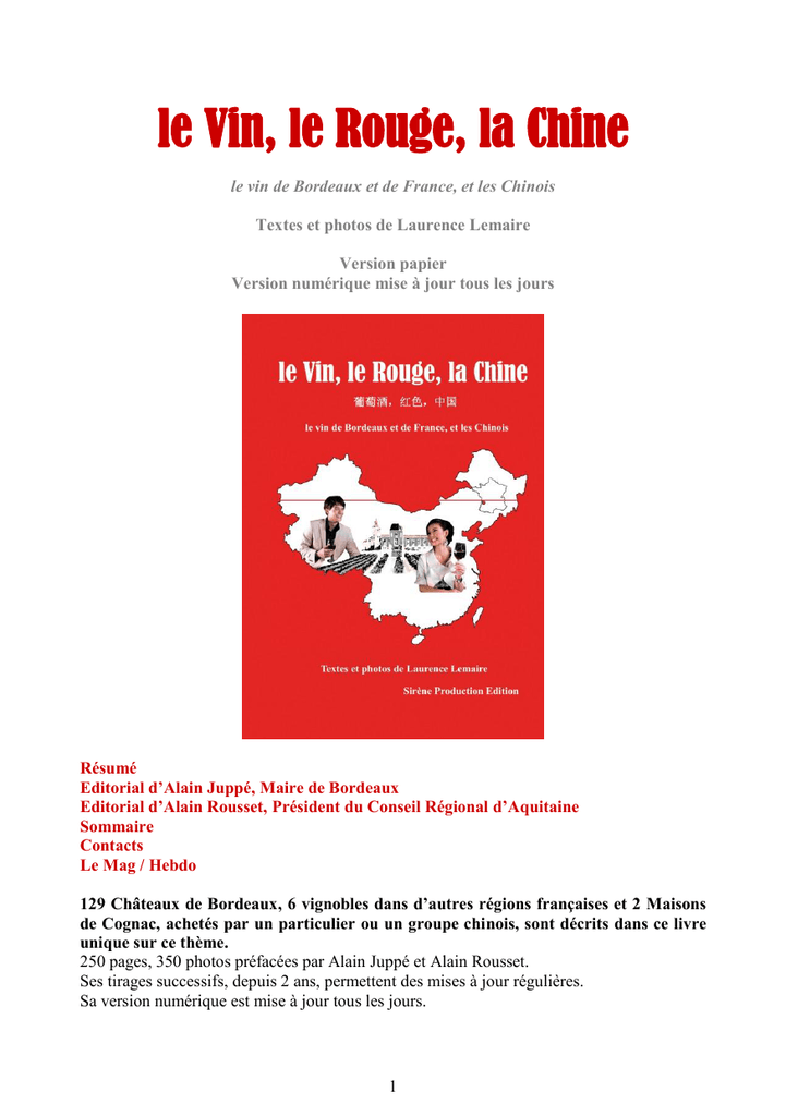 le Vin, le Rouge, la Chine le vin de Bordeaux et de France, et les Chinois Textes et photos de Laurence Lemaire Version papier Version numérique mise à jour tous les jours Résumé Editorial d’Alain Juppé, Maire de Bordeaux Editorial d’Alain Rousset, Président du Conseil Régional d’Aquitaine Sommaire Contacts Le Mag / Hebdo 129 Châteaux de Bordeaux, 6 vignobles dans d’autres régions françaises et 2 Maisons de Cognac, achetés par un particulier ou un groupe chinois, sont décrits dans ce livre unique sur ce thème. 250 pages, 350 photos préfacées par Alain Juppé et Alain Rousset. Ses tirages successifs, depuis 2 ans, permettent des mises à jour régulières. Sa version numérique est mise à jour tous les jours. 1 Ces propriétaires sont actionnaires majoritaires, dirigeants de multinationales, particuliers milliardaires ; ils ont le goût du vin et des affaires. Les Chinois investissent dans le présent avec le futur en point de mire. Pourquoi ces vignobles sont-ils en vente ? Pourquoi les achètent-ils ? Quelles sont leurs obligations ? Quelles sont leurs attentes ? Réussissent-ils ? Pourquoi cette fascination ? Et pour combien de temps ? La cuisine chinoise peut-elle s’associer au vin rouge français ? Le terroir est-il la chance de son vin ? Est-il inimitable ? Red, Wine and China Bordeaux and French wines, and the Chinese. The owners of 137 châteaux in France are majority shareholders and directors of multinationals, private billionaires… All have a taste for business and for wine and share an insatiable thirst for knowledge. Today, the Chinese are investing in the present with their eyes on the future. Why are these vineyards for sale and why do they buy them? What are their obligations? What are their expectations? Will they succeed? Can Chinese cooking really be paired with the red wine? Is the quality of the ‘terroir’ the secret of French wine? Is it inimitable? 129 Bordeaux Châteaux, 6 vineyards in other places in France and 2 Maisons of cognac, owned by Chinese individuals or groups are described in this book, unique in the field. 250 pages, 350 photos are foreword by the Mayor of Bordeaux, Alain Juppé (former Prime Minister) and Alain Rousset (president of the Aquitaine region). Après 20 ans à la télévision à Paris, entre ses missions de photos aériennes et industrielles, Laurence Lemaire a écrit deux ouvrages sur Marseille. Partie seule en Chine pendant 8 mois, son 3ème livre parle des Français installés là-bas. A Bordeaux, elle expose ses photos et présente son 4ème ouvrage. After twenty years in television in Paris, between industrial and aerial photo assignments, Laurence Lemaire wrote two books about Marseilles. Heading off alone to China for eight months, she wrote a third, about the French who have settled there. Now back in Bordeaux, she is exhibiting her photos and presenting her 4th work. http://www.levinlerougelachine.com pour lire, to read some chapters in French, English and Chinese 2 Editorial du Maire de Bordeaux Alain Juppé ancien Premier Ministre « L’histoire de Bordeaux est indéfectiblement liée à celle du vin. Depuis deux mille ans, le vignoble a dessiné la cité et sculpté les paysages du Bordelais. Aujourd’hui Bordeaux est au centre du plus grand vignoble de vins fins du monde : 117 000 hectares, environ 7 400 châteaux, 300 maisons de négoce et 60 appellations d’origine contrôlée. La Chine, quant à elle, en est aux prémices de son histoire avec le vin. De plus en plus de consommateurs chinois découvrent le vin français et en tombent amoureux. La Chine a pris la place de 1er marché des vins de Bordeaux à l’export. Plus de 90 propriétés bordelaises ont été acquises par des investisseurs chinois ces 3 dernières années. Au-delà de ces relations commerciales se nouent également des relations amicales. C‘est ainsi que les liens entre Bordeaux et la Chine se sont concrétisés par un jumelage avec Wuhan en 1998, portant sur des partenariats économiques, éducatifs, et surtout culturels. Le superbe livre d’entretiens « Le vin, le Rouge, la Chine » de Laurence Lemaire se veut une référence pour ce qui a trait à notre terroir incomparable, les cépages, les traditions, les métiers du vin… Car le vin de Bordeaux demande quelques égards. Il est d’abord le produit d’une rencontre miraculeuse entre des hommes, une terre et les deux fleuves qui la traversent. Mais ces éléments conjugués ne suffisaient pas à produire un vin comme celui de Bordeaux : pour cela, il a fallu la patience, la persévérance et la passion de nombreuses générations de viticulteurs, qui ont su apprivoiser ce que la nature leur offrait. Le vin de Bordeaux est le fruit d’une civilisation et d’une culture spécifique à notre région que nous sommes fiers de faire découvrir, grâce à Laurence Lemaire, aux amateurs de l’Empire du Milieu. » 3 Editorial du Président du Conseil Régional d’Aquitaine Alain Rousset « La Chine est-elle le nouvel Eldorado pour notre gastronomie et nos vins ? J’en suis persuadé, c’est pourquoi la Région Aquitaine, qui soutient fortement depuis de nombreuses années l’internationalisation des entreprises, a créé une marque commune avec la Région Midi-Pyrénées : ‘’Sud-Ouest France’’. Le développement de cette marque, qui a pour vocation la promotion des produits de qualité de nos régions, vise bien entendu la France mais cible également la Chine. C’est ainsi que deux grandes sociétés chinoises ont décidé d’investir dans le concept des ‘’Maisons Sud-Ouest France’’ dans les provinces du Hunan et du Sichuan. Ces établissements, véritables show-room des productions agroalimentaires du Sud-Ouest, proposent évidemment une large gamme de vins de Bordeaux. Ces vitrines commerciales sont implantées dans de grandes métropoles de plus de 10 millions d’habitants : Wuhan et Chengdu. Cette forte présence dans des provinces moins 