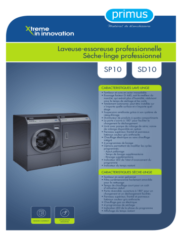 Laveuse-essoreuse professionnelle Sèche-linge professionnel SP10 SD10 CARACTERISTIQUES LAVE-LINGE • Tambour et cuve en acier inoxydable • Essorage facteur G 440, soit le meilleur du marché, qui extrait plus d‘humidité, réduisant ainsi le temps de séchage et les coûts • Totalement autonome: peut être installée sur n’importe quelle surface et n’importe quel étage • Suspension améliorée grâce à son système de rééquilibrage • Distributeur de produits à quatre compartiments • La porte s’ouvre à 180° pour faciliter le chargement le déchargement • Livré avec pompe de vidange de série; vanne de vidange disponible en option • Panneau supérieur, frontal et panneaux latéraux couleur gris anthracite • Chauffage électrique ou sans chauffage intégré • 6 programmes de lavage • Options permettant de modifier les cycles programmés - Ajout prélavage - Temps de lavage supplémentaire - Rinçage supplémentaire • Indicateur LED de l‘état d‘avancement du programme • Indicateur du temps restant CARACTERISTIQUES SÈCHE-LINGE • Tambour en acier galvanisé • Filtre surdimensionné facilement amovible pour le nettoyage • Temps de chauffage court pour un coût d‘utilisation réduit • Porte réversible: ouverture à 180° pour un chargement et un déchargement facilités • Panneau supérieur, frontal et panneaux latéraux couleur gris anthracite • Chauffage gaz ou électrique • 4 programmes de séchage • Indication LED de la phase du programme • Affichage du temps restant DESIGN COMPACT UTILISATION INTUITIVE SP10 TYPE kg I 10 96,8 kg l kW tr/min 0,67 1200 440 1x220-240V 50Hz 3x220-240V 50Hz 3×380-415V+N 50 Hz 4,8 CAPACITÉ VOLUME DU TAMBOUR CONNECTION ELECTRIQUE 10 198 1x220-240V 50/60Hz 3x220-240V 50Hz 3×380-415V+N 50 Hz CHAUFFAGE ELECTRIQUE CHAUFFAGE AU GAZ PUISSANCE MOTEUR DIMENSIONS H xL xP DONNEES DE TRANSPORT Poids brut Poids net Volume (emballé) Dimensions (emballé) H xL xP kW 5,2 (230V) 5,3 (400V) kW kW 7,3 0,25 mm 1027×683×711 kg kg m3 73 68 0,71 mm 1156×737×832 TYPE CAPACITÉ VOLUME DU TAMBOUR MOTEUR Variateur de fréquence VITESSE DE ROTATION FACTEUR G CONNECTION ELECTRIQUE CHAUFFAGE ELECTRIQUE VIDANGE Pompe Vanne de vidange DIMENSIONS H xL xP DONNEES DE TRANSPORT Poids brut Poids net Volume (emballé) Dimensions (emballé) HxL xP Façade SP10 kW standard option mm 1027×683×704 kg kg m3 mm 122 113 0,71 1156×737×832 SD10 Côté SP10 Côté SD10 Arrière SD10 11 - 2015 / 548460 Façade SD10 Arrière SP10 La société Alliance Laundry Systems se réserve le droit de modifier à tout moment et sans avis préalable des données et des caractéristiques des machines reprises dans ce catalogue. Les détails et photos ne sont donnés qu’à titre indicatif et sans engagement de notre part. www.primuslaundry.com - www.primuslaundry.fr