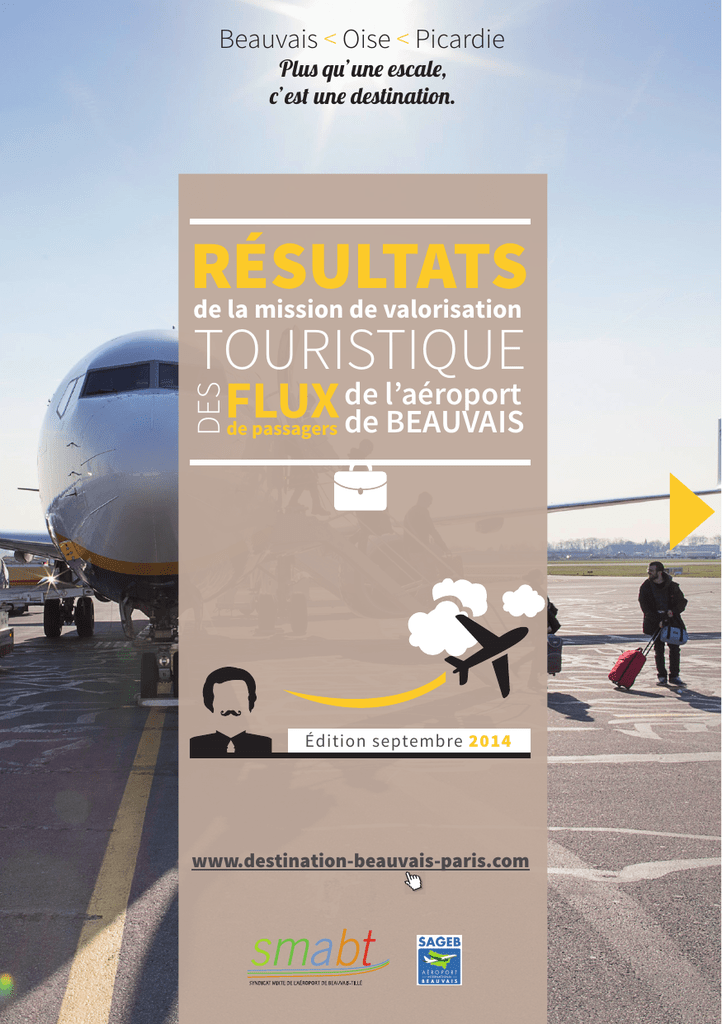 Beauvais < Oise < Picardie Plus qu’une escale, c’est une destination. RÉSULTATS de la mission de valorisation TOURISTIQUE DES l’aéroport FLUX de de BEAUVAIS de passagers Édition septembre 2014 www.destination-beauvais-paris.com PRÉSENTATION DE LA MISSION de valorisation des flux de passagers 4 © SAGEB Avec près de millions de passagers en 2013, dont 46,8% de visiteurs et 51,6% de résidents, l’aéroport de BeauvaisTillé, propriété du Syndicat mixte de l’aéroport de Beauvais-Tillé, composé du Conseil régional de Picardie, du Conseil général de l’Oise et de la Communauté d’agglomération du Beauvaisis constitue un potentiel de développement pour l’économie touristique du territoire Beauvais < Oise < Picardie. Le SMABT et la SAGEB, exploitant de l’aéroport, ont mandaté les trois opérateurs de tourisme, Oise Tourisme (coordinateur de la mission), le Comité Régional du Tourisme de Picardie et l’Office de Tourisme de l’Agglomération de Beauvais dans le cadre d’une mission triennale (2012-2014) pour mettre en œuvre un plan d’actions pour la valorisation touristique des flux de passagers de l’aéroport de Beauvais-Tillé. Ces actions s’effectuent sous l’entité « Beauvais < Oise < Picardie ». Les axes stratégiques de cette mission de valorisation touristique de l’aéroport sont les suivants : 1. I nformer les passagers sur la destination avec la présence d’un point information tourisme et de la documentation touristique adaptée éduire et promouvoir les 2. S passagers européens et français aux attraits de la destination Beauvais < Oise < Picardie avec notamment des actions de prospection 2 endre la destination avec 3. V des prestations touristiques et des produits du terroir au Point Information Tourisme et sur le site de la destination www.destination-beauvais-paris.com idéliser les passagers en créant 4. F une communauté d’internautes et en définissant les profils des passagers pour orienter et évaluer les actions à la fin de la mission édérer les acteurs du tourisme 5. F pour améliorer les prestations touristiques et créer un club des acteurs © SAGEB © Oise Tourisme © JF Bouche © SAGEB La mission de prospection et d’enquête a permis de réaliser plus enquêtes auprès de des passagers de l’aéroport sur la période 2012-2014. Cette mission est essentielle à la bonne mise en œuvre du plan d’actions global car elle permet d’une part de promouvoir et de valoriser la destination Beauvais < Oise < Picardie et d’autre part, de mesurer et d’évaluer nos actions. Il s’agit d’enquêtes par questionnaires administrées en face à face, en salle d’embarquement ou en zone publique, auprès des passagers de l’aéroport. L’évolution du mode opératoire des enquêtes travaillée en collaboration avec le BIPE, cabinet de conseil en analyse stratégique et prospective économique, ainsi que la présence d’une équipe de prospection tout au long de l’année nous permettent d’avoir une bonne représentativité de l’échantillon. 29 000 Glossaire Passager : passager aérien utilisant l’aéroport de Beauvais au départ ou à l’arrivée de leur vol avec une compagnie aérienne opérant sur l’aéroport. Passager Visiteur : passager utilisant l’aéroport de Beauvais comme destination, par exemple un habitant de Rome venant visiter Paris via un vol Rome-Beauvais. Passager Résident : passager utilisant l’aéroport de Beauvais pour sortir de la zone de chalandise, par exemple un habitant de Paris partant en vacances en Corse via un vol Beauvais-Figari. Passager Résident Picard : passager déclarant habiter en Picardie et utilisant l’aéroport de Beauvais pour sortir de la zone de chalandise, par exemple un habitant de l’Oise partant en vacances en Espagne via un vol Beauvais-Barcelone. Passager affaires visiteur : passager visiteur utilisant l’aéroport de Beauvais comme destination ayant pour motif de déplacement principal le voyage affaires. Repeater : passager voyageant plus d’une fois au cours de l’année via l’aéroport de Beauvais. 3 Le passager visiteur TOP 3 DES NATIONALITÉS 30 % Italie 15 % Espagne 9 % Royaume-Uni / Irlande Définition Passager Visiteur : passager utilisant l’aéroport de Beauvais comme destination, par exemple un habitant de Rome venant visiter Paris via un vol Rome-Beauvais. Le séjour en France 67 % des passagers visiteurs sont déjà venus en France au cours d’un précédent voyage 1 2 Plus d’ passager sur réserve son hébergement par internet 10 % connaissent la destination Beauvais < Oise < Picardie Parmi eux, considèrent comme une destination touristique. 4 I 62 % des visiteurs voyagent pour un motif de loisirs 51 % Le passager visiteur et la destination Beauvais < Oise < Picardie 60 % la 27 % utilisent l’aéroport de Beauvais a minima une fois par an BEAUVAIS < OISE < PICARDIE Zoom sur les dépenses du passager visiteur consommant la destination Beauvais < Oise < Picardie Les dépenses des passagers visiteurs sur la destination s’élèvent à en 2012. Sur un panier moyen global de sur le territoire, sont consommés sur la 130 € destination. d’euros 12 millions 353 € 130 € ZOOM SUR Le passager visiteur italien* *résidant en Italie Profil socio démographique 57 % ont moins de 36 ans 70 % d’actifs dont 24 % cadres voyagent en couple à % seuls à 30 37 %, Le séjour en France 70 % sont déjà venus en France MOTIF DE DÉPLACEMENT 68 % 11 % Tourisme Voyage d’affaires ZOOM SUR L’HÉBERGEMENT 74 % en hébergement marchand dont 82 % en hôtels et 10 % en location de meublés et gîtes MOYENS DE RÉSERVATION 59 % via internet 8 % via une agence de voyage Le séjour sur la destination Beauvais < Oise < Picardie BUDGET Budget global du séjour en France 381 € par personne dont Budget sur la destination 169 € par personne > Sur la destination, le budget est en premier lieu destiné à l’hébergement, le transport et la re