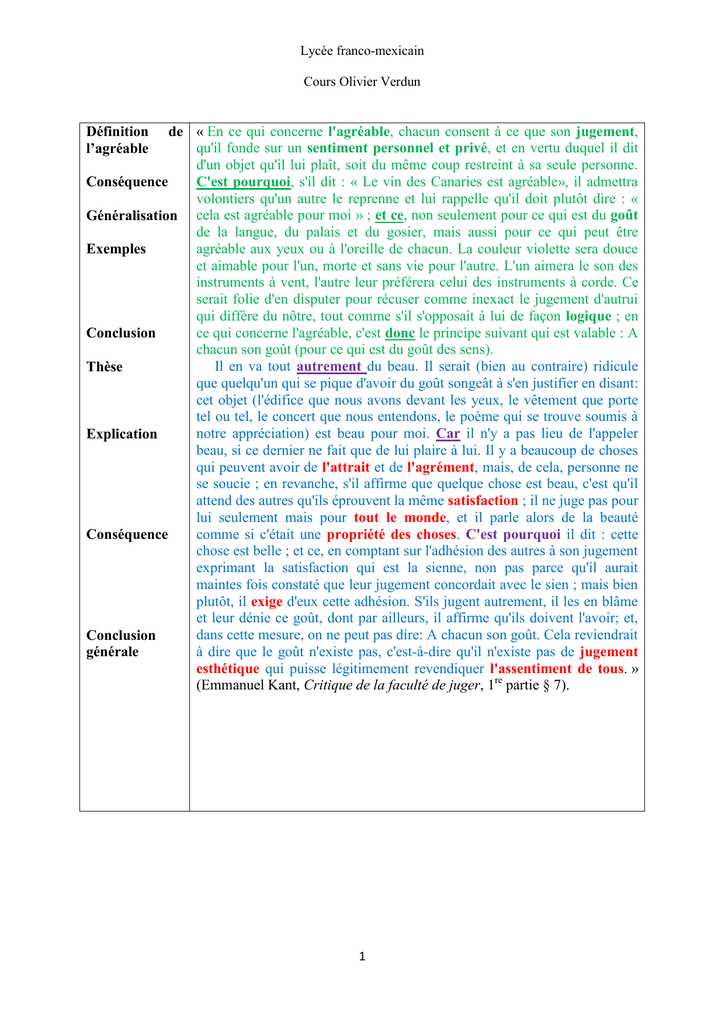 Lycée franco-mexicain Cours Olivier Verdun de « En ce qui concerne l'agréable, chacun consent à ce que son jugement, qu'il fonde sur un sentiment personnel et privé, et en vertu duquel il dit d'un objet qu'il lui plaît, soit du même coup restreint à sa seule personne. C'est pourquoi, s'il dit : « Le vin des Canaries est agréable», il admettra Conséquence volontiers qu'un autre le reprenne et lui rappelle qu'il doit plutôt dire : « Généralisation cela est agréable pour moi » ; et ce, non seulement pour ce qui est du goût de la langue, du palais et du gosier, mais aussi pour ce qui peut être agréable aux yeux ou à l'oreille de chacun. La couleur violette sera douce Exemples et aimable pour l'un, morte et sans vie pour l'autre. L'un aimera le son des instruments à vent, l'autre leur préférera celui des instruments à corde. Ce serait folie d'en disputer pour récuser comme inexact le jugement d'autrui qui diffère du nôtre, tout comme s'il s'opposait à lui de façon logique ; en ce qui concerne l'agréable, c'est donc le principe suivant qui est valable : A Conclusion chacun son goût (pour ce qui est du goût des sens). Il en va tout autrement du beau. Il serait (bien au contraire) ridicule Thèse que quelqu'un qui se pique d'avoir du goût songeât à s'en justifier en disant: cet objet (l'édifice que nous avons devant les yeux, le vêtement que porte tel ou tel, le concert que nous entendons, le poème qui se trouve soumis à notre appréciation) est beau pour moi. Car il n'y a pas lieu de l'appeler Explication beau, si ce dernier ne fait que de lui plaire à lui. Il y a beaucoup de choses qui peuvent avoir de l'attrait et de l'agrément, mais, de cela, personne ne se soucie ; en revanche, s'il affirme que quelque chose est beau, c'est qu'il attend des autres qu'ils éprouvent la même satisfaction ; il ne juge pas pour lui seulement mais pour tout le monde, et il parle alors de la beauté comme si c'était une propriété des choses. C'est pourquoi il dit : cette Conséquence chose est belle ; et ce, en comptant sur l'adhésion des autres à son jugement exprimant la satisfaction qui est la sienne, non pas parce qu'il aurait maintes fois constaté que leur jugement concordait avec le sien ; mais bien plutôt, il exige d'eux cette adhésion. S'ils jugent autrement, il les en blâme et leur dénie ce goût, dont par ailleurs, il affirme qu'ils doivent l'avoir; et, dans cette mesure, on ne peut pas dire: A chacun son goût. Cela reviendrait Conclusion à dire que le goût n'existe pas, c'est-à-dire qu'il n'existe pas de jugement générale esthétique qui puisse légitimement revendiquer l'assentiment de tous. » (Emmanuel Kant, Critique de la faculté de juger, 1re partie § 7). Définition l’agréable 1 Lycée franco-mexicain Cours Olivier Verdun 1ère partie : travail de préparation 1) Lecture active Il faut d'abord s'attacher à lire le texte attentivement en prêtant attention aux mots de liaison (« mais, pourtant, néanmoins, toutefois... »), dont on spécifie, dans la marge, le rôle logique (énoncé d'une thèse, justification par un exemple, description, déduction, etc.), afin de repérer la construction du texte et les différentes étapes de l'argumentation de l'auteur (les parties...). N'hésitez pas à souligner les mots et les expressions essentielles, repérer les exemples contenus dans le texte afin de les expliquer soigneusement par la suite. Méfiez-vous des textes en apparence simples car en réalité ils contiennent souvent des pièges redoutables générateurs de contresens. 2) Étude conceptuelle L'agréable : ce qui plaît aux sens dans la sensation, ce qui donne du plaisir. Goût : expression des préférences individuelles ; sens grâce auquel nous percevons les saveurs ; pouvoir de porter des jugements d’appréciation sur le beau, faculté d’apprécier la valeur esthétique des choses. Attrait : qualité de ce qui attire agréablement, charme, séduit. Agrément : qualité d’une chose qui la rend agréable ; attrait, charme. Satisfaction : ce qui procure du plaisir, ce qui plaît. Jugement esthétique : jugement de beau par lequel nous exprimons notre manière d’être sensible à quelque chose qui apparaît tant à nos sens qu’à notre esprit ; le jugement esthétique exprime la valeur subjective d’une représentation, c’est-à-dire le sentiment qu’elle provoque dans le sujet. Repère : universel/général/particulier/singulier ; « objectif/subjectif » 3) Plan détaillé du texte I) L’agréable (« En ce qui concerne l'agréable… pour ce qui est du goût des sens ») Idée directrice : l’agréable est singulier et subjectif. A) Thèse : l’agréable est un jugement purement subjectif (« En ce qui concerne l'agréable…sa seule personne ») B) Conséquence : il est donc tout à fait acceptable que quelqu’un d’autre n’aime pas ce que j’aime. On accepte alors que quelqu’un d’autre n’aime pas ce vin. De même pour les autres sens (« C'est pourquoi… instruments à corde») C) Conclusion : on ne dispute pas de l’agréable (« Ce serait folie…pour ce qui est du goût des sens ») II) Le beau (« Il en va tout autrement du beau… l'assentiment de tous ») Idée directrice : le beau est universel. 2 Lycée franco-mexicain Cours Olivier Verdun A) Thèse : la confusion du beau et de l’agréable (« Il en va tout autrement du beau… beau pour moi ») B) Explication : le beau ne se confond pas avec l’agréable et ne relève pas d’une appréciation purement subjective (« Car il n'y a pas lieu de l'appeler beau…propriété des choses ») C) Conséquence : le jugement de beau exige l’adhésion d’autrui (« C'est pourquoi… il affirme qu'ils doivent l'avoir ») D) Conclusion générale : la formule « à chacun son goût » rend impossible le jugement esthétique (« et, dans cette mesure…l'assentiment de tous ») 4) Thème et thèse a. Thème : la distinction du beau et de l’ag