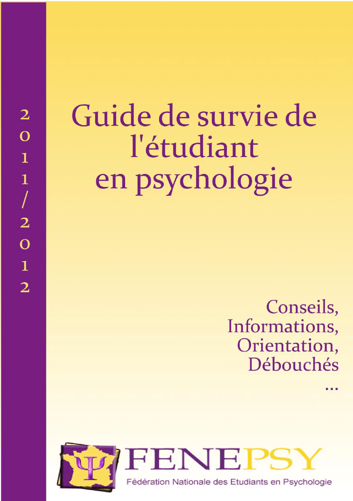 Avant-propos 1 Nous avons observé que les étudiants en psychologie rencontraient de nombreux problèmes tant au niveau des études qu’au quotidien. Notre association a pour objet de former, orienter et aider les étudiants ou futurs étudiants en psychologie. Par ce moyen de diffusion nous avons voulu regrouper les conseils sur la pédagogie, les débouchés et l’insertion professionnelle. Les différents témoignages que tu vas lire, soulignent que la psychologie est transversale et pluridisciplinaire. C'est aussi une filière de compréhension, de découverte et de tolérance. Tu vas étudier des matières scientifiques comme la neuropsychologie, des statistiques et un renforcement en anglais pour t’apprendre à être rigoureux et méthodique. La lecture est aussi très importante dans notre filière pour connaitre toutes les théories et pour pouvoir s'y appuyer. Nous sommes aussi confrontés à de nombreux clichés sur la profession du psychologue, ce guide peut aider à y voir plus clair. Pour devenir psychologue, il te faut un bac+5 (master mention psychologie) et avoir effectué 500h de stage pour obtenir le titre de psychologue et pouvoir exercer. Il existe plusieurs branches en psychologie. A la fin de ton cursus tu sauras faire passer des tests et des entretiens. Ce guide fonctionne sous forme d’agenda pour te permettre de te repérer et pour t’en servir au quotidien et gratuitement. Tu trouveras ce guide sur nos espaces de communication et dans ton association étudiante en libre-service. Bonne lecture ! PINAUD Carol-ann Présidente de la FENEPSY Remerciements : Nous remercions particulièrement les rédacteurs et le comité de relecture. Ainsi que les associations locales, nos partenaires, les associations de professionnelles, et tous les étudiants qui ont témoigné de leurs parcours, sans qui ce guide n’aurait pas existé. 2 Index 1- Les pages informations : Présentation de la FENEPSY…………………………………………...4 Les formations en psychologie…………………………………………6 Emploi du temps………………………………………………………..9 Actualités de la psychologie…………………………………………..10 Le monde professionnel……………………………………………….32 2- Agenda 2011-2012 : Septembre……………………….12 Octobre………………………….14 Novembre……………………….16 Décembre……………………….18 Janvier…………………………..20 Février…………………………..22 Mars…………………………….24 Avril…………………………….26 Mai……………………………..28 Juin……………………………..30 3- Les pages conseils : La rentrée en fac de psycho………..13 Livres et revues……………………15 Stage et mémoire…………………..17 Les examens……….......................19 Le milieu associatif………………..21 L’enseignement supérieur…………23 L’orientation…………..…………..25 Les différents « psys »… …………27 Les débouchés……………………..29 Insertion professionnelle…………..31 . 4- Témoignages d’étudiants : A l’université Blaise Pascal…………………………………………...36 A l’université Bordeaux Segalen……………………………………...38 A l’université de Bourgogne…………………………………………..40 A l’université de Caen………………………………………………...42 A l’université catholique de l’ouest…………………………………...44 A l’université François Rabelais………………………………………46 A l’université Lumière Lyon II………………………………………..50 A l’université Toulouse II……………………………………………..51 A l’université Nancy II………………………………………………..54 A l’université Paris Descartes…………………………………………56 A l’université Picardie Jules Verne……………………………………58 A l’université Rennes II………………………………………….……60 4 Présentation de la FENEPSY La Fédération nationale des étudiants en psychologie (FE.N.E.PSY), créée le 16 mars 2002 et régie par la loi de 1901, rassemble les associations d'étudiants en psychologie et constitue le seul organe représentatif des étudiants en psychologie de France. La FE.N.E.PSY œuvre pour l'amélioration de la psychologie universitaire et les conditions de vie des étudiants en psychologie. 1- Historique Les associations fondatrices sont : -ADEPSY de Paris 5, -APSYS de Clermont-Ferrand, -BDE des psychologues praticiens de Lyon, -ELYPSY de Lyon 2, -ETOUPSY de Toulouse 2, -PSAC de Dijon. 2- Les objectifs - Fédérer et représenter les étudiants en psychologie, et défendre leurs droits et intérêts matériels et moraux, tant collectifs qu'individuels auprès des pouvoirs publics et des instances universitaires. - Viser à l'unité de la discipline (entre les étudiants, les enseignantschercheurs, et les praticiens). - Veiller à respecter les principes éthiques et moraux de la discipline. - Faciliter l'évaluation de la formation à un niveau national et favoriser l'insertion professionnelle. - Créer un réseau entre les étudiants en psychologie et favoriser une entente entre les différentes universités proposant une formation en psychologie. -Soutenir et coordonner les associations d'étudiants en psychologie ainsi que d'aider à la création d'associations. - Promouvoir la filière de la psychologie par l'information et la communication. 3- Les actions - Réunir les associations selon un rythme bimestriel - Former les associatifs et les élus étudiants - Rencontrer régulièrement les représentants de la profession - Rencontrer les représentants du Ministère de l'Educa