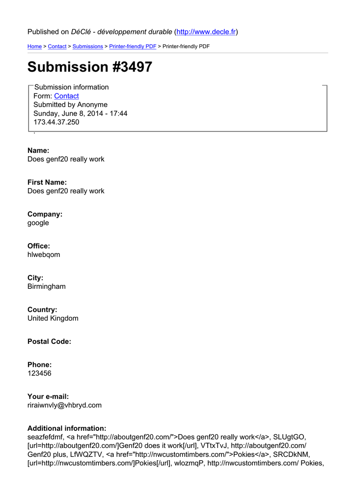 Published on DéClé - développement durable (http://www.decle.fr) Home > Contact > Submissions > Printer-friendly PDF > Printer-friendly PDF Submission #3497 Submission information Form: Contact Submitted by Anonyme Sunday, June 8, 2014 - 17:44 173.44.37.250 . Name: Does genf20 really work First Name: Does genf20 really work Company: google Office: hlwebqom City: Birmingham Country: United Kingdom Postal Code: Phone: 123456 Your e-mail: [email protected] Additional information: seazfefdmf, <a href="http://aboutgenf20.com/">Does genf20 really work</a>, SLUgtGO, [url=http://aboutgenf20.com/]Genf20 does it work[/url], VTtxTvJ, http://aboutgenf20.com/ Genf20 plus, LfWQZTV, <a href="http://nwcustomtimbers.com/">Pokies</a>, SRCDkNM, [url=http://nwcustomtimbers.com/]Pokies[/url], wlozmqP, http://nwcustomtimbers.com/ Pokies, KJnMLUY, <a href="http://www.thyroidmanager.org/">Trisenox and cialis interactions</a>, rauvoZt, [url=http://www.thyroidmanager.org/]Cialis[/url], uYnaIZB, http://www.thyroidmanager.org/ Cialis professional, tSpnSdU, <a href="http://illinoisrunner.com/">Tramadol forum</a>, zrXmyii, [url=http://illinoisrunner.com/]Tramacet 375 mg tramadol hydrochloride325 mg acetaminophen t[/url], hCFQpUo, http://illinoisrunner.com/ Tramadol, DJuhIAX, <a href="http://www.wakefulnesadvisor.com/">Provigil abuse</a>, rdTJwPk, [url=http://www.wakefulnesadvisor.com/]Provigil false positive[/url], YzbRwdH, http://www.wakefulnesadvisor.com/ Provigil, UDimzId, <a href="http://adaptfunrun.org/">Australian online pokies</a>, YPfHqAv, [url=http://adaptfunrun.org/]Australian online pokies[/url], KtchSYU, http://adaptfunrun.org/ Pokie machine online, chTLOTE. Source URL: http://www.decle.fr/?q=en/node/50/submission/3497