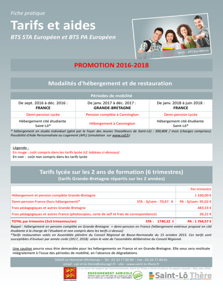Fiche pratique Tarifs et aides BTS STA Européen et BTS PA Européen PROMOTION 2016-2018 Modalités d'hébergement et de restauration Périodes de mobilité De sept. 2016 à déc. 2016 : FRANCE De janv. 2017 à déc. 2017 : GRANDE-BRETAGNE De janv. 2018 à juin 2018 : FRANCE Demi-pension Lycée Pension complète à Cannington Demi-pension Lycée Hébergement cité étudiante Saint-Lô* Hébergement à Cannington Hébergement cité étudiante Saint-Lô* * hébergement en studio individuel (géré par le Foyer des Jeunes Travailleurs de Saint-Lô) : 300,80€ / mois (charges comprises). Possibilité d'Aide Personnalisée au Logement (APL) (simulation sur www.caf.fr) Légende : En rouge : coût compris dans les tarifs lycée (cf. tableau ci-dessous) En noir : coût non compris dans les tarifs lycée Tarifs lycée sur les 2 ans de formation (6 trimestres) (tarifs Grande-Bretagne répartis sur les 2 années) Par trimestre Hébergement et pension complète Grande-Bretagne Demi-pension France (hors hébergement)* 1 160,00 € STA : 3j/sem : 70,67 € Frais pédagogiques et autres Grande-Bretagne 483,33 € Frais pédagogiques et autres France (photocopies, carte de self et frais de correspondance) TOTAL par trimestre (2x3 trimestres/an) PA : 5j/sem: 95,02 € STA : 1740,22 € 26,22 € PA : 1 764,57 € Rappel : hébergement en pension complète en Grande-Bretagne + demi-pension en France (hébergement extérieur proposé en cité étudiante à la charge de l'étudiant et non compris dans les tarifs ci-dessus) *Tarifs restauration votés en Assemblée plénière du Conseil Régional de Basse-Normandie du 15 octobre 2015. Ces tarifs sont susceptibles d'évoluer par année civile (2017, 2018) selon le vote de l'assemblée délibérative du Conseil Régional. Une caution pourra vous être demandée pour les hébergements en France et en Grande-Bretagne. Elle vous sera restituée intégralement à l'issue des périodes de mobilité, en l'absence de dégradations. Saint Lô – Thère 50620 Le Hommet d’Arthenay – Tél : 02 33 77 80 80 – Fax : 02.33.77.80.81 email : [email protected] - site : www.saint-lo-there.fr Dans un souci de respect de l'environnement, Saint-Lô Thère a choisi d'utiliser du papier recyclé – Maj janv 2016 Fiche pratique Tarifs et aides BTS STA Européen et BTS PA Européen Les aides possibles (exemple sur les 2 ans de formation 2013 - 2015) 1/ Aides liées à la mobilité Aides non liées aux conditions de revenus. Demandes formulées par l'établissement. Bourses de stage Ministère de l'Agriculture versement en une fois en novembre 2014 685,00 € Bourses d'études Conseil Régional de Basse-Normandie versement en une fois en novembre 2014 950,00 € BTS PA€ Bourses d'études et de stage ERASMUS 630,00 € TOTAL DES AIDES BTS STA€ 900,00 € 2 265,00 € 2 535,00 € 2/ Bourses diverses Elles peuvent être liées aux conditions de revenus, Les demandes sont déposées individuellement par les étudiants : AFDIL pour les étudiants en BTS STA, Conseil Général, Communes, Comités d'entreprises... 3/ Aide Personnalisée au Logement (APL) proposée par la CAF simulation sur www.caf.fr Hébergement à Cannington Hébergement à Saint-Lô Cabinet Archipole M.Bouyer
