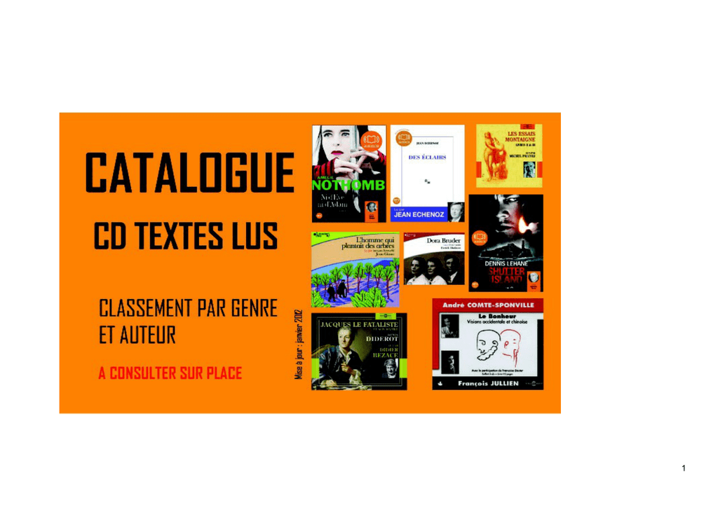 1 SOMMAIRE CD Fiction Pièces de théâtre lues ........................................................ p 3 Poésie lue ........................................................................... p 4 Prose lue (romans, nouvelles, etc.) ..................................... p 5 Légendes, mythes, etc. ....................................................... p 18 CD Documentaires Entretiens, autobiographies .............................................. Biographies ........................................................................ Histoire, témoignages ........................................................ Philosophie ......................................................................... Religion, sciences sociales, sciences exactes, arts, etc. .... p 19 p 21 p 22 p 24 p 27 2 Pièces de théâtre lues Anouilh, Jean Ardèle ou la marguerite ; Cécile ou l'école des pères / Jean Anouilh. - Le Livre Qui Parle, 2008 (P) 611 ANO Brisville, Jean-Claude L'Entretien de M. Descartes avec M. Pascal le jeune / Jean Claude Brisville. - Le Livre Qui Parle, 2008 (P) 611 BRI Camus, Albert Caligula / Albert Camus. - Frémeaux & Associés, 2003 (C) 611 CAM Cocteau, Jean Les Enfants terribles / Jean Cocteau. - Audivis, 2002 (P) 611 COC Courteline, Georges Boubouroche ; Le Gendarme est sans pitié ; Un client sérieux ; L'Article 330... / Georges Courteline. - Socadisc Europ' Distributi, 2007 (P) 611 COU Duras, Marguerite La Musica deuxième / Marguerite Duras. - Editions Des Femmes, 2008 (P) 611 DUR Guitry, Sacha Souvenirs / Sacha Guitry. - Universal Music France S.a, 2003 (P) 611 GUI James, Henry La Bête dans la jungle / James Lord d'après Henry James. - Des femmes-Antoinette Fouque 611 JAM Jarry, Alfred Ubu roi / Alfred Jarry. - Nocturne, 2008 (P) 611 JAR Marivaux Les Fausses confidences : comédie en 3 actes, mise en scène par Jean-Louis Barrault. / Marivaux. - Socadisc Europ' Distributi, 2005 (P) 611 MAR Molière Les Femmes savantes / Molière. - Audivis, 1989 (C) 611 MOL F Molière Le Tartuffe / Molière. - Audivis, 1989 (C) 611 MOL T Molière Dom Juan / Molière. - Naïve, 2005 (P) 611 MOL MP3 MP3 3 Müller, Heiner Quartett : Festival d'Avignon 2007, lecture dans la cour d'honneur Palais des Papes. / Heiner Muller. - Harmonia Mundi, 2008 (P) 611 MUL Musset, Alfred de Lorenzaccio : version intégrale : Verson scénique et découpage pour la représentation du 27 Novembre 1954 : Gérard Philipe / Alfred de Musset. - Socadisc Europ' Distributi, 2007 (P) 611 MUS Sartre, Jean-Paul Le Diable et le bon dieu : pièce en 3 actes et 11 tableaux : scènes principales / Jean-Paul Sartre.Socadisc Europ' Distributi, 2005 (P) 611 SAR Sartre, Jean-Paul Huis clos / Jean-Paul Sartre. - Socadisc Europ' Distribution, 2010 (P) 611 SAR Poésie lue [Anthologie] Les Blasons du corps féminin : Poèmes du XVIe siècle / [lus par] Gérard Philipe et André Raybaz. - EPM, 2009 (P) 612 BLA Claudel, Paul Le Chemin de la Croix / Paul Claudel, texte. - Calliope, 2000 (P) 612 CLA Desnos, Robert Anthologie poétique / Robert Desnos. - Nocturne, 2001 (P) 612 DES Dani Haikus : Basho, Buson, Issa, Ryokan, Shiki / lus par Dani. - Frémeaux & Associés, 2010 (P) 612 HAI Hugo, Victor Quoi de neuf ? Victor Hugo ! : Victor Hugo et les poètes contemporains / Andrée Chedid, Lionel Ray, Armand Gatti ... (et al.). - Frémeaux & Associés : Centre national de documentation pédagogique, 2002 (C) 612 HUG Juliet, Charles J'ai cherché... / Charles Juliet. - Editions Des Femmes, 2008 (P) 612 JUL Laâbi, Abdellatif L'Etreinte du monde ; Fragments d'une genèse oubliée / Abdellatif Laâbi. - Khamsa, 2001 612 LAA La Fontaine, Jean de La Fontaine / Jean de Fontaine (La). - Warner Music, 2006 (P) 612 LAF 4 Mauriac, François Textes et Poèmes / François Mauriac. - EPM, 2009 (P) 612 MAU Dussollier, André Monstres sacrés, sacrés monstres : Textes réunis par André Dussolier pour un spectacle créé au Théâtre Molière-Maison de la poésie en 2002 / André Dussolier. - Gallimard, 2002 (C) : Deux Ailes Productions, 2002 (P) 612 MON [Anthologie] Mots d'amour : Poésies et Lettres de / Louis Aragon, Guillaume Apollinaire, Charles Baudelaire, Joachim Du Bellay, René-Guy Cadou, Marceline Desbordes-Valmore, Bernard Dimey, Louise Labé, Alphonse de Lamartine, François Mauriac, Gérard de Nerval, Jacques Prévert, Paul Valéry, Paul Verlaine. - EPM, 2009 (P) 612 MOT Hugo,Victor Victor Hugo / Victor Hugo ; Oeuvres poétiques . - Frémeaux & Associés, 2002 (C) 612 OEU [Anthologie] Poèmes érotiques . - Planett, 1991 (P) 612 POE Prévert, Jacques Jacques Prevert : 100 ans / Alain Poulanges / Janine Marc-Pezet. - Radio France, 1999 (P) 612 PRE Rilke, Rainer-Maria Rainer Maria Rilke : opéra de poche / adaptation et mise en scène Henri Mariel. - Théâtre de l'Entracte, 2001 (P) 612 RIL Rimbaud, Arthur Une saison en enfer : texte intégral / Arthur Rimbaud. - Anabel Simon, 1995 (P) 612 RIM Velter, André Tombeau de Chantal Mauduit / André Velter. - Nocturne 612 TOM Verlaine, Paul L'Aube à l'envers et autres poèmes / Paul Verlaine. - Gallimard Jeunesse, 2010 (P) 612 VER Germain-Thomas Olivier Voix de poètes III : 23 poètes disent leur texte / Olivier Germain-Thomas. - Compacts Radio France,1999 (P) 612 VOI 3 5 Prose lue (romans, nouvelles...) Alain-Fournier Le Grand Meaulnes / Alain-Fournier. - Gallimard, 2010 (P) 613 ALA Allais, Alphonse Nouvelles / Alphonse Allais. - Nocturne, 2007 (P) 613 ALL Balzac, Honoré de Le Colonel Chabert / Honoré de Balzac. - Beaux Textes et Musique 613 BAL Balzac, Honoré de Un contrat de mariage : texte abrégé / Honoré de Balzac. - Nocturne, 2005 (P) 613 BAL Baricco, Alessandro Soie / Alessandro Baricco. - Frémeaux & Associés : Gallimard, 2005 (P) 613 BAR Barbey, d'Aurevilly Jules Le Bonheur dans le crime / Jules Barbey d'Aurevilly. - Socadisc Europ' Distributi, 2007 (P) 613 BAR Barjavel, René Le Voyageur imprudent / Rene Barjavel. - Les Editions Livraphone, 2006 (P) 613 BAR Barbery, Muriel L'Elé