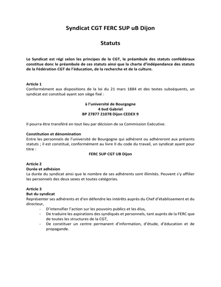 Syndicat CGT FERC SUP uB Dijon Statuts