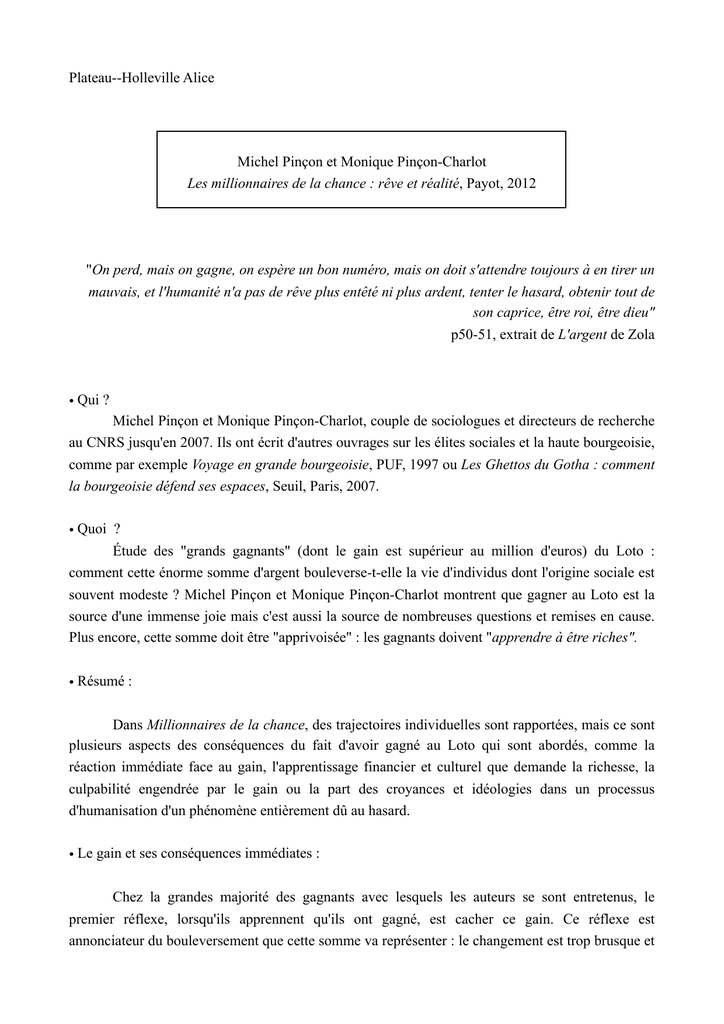 Plateau--Holleville Alice Michel Pinçon et Monique Pinçon-Charlot Les millionnaires de la chance : rêve et réalité, Payot, 2012 "On perd, mais on gagne, on espère un bon numéro, mais on doit s'attendre toujours à en tirer un mauvais, et l'humanité n'a pas de rêve plus entêté ni plus ardent, tenter le hasard, obtenir tout de son caprice, être roi, être dieu" p50-51, extrait de L'argent de Zola • Qui ? Michel Pinçon et Monique Pinçon-Charlot, couple de sociologues et directeurs de recherche au CNRS jusqu'en 2007. Ils ont écrit d'autres ouvrages sur les élites sociales et la haute bourgeoisie, comme par exemple Voyage en grande bourgeoisie, PUF, 1997 ou Les Ghettos du Gotha : comment la bourgeoisie défend ses espaces, Seuil, Paris, 2007. • Quoi ? Étude des "grands gagnants" (dont le gain est supérieur au million d'euros) du Loto : comment cette énorme somme d'argent bouleverse-t-elle la vie d'individus dont l'origine sociale est souvent modeste ? Michel Pinçon et Monique Pinçon-Charlot montrent que gagner au Loto est la source d'une immense joie mais c'est aussi la source de nombreuses questions et remises en cause. Plus encore, cette somme doit être "apprivoisée" : les gagnants doivent "apprendre à être riches". • Résumé : Dans Millionnaires de la chance, des trajectoires individuelles sont rapportées, mais ce sont plusieurs aspects des conséquences du fait d'avoir gagné au Loto qui sont abordés, comme la réaction immédiate face au gain, l'apprentissage financier et culturel que demande la richesse, la culpabilité engendrée par le gain ou la part des croyances et idéologies dans un processus d'humanisation d'un phénomène entièrement dû au hasard. • Le gain et ses conséquences immédiates : Chez la grandes majorité des gagnants avec lesquels les auteurs se sont entretenus, le premier réflexe, lorsqu'ils apprennent qu'ils ont gagné, est cacher ce gain. Ce réflexe est annonciateur du bouleversement que cette somme va représenter : le changement est trop brusque et se cacher permet de continuer pendant un temps la routine. La première question qui se pose à eux est "qui mettre dans le secret ?", ce qui montre combien les liens que les gagnants entretiennent avec leur entourage sont susceptibles de changer avec cette nouvelle, qui peut ainsi engendrer des tensions. Un autre réflexe des gagnants est aussi de ne pas y croire, parce que le bouleversement est trop important, mais aussi parce qu'ils craignent que leur gain puisse leur être ôté durant le délai entre l'annonce des numéros gagnants et la remise du chèque. Une fois que l'argent a été acquis, des décisions doivent être prises, comme le placement de cet argent, et arrivent les premiers changements concrets comme l'acquisition de biens matériels tels une voiture, un logement, qui trahissent parfois les gagnants désireux de conserver leur anonymat. Chez d'autres, notamment chez ceux qui possédaient déjà des revenus élevés, les premiers achats peuvent être culturels, comme pour Marcel et Brigitte Hubert, qui se sont offerts "une croisière à thème philosophique dans les îles grecques". Le gain apporte aussi une sécurité, l'assurance de ne manquer de rien, le plaisir de "payer cash". Les décisions des gagnants ne sont pas les mêmes selon l'âge ou la catégorie sociale à laquelle ils appartenaient : les plus âges ont ainsi tendance à privilégier un aménagement de leur quotidien, et la succession est leur priorité, alors que les plus jeunes sont plus enclins à des changements plus radicaux, notamment en ce qui concerne le logement. Chez les plus modestes, l'arrêt de travail, ou, solution moins radicale, la "mise en disponibilité" sont plus souvent constatés : pour les moins favorisés, gagner au Loto peut ainsi être l'occasion "d'échapper" à un quotidien jugé parfois "invivable". Ainsi, en ce qui concerne le travail, les réactions sont variées : certains choisissent immédiatement de quitter leur emploi quand d'autres ne l'ont jamais envisagé, certains ne travaillent plus jamais lorsque d'autres profitent du gain pour accéder à un emploi plus en rapport avec leurs passions et que d'autres encore regrettent et reviennent. Patrice Gerbault a ainsi quitté son emploi d'ouvrier menuisier pour devenir un grand propriétaire forestier, alors que Marc Vernier, docker, n'a pas quitté son poste. Ainsi, si pouvoir arrêter de travailler peut sembler être un immense privilège, il ne faut pas oublier que le travail est aussi un vecteur de relations sociales qui participent à l'identité de l'individu. • L'apprentissage financier et culturel : Les gagnants du Loto n'ont pas grand chose à voir avec les héritiers de riches familles : alors que les seconds ont reçu depuis toujours une éducation visant à les préparer à hériter, les premiers se retrouvent, pour la plupart, en possession d'une fortune mais ignorant comme gérer à la fois la somme d'argent et le statut qui va avec. Une éducation à la fois sociale, culturelle et financière est alors nécessaire. Dès la cérémonie de remise du chèque, un accompagnement est mis à la disposition des grands gagnants par la Française des Jeux. Il consiste à la fois en des "ateliers de parole" entre les différents gagnants, mais aussi en des guides et des jeux visant à leur enseigner un vocabulaire financier. Une des premières décisions que les gagnants ont à prendre concerne alors le placement de leur argent, qui a pour conséquence leur entrée dans le monde de la finance. Les gagnants racontent alors le mépris que les établissements financiers ont pu avoir à leur égard : un couple de jeunes gagnants a ainsi été pris de haut jusqu'au moment où ils ont sorti le chèque de la Française des Jeux et où l'attitude de l'établissement envers eux a radicalement changé ; un autre raconte qu'au moment où il est entré dans sa banque, son compte avait un découvert de 50!, alors que qua