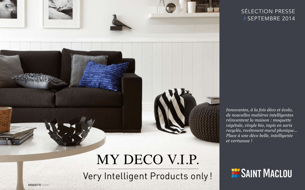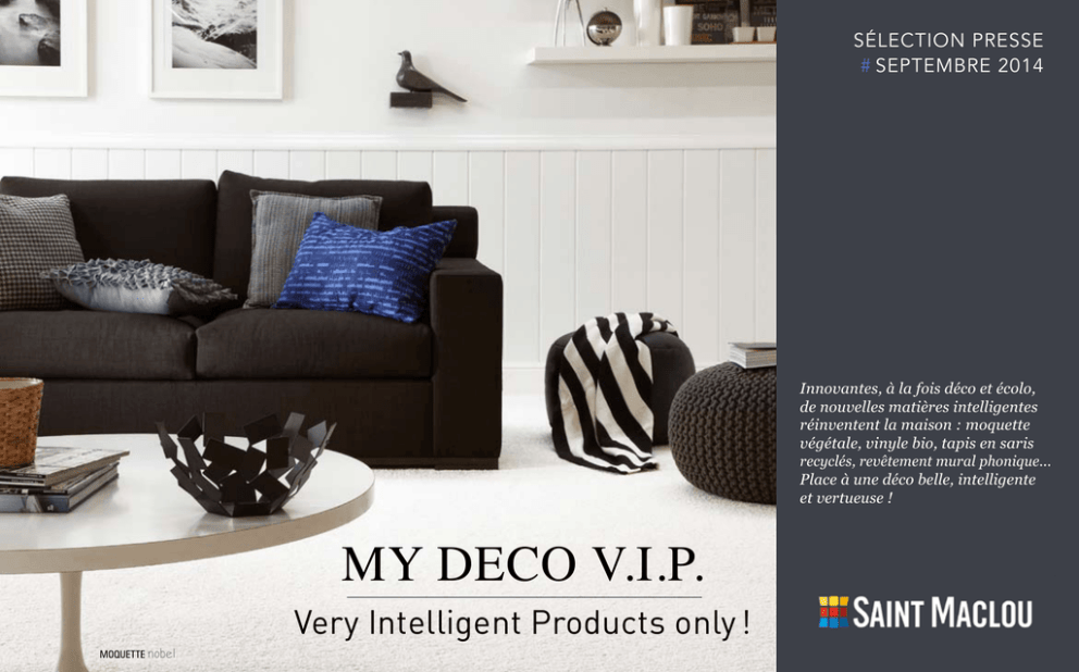 SÉlection presse # SEPTEMBRE 2014 Innovantes, à la fois déco et écolo, de nouvelles matières intelligentes réinventent la maison : moquette végétale, vinyle bio, tapis en saris recyclés, revêtement mural phonique... Place à une déco belle, intelligente et vertueuse ! MY DECO V.I.P. Very Intelligent Products only ! MOQUETTE nobel COCON végétal La moquette végétale est LA nouvelle matière cet hiver... Mœlleuse et douce comme la mousse , elle est naturellement anti-taches. Qui dit mieux ? A base de glucose de maïs, la fibre Triexta Amaize® est une nouvelle matière écologique, à la fois sublime, duveteuse, et résistante. Anti-taches sans traitement, elle résulte d’une fabrication unique et éco-responsable : elle utilise 30% d’énergie de moins que la production d’une moquette classique, tout en émettant 60% de C02 de moins. Garantie 5 ans, cette moquette innovante se décline en 2 modèles chez Saint Maclou : EDISON et NOBEL. fibres végétales MOQUETTE nobel 100% Triexta Amaize. Fabriqué à partir de 37% de maïs renouvelable. Existe en 20 coloris - Largeur 4m - 39.99€/m² MOQUETTE edison 100% Triexta Amaize - Fabriqué à partir de 37% de maïs renouvelable Existe en 16 coloris - Largeur 4m - 34.99€/m² 2 DÉCO bio En liège, bambou ou vinyle bio... Rien de plus déco qu’un sol écolo ! Forêt de bambou à l’état brut Toute l’originalité de ce nouveau parquet bambou réside dans sa coupe initiale : ici les tiges de bambou ne sont pas taillées en lamelles, mais coupées en 2 : les demi troncs sont ensuite aplatis pour obtenir des lames de parquet bambou naturelles, avec nœuds du bois apparents. Il est même parfois possible de voir sur une lame une inscription faite par le paysan qui a cultivé la parcelle de bambou. Sain, résistant, avec un bilan carbone neutre, c’est une ressource durable à imposer dans toutes les pièces ! Innovation majeure : le 1er vinyle bio Sans chlore, ni solvants ni plastifiants, voici le tout premier sol bio en matières renouvelables, sous forme de lames vinyles à coller. Les huiles de ricin et de colza prennent le relai de la pétrochimie pour donner naissance à une matière organique, recyclable avec les déchets ménagers, et sans émissions COV. liège effet bois Liège ARTCOMFORT FERRIC RUSTIC ash 49.99€/m² LiEge power Le liège provient de l’écorce du chêne-liège, retirée manuellement du tronc sans endommager l’arbre, se renouvelant perpétuellement. Une ressource inépuisable et durable donc ! Matériau ultra résistant, isolant phonique et thermique, le liège revêt aujourd’hui tous les aspects (bois, béton, marbre…) grâce à l’impression optique, tout en conservant ses propriétés naturelles de revêtement sain et écologique. Qui dit mieux ? Le liège est LE nouveau superhéros de la déco ! PARQUET MASSIF BAMBOU forest Pose collée. Ep. 18mm. Lame de 12.5 x 121 cm 69.99€ le m² vinyle bio GAMME purlin Ep. 2.5 mm - Usage intensif - A coller Différents formats lames ou dalles - 59.99€/m² 3 TAPIS brazil 2 coloris et 2 tailles au choix. Composé à partir de Saris Tapis 50% viscose 30% laine 20% coton. 160 x 230 cm - 99€ 200 x 290 cm - 169€ DÉCO recyclo Quel point commun entre un sari indien, un pneu, un jean et une tente de l’armée ? Tous se tissent une nouvelle vie en mode tapis. Trendy ! Tapis de soie saris indiens recyclés Les saris de soie indiens se réincarnent en tapis multicolore TAPIS canvas 160 x 230 cm - 399€ TAPIS vintage PA Coton recyclé 120 x 170 cm - 79€ 160 x 230 cm - 149€ Tapis Vintage Jeans Les jeans recyclés se mettent au service de ce tapis, pour une durabilité exceptionnelle et une résistance à toute épreuve. TAPIS cyclo 50% polypropylène 50% rubber - 160 x 230 cm - 279€ Tapis Cyclo Intégrer les fibres de pneus usagés à la structure tissée d’un tapis, voilà une idée déco-responsable ! Cette fabrication artisanale ne nécessite aucun procédé chimique et propose des pièces uniques adaptée à la déco indoor et outdoor. Tapis Canvas Les anciennes tentes de l’armée trouvent une seconde vie et font entrer une part d’aventure et d’histoire au cœur de nos intérieurs ! Détail déco : les pièces de tissus sont assemblées entre elles par un point de croix en cuir du plus bel effet. 4 GREEN VINACOUSTIC tivoli Revêtement mural acoustic en vinyle Largeur 130 cm - 49.30€ le m² & design Pouvoirs thermiques et performances phoniques : fenêtre et murs s’habillent de matières technologiques ! Murs du son Avec ces papiers-peints 2 en 1, on combine revêtement design et isolant phonique. Résolument innovant ! QUICKMOUSSE cubick Mousse PVC sur intissé Largeur 130cm - 21.70€ le m² Rideaux avec clim’ intégrée ! DOUBLURE THERMIQUE moondream Utilisable des 2 côtés - Lavable uniquement en pressing - 14.90€ Conserver une pièce fraiche l’été, éviter les déperditions de chaleur l’hiver : la doublure thermique Saint Maclou dispose de 2 faces (été et hiver) et s’adapte à tous les rideaux. Résultat : jusqu’à 46% d’économie d’énergie ! L’ensemble des tissus de la gamme Saint Maclou peuvent être équipés de cette doublure thermique. 5 6 SERVICES intelligents 1/ Étude et devis à domicile gratuits. 2 / Confection sur-mesure au cm. près : rideaux, stores, voilages, coussins 3 / Prêt d’échantillons sur tous nos produits. Exclusivité Saint Maclou 4 / Pose par nos équipes, garantie 5 ans. Exclusivité Saint Maclou 5 / Découpe au cm sans payer les chutes*. *Sur les moquettes signalées en magasin. 6 / Livraison à l’adresse de votre choix partout en France. CONTACTS presse Agence 03 20 74 95 23 Cathy Plancke // 06 40 45 84 43 // [email protected] Alexandra Breyne // 06 30 81 90 17 // [email protected] Création graphique : Christelle Muller 06 72 Unique en son genre, l’éventail de services Saint Maclou couvre le conseil personnalisé, la pose à domicile, la confection surmesure, et p