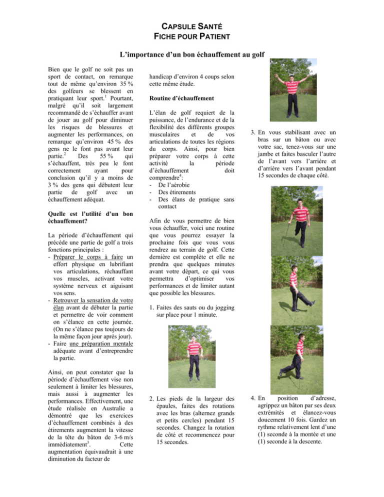 CAPSULE SANTÉ FICHE POUR PATIENT L’importance d’un bon échauffement au golf Bien que le golf ne soit pas un sport de contact, on remarque tout de même qu’environ 35 % des golfeurs se blessent en pratiquant leur sport.1 Pourtant, malgré qu’il soit largement recommandé de s’échauffer avant de jouer au golf pour diminuer les risques de blessures et augmenter les performances, on remarque qu’environ 45 % des gens ne le font pas avant leur partie.2 Des 55 % qui s’échauffent, très peu le font correctement ayant pour conclusion qu’il y a moins de 3 % des gens qui débutent leur partie de golf avec un échauffement adéquat. Quelle est l’utilité d’un bon échauffement? La période d’échauffement qui précède une partie de golf a trois fonctions principales : - Préparer le corps à faire un effort physique en lubrifiant vos articulations, réchauffant vos muscles, activant votre système nerveux et aiguisant vos sens. - Retrouver la sensation de votre élan avant de débuter la partie et permettre de voir comment on s’élance en cette journée. (On ne s’élance pas toujours de la même façon jour après jour). - Faire une préparation mentale adéquate avant d’entreprendre la partie. Ainsi, on peut constater que la période d’échauffement vise non seulement à limiter les blessures, mais aussi à augmenter les performances. Effectivement, une étude réalisée en Australie a démontré que les exercices d’échauffement combinés à des étirements augmentent la vitesse de la tête du bâton de 3-6 m/s immédiatement3. Cette augmentation équivaudrait à une diminution du facteur de handicap d’environ 4 coups selon cette même étude. Routine d’échauffement L’élan de golf requiert de la puissance, de l’endurance et de la flexibilité des différents groupes musculaires et de vos articulations de toutes les régions du corps. Ainsi, pour bien préparer votre corps à cette activité la période d’échauffement doit comprendre4: - De l’aérobie - Des étirements - Des élans de pratique sans contact 3. En vous stabilisant avec un bras sur un bâton ou avec votre sac, tenez-vous sur une jambe et faites basculer l’autre de l’avant vers l’arrière et d’arrière vers l’avant pendant 15 secondes de chaque côté. Afin de vous permettre de bien vous échauffer, voici une routine que vous pourrez essayer la prochaine fois que vous vous rendrez au terrain de golf. Cette dernière est complète et elle ne prendra que quelques minutes avant votre départ, ce qui vous permettra d’optimiser vos performances et de limiter autant que possible les blessures. 1. Faites des sauts ou du jogging sur place pour 1 minute. 2. Les pieds de la largeur des épaules, faites des rotations avec les bras (alternez grands et petits cercles) pendant 15 secondes. Changez la rotation de côté et recommencez pour 15 secondes. 4. En position d’adresse, agrippez un bâton par ses deux extrémités et élancez-vous doucement 10 fois. Gardez un rythme relativement lent d’une (1) seconde à la montée et une (1) seconde à la descente. sur le terrain. L’ordre établi est important, car les étirements (exercices # 5-6-7) se doivent d’être faits à la suite d’un léger échauffement. Notez aussi qu’un étirement ne devrait pas faire mal, on devrait plutôt sentir une légère tension que l’on maintient sans donner de coup. 7. Placez-vous à 2 pieds (60cm) d’un banc et appuyez un talon sur celui-ci. En vous penchant doucement vers l’avant, tentez d’aller toucher la pointe du pied sur le banc. Maintenez cette position 30 secondes puis changez de côté. 5. En tenant toujours le bâton par ses extrémités, apportez-le derrière votre tête en maintenant vos bras droits. Maintenez une légère tension pendant 30 secondes. 8. Faites 10 élans de pratique dans le vide avec une intensité de 50 % pour débuter. Augmentez graduellement l’intensité. Plusieurs golfeurs ne prennent pas le temps de frapper quelques balles de pratiques avant leur partie. Malgré cela un golfeur peut tout de même bien s’échauffer en se servant de la routine précédente en laissant tomber l’exercice # 10. La routine lui prendra alors que 6 minutes et il aura une bonne préparation physique. N’ayant pas frappé de balles avant son départ, il n’aura cependant pas la sensation complète de son élan et la préparation mentale optimale. Bref, la période d’échauffement comporte tellement d’éléments bénéfiques pour votre élan de golf, vos performances et votre santé qu’elle ne vaut pas la peine d’être négligée. D’autant plus, qu’elle ne vous demande que 6 minutes avant votre départ. Pour toutes questions sur votre état de santé, sur une blessure ou encore sur cette routine d’échauffement, n’hésitez pas à contacter votre chiropraticien. Il est formé pour déterminer ce qu’il est le plus approprié pour vous. Bon golf! Références : 9. Faites 5 élans dans le vide du côté opposé au vôtre. 6. Avec le bâton au dessus de la tête cette fois, penchez-vous sur le côté et maintenez la tension 30 secondes. Faites-le ensuite de l’autre côté. 10. Frappez quelques balles avec une intensité réduite à 50-70 % en commençant par les petits bâtons puis progressez vers les bois en augmentant l’intensité progressivement. Il s’agit d’une routine d’échauffement complète qui vous permettra de diminuer les risques de blessures et d’augmenter vos performances 1 Fradkin AJ et al. Describing the epidemiology and associated age, gender and handicap comparisons of golfing injuries. Int J Inj Contr Saf Promot. 2007 Dec; 14 (4):264-6. 2 Fradkin AJ et al. Warm up practices of golfers: are they adequate? Br J Sports Med. 2001 Apr;35(2):125-7. 3 Fradkin AJ et al. Improving golf performance with a warm up conditioning programme. Br J Sports Med. 2004 Dec;38(6):762-5. 4 Stockard AR. Elbow injuries in golf. J Am Osteopath Assoc. 2001 Sep;