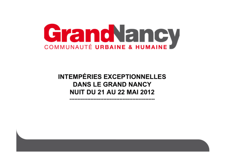 INTEMPÉRIES EXCEPTIONNELLES DANS LE GRAND NANCY NUIT DU 21 AU 22 MAI 2012 ----------------------------------------------------- LES RUISSEAUX DANS L’AGGLOMÉRATION NANCÉIENNE Le Grand Nancy se situe dans une cuvette encadrée de plateaux. Des deux côtés des rives de la Meurthe existent des affluents perpendiculaires à cette dernière et de faible longueur. De par ces caractéristiques géographiques, les temps de concentration des eaux pluviales sont très courts. Une goutte d’eau met entre 10 et 20 minutes pour parcourir la distance entre le plateau et la Meurthe. PROFILS GÉOLOGIQUES DE L’AGGLOMÉRATION NANCÉIENNE LAME D’EAU - JUIN 2007 Nature de l’orage ayant caractérisé la catastrophe naturelle de 2007. LAME D’EAU – MAI 2012 Caractéristique de l’orage du lundi 21 au mardi 22 mai 2012. On peut constater que les cumuls sont jusqu’à 10 fois supérieurs à ceux de 2007. LAME D’EAU COURBES DE PLUVIOGRAPHIE Ce graphique illustre un phénomène également exceptionnel montrant que ce n’est pas un orage mais deux qui se sont succédés à une heure d’intervalle. HAUTEUR D’EAU CUMULÉE - MAI 2012 Ce graphique illustre le cumul de précipitations subi sur les deux rives de la Meurthe sur la durée du phénomène de trois heures, au regard du cumul de pluie de référence centenale. On peut constater que, rive droite, dès le premier orage, la référence centenale a été atteinte et, qu’avec le second, le niveau de cumul le dépasse de deux fois. LES AMÉNAGEMENTS DE LA MEURTHE Le Grand Nancy a réalisé d’importants travaux hydrauliques sur la Meurthe dans la traversée de l’agglomération de 1986 à 2002. 58 M€ ont ainsi été investis. Le Grand Nancy finance à hauteur de 33%, l’Etat 24 %, la Région et le Département 21,5 %. Au cours de la nuit du 21 au 22 mai, la Meurthe a bien absorbé les débits qui lui parvenaient. SINISTRÉS ET DÉGÂTS POUR LA TOTALITÉ DES COMMUNES DU GRAND NANCY : CHIFFRES PROVISOIRES Plus de 2 300 habitations privées sinistrées sur le Grand Nancy Plus de 200 entreprises et plus de 200 bâtiments et lieux publics du Grand Nancy ont subi des dégâts Plus de 15 000 dossiers de particuliers et plus de 1 100 dossiers d’entreprises déposés auprès des assurances sur le périmètre des 70 communes touchées par les orages Plus de 2 500 voitures et motos détériorés 20 000 foyers en panne d’électricité dans la nuit du 21 au 22 mai. L’électricité a été rétablie le soir même du mardi 22 mai. Plus de 1200 interventions de sapeurs-pompiers INCIDENCES SUR LES RÉSEAUX ET LES ÉQUIPEMENTS DU GRAND NANCY LE RESEAU D’EAU Les installations d'eau potable ont connu des pannes électriques liées à la foudre. Ces pannes n'ont pratiquement pas impacté la continuité de la distribution d'eau sur l'agglomération en terme de qualité. Les jours suivants, plus de 100 prélèvements de contrôles se sont avérés conformes. LE RÉSEAU D’ASSAINISSEMENT Il a joué son rôle et a rapidement évacué la crue une fois les intempéries achevées. La station d'épuration de Maxéville a correctement fonctionné. INCIDENCES SUR LES RÉSEAUX ET LES ÉQUIPEMENTS DU GRAND NANCY VOIRIES 20 kilomètres de voirie ont été nettoyées, 2 kilomètres sont en cours de réfection. CARREFOURS À FEUX 80 systèmes de feux tricolores sur 400 ont été endommagés. Les dysfonctionnements ont été résorbés le 24 mai au soir. INCIDENCES SUR LES RÉSEAUX ET LES ÉQUIPEMENTS DU GRAND NANCY BÂTIMENTS COMMUNAUTAIRES Plusieurs bâtiments publics ont été touchés à des degrés divers MUSEUM AQUARIUM (Nancy) : inondation et résidus de boue au sous-sol, STADE MARCEL PICOT (Tomblaine) : inondation et infiltration d’eau dans les tribunes, terrain synthétique annexe et pelouse du terrain d’honneur, PARC DE SPORTS (Vandoeuvre) : infiltration d’eau, portes automatiques et dalles de faux plafond endommagées, PISCINE DU LIDO (Tomblaine) : sous sol inondé, dégâts très importants au niveau des installations techniques. Plusieurs mois de fermeture nécessaires, GOLF DU GRAND NANCY (Pulnoy) : débordement d’un étang et dégâts sur le parcours. Fermeture temporaire les 22 et 23 mai. JARDIN BOTANIQUE (Villers-lès-Nancy) : pavillon d’accueil inondé. Jardin légèrement endommagé par de la boue, MUSEE DE L’HISTOIRE DU FER (Jarville-la-Malgrange) : Allées du parc crevassées, inondation dans la galerie Prouvé) LOCAUX COMMUNAUTAIRES-BATIMENT CHALNOT (Nancy) : inondation de certains bureaux. LES ACTIONS DE SOLIDARITÉ ENGAGÉES Préfecture - Mise en place d'un numéro d'appel téléphonique dédié pour l'information des sinistrés et des communes : 08.11.00.06.54. - Secours d'extrême urgence – aides pour toutes personnes Ce dispositif est mis en place pour aider les personnes se trouvant dans une situation difficile au lendemain d'un sinistre, à faire face, dans l'immédiat, à leurs besoins essentiels les plus urgents. Cette aide - 150 € par adulte et 75 € par enfant - est gérée par les services de la Préfecture de Meurthe-et-Moselle. Secours rapide de la CAF - Les Maires ont été chargés de recenser et communiquer au Préfet pour le 23 mai les familles paraissant en avoir le plus besoin. Croix-Rouge - En lien avec le Grand Nancy, les délégations Grand Nancy et départementale 54 de la Croix-Rouge reçoivent les dons de vêtements, de biens (meubles, électroménager, matériels divers…), de produits de consommation courante (nourriture, produits d’hygiène, ménagers…), ainsi que les dons en numéraires. LES ACTIONS DE SOLIDARITÉ ENGAGÉES Grand Nancy - Cellule de conseil pour les communes et les administrés (particuliers ou entreprises) de 8h à 18 h, en complément des moyens mis en œuvre au niveau communal : 03.83.91.83.65. - « Solidarité Inondations Grand Nancy » : le Grand Nancy, en lien avec la CroixRouge, relaye les initiatives de soutien humain et matériel que chacun et chacune seraient prêt