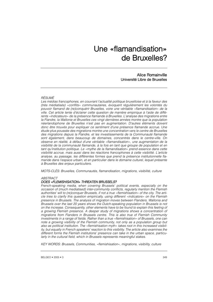 Une «flamandisation» de Bruxelles? Alice Romainville Université Libre de Bruxelles RÉSUMÉ Les médias francophones, en couvrant l'actualité politique bruxelloise et à la faveur des (très médiatisés) «conflits» communautaires, évoquent régulièrement les volontés du pouvoir flamand de (re)conquérir Bruxelles, voire une véritable «flamandisation» de la ville. Cet article tente d'éclairer cette question de manière empirique à l'aide de différents «indicateurs» de la présence flamande à Bruxelles. L'analyse des migrations entre la Flandre, la Wallonie et Bruxelles ces vingt dernières années montre que la population néerlandophone de Bruxelles n'est pas en augmentation. D'autres éléments doivent donc être trouvés pour expliquer ce sentiment d'une présence flamande accrue. Une étude plus poussée des migrations montre une concentration vers le centre de Bruxelles des migrations depuis la Flandre, et les investissements de la Communauté flamande sont également, dans beaucoup de domaines, concentrés dans le centre-ville. On observe en réalité, à défaut d'une véritable «flamandisation», une augmentation de la visibilité de la communauté flamande, à la fois en tant que groupe de population et en tant qu'institution politique. Le «mythe de la flamandisation» prend essence dans cette visibilité accrue, mais aussi dans les réactions francophones à cette visibilité. L'article analyse, au passage, les différentes formes que prend la présence institutionnelle flamande dans l'espace urbain, et en particulier dans le domaine culturel, lequel présente à Bruxelles des enjeux particuliers. MOTS-CLÉS: Bruxelles, Communautés, flamandisation, migrations, visibilité, culture ABSTRACT DOES «FLEMISHISATION» THREATEN BRUSSELS? French-speaking media, when covering Brussels' political events, especially on the occasion of (much mediatised) inter-community conflicts, regularly mention the Flemish authorities' will to (re)conquer Brussels, if not a true «flemishisation» of the city. The article tries to clarify this question empirically, using different «indicators» on the Flemish presence in Brussels. The analysis of migration moves between Flanders, Wallonia and Brussels over the last 20 years shows the Dutch-speaking population in Brussels is not on the increase. Consequently, other elements have to be found to explain this feeling of a growing Flemish presence. A deeper study of migrations shows a concentration of migrations from Flanders in Brussels centre. This is also true of Flemish Community investments in a range of fields. Rather than a true «flemishisation» of Brussels, one can note a growing visibility of the Flemish community, not only as a population group but also as political institution. The «flemishisation myth» takes root in this increased visibility, but equally in French speakers' reaction to this visibility. The article also examines the different forms the Flemish institutions’ presence can take in the urban space, particularly in the cultural field, which in Brussels represents meaningful stakes. KEY WORDS: Brussels, Communities, «flemishisation», migrations, visibility, culture BELGEO • 2005 • 3 349 INTRODUCTION ’actualité bruxelloise est, régulièrement, ponctuée par des «affaires» où s’opposent la Communauté flamande et la Communauté française. Ces affaires prennent la forme d’une sorte de «lutte d’influence» où l’on se bat, au niveau politique, pour maintenir ou acquérir une position de force, une visibilité, une représentation politique. Le financement de Flagey (prestigieux lieu de spectacle à Ixelles), par exemple, a récemment fait couler beaucoup d’encre: la Communauté française tardant à mettre la main au portefeuille pour subventionner le lieu, le ministre flamand de la culture, Bert Anciaux, proposa un financement massif du lieu par la Communauté flamande, exigeant en retour que le conseil d’administration soit en majorité composé de néerlandophones. L’affaire Flagey faisait elle-même écho à celle qui entoura, en 2001, le rachat du Kladaradatsch, un cinéma désaffecté situé en plein centre-ville. Les deux Communautés se disputèrent, plusieurs semaines durant, la propriété du bâtiment, la polémique allant finalement se régler en justice, au bénéfice des francophones. Récemment aussi, en mars 2004, quelques députés flamands, constatant le succès grandissant des écoles flamandes de Bruxelles auprès des francophones (moins de la moitié des enfants inscrits dans ces écoles ont des parents flamands), proposèrent un décret visant à accorder la priorité, dans ces écoles, aux familles «parlant le néerlandais dans la vie de tous les jours». Ce projet suscita la colère de certains politiciens francophones, qui en appelèrent à la «libre circulation des personnes» inscrite dans le droit européen. A la faveur de ces «mini-conflits», médiatisés à l’excès, les médias francophones relaient – tout en contribuant à le créer – un sentiment qui semble dominer auprès des francophones bruxellois, celui d’une présence flamande accrue à Bruxelles. L 350 En traitant le sujet de manière subjective, voire revendicative ou alarmiste, et en particulier lorsqu’il est question d’une nouvelle «implantation flamande» dans la ville, ces médias font souvent l’amalgame hasardeux entre volonté politique et phénomènes réels. Il est permis de croire, par exemple lorsque Le Soir (20 janvier 1999) annonce que «l’apparition du Kladara! (...) termine presque la flamandisation du centre historique de notre ville», qu’il s’agit d’une véritable (re)conquête, dont on ne sait quelles sont les implications en termes de population. Le même journal dénonce ailleurs (le 14 mars 2001) la «volonté politique flamande de s’emparer du centre de Bruxelles grâce aux charmes de la culture», ou encore la flamandisation du quartier de l