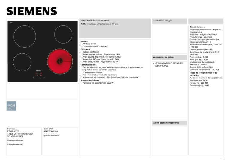 Siemens ET611HE17E TABLE VITRO 4HIGHSPEED