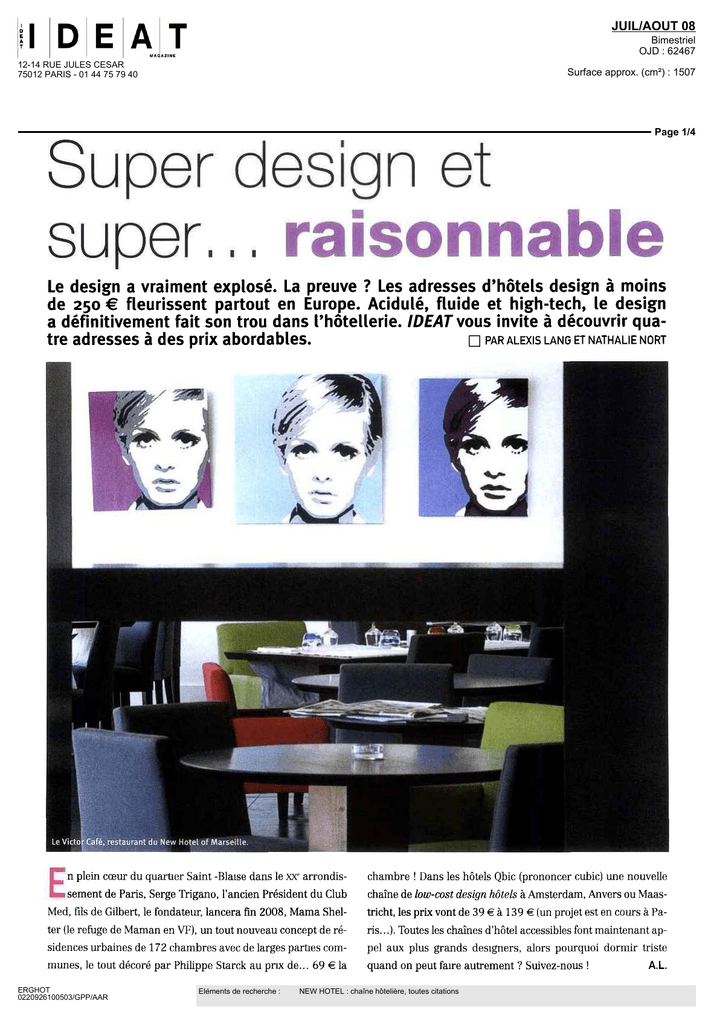 JUIL/AOUT 08 Bimestriel OJD : 62467 12-14 RUE JULES CESAR 75012 PARIS - 01 44 75 79 40 Surface approx. (cm²) : 1507 Page 1/4 Super design et super,,, raisonnable Le design a vraiment explosé. La preuve ? Les adresses d'hôtels design à moins de 250 € fleurissent partout en Europe. Acidulé, fluide et high-tech, le design a définitivement fait son trou dans l'hôtellerie. IDEA! vous invite à découvrir quaPAR ALEXIS LANG ET NATHALIE MORT tre adresses à des prix abordables. E n plein cœur du quartier Saint -Biaise dans le xxr arrondis- sement de Paris, Serge Trigano, l'ancien Président du Club Med, fils de Gilbert, le fondateur, lancera fin 2008, Marna Shelter (le refuge de Maman en VF), un tout nouveau concept de résidences urbaines de 172 chambres avec de larges parties communes, le tout décoré par Philippe Starck au prix de... 69 € la ERGHOT 0220926100503/GPP/AAR Eléments de recherche : chambre ! Dans les hôtels Qbic (prononcer cubic) une nouvelle chaîne de low-cost design hôtels à Amsterdam, Anvers ou Maastricht, les prix vont de 39 € à 139 € (un projet est en cours à Paris. ..). Toutes les chaînes d'hôtel accessibles font maintenant appel aux plus grands designers, alors pourquoi dormir triste quand on peut faire autrement ? Suivez-nous ! A.L. NEW HOTEL : chaîne hôtelière, toutes citations JUIL/AOUT 08 Bimestriel OJD : 62467 12-14 RUE JULES CESAR 75012 PARIS - 01 44 75 79 40 Surface approx. (cm²) : 1507 Page 2/4 Au New Hotel of Marseille, on a abandonné le style provençal pour une idée beaucoup plus contemporaine de l'hôtellerie plus en phase avec notre époque... NEW HOTEL OF MARSEILLE, LIFESTYLE PHOCÉEN Sur les contreforts du Vieux port, le New Hotel of Marseille marie design, luxe, élégance . et décontraction • une bien belle adresse. En face du palais du Pharo, à la place de l'Institut Pasteur de Marseille, se dresse l'un des tout derniers hôtels marseillais. Le concept ? Déco design, accueil décontracté et prix doux. Pour commencer, l'emplacement est exceptionnel, quasiment sur le Vieux port, à 5 minutes à pied à peine du centre-ville. Vous serez aux premières loges pour découvrir ou redécouvrir cette ville définitivement attachante. La décoration est résolument contemporaine. Détail amusant, les grooms ont troqué leur uniforme pour une superbe tenue noire imprimée dans le dos d'un numéro fluo à la façon des joueurs de base-bail américains. Etonnant et très original ! Les couloirs sont éclairés par des lumières rouges, jaunes, bleues et des œuvres d'artistes locaux tapissent les murs de ERGHOT 0220926100503/GPP/AAR Eléments de recherche : leur modernité. Les chambres jouent le contraste avec un décor très chic car très sobre avec des tons doux et neutres et de grandes photos très tendance des années 50 imprimées sur des bannières de grand format. Au dernier étage, huit suites avec terrasse permettent d'admirer la vue sur le Vieux port. Lhôtel dispose d'une excellente table, le Victor café, où le chef propose une carte très originale aux accents provençaux et des formules « light » qui varient au gré des saisons et des arrivages du marché. Un dernier regard sur la piscine et sa superbe terrasse en teck suffit à se dire qu'il faut revenir le plus souvent possible à Marseille, une ville moins attendue que Nice et Cannes Dernier détail amusant. l'hôtel possède quèlques pieds de vigne en plein Marseille ! A.L. Chambre double standard, 215 €. New Hotel of Marseille. Le Pharo, 71, boulevard Charles-Livon, 13007 Marseille. Tél. .- 04 91 315315. www. newhotelofmarseille, com NEW HOTEL : chaîne hôtelière, toutes citations JUIL/AOUT 08 Bimestriel OJD : 62467 12-14 RUE JULES CESAR 75012 PARIS - 01 44 75 79 40 Surface approx. (cm²) : 1507 Page 3/4 Le All Seasons Bercy a profité d'un lifting en profondeur pour instiller une touche épurée et design dans ses chambres. Etonnant pour un hôtel de ce type ! A BERCY, PARIS DESIGN PAS CHER Entre le Palais omnisports de Paris-Bercy et la Cinémathèque française vient de s'installer All Seasons, un hôtel du Groupe Accor qui vient dc lancer une nouvelle enseigne deux étoiles contemporaine dans un ancien Mercure L'architecte Olivier Gibault a tout repensé et le résultat est vraiment intéressant. Lit imposant et moelleux, lampes de chevet LED en silicone et draps. . antistress ! Tout est fait pour vous faire oublier ces hôtels glauques qui ont foisonné à Paris et dans lesquels il fallait vraiment avoir un moral à toute épreuve pour ne pas pleurer (quand les choses n'allaient pas vraiment comme on voulait !). Une grande douche a remplacé la baignoire calamiteuse, l'écran plat a détrôné la télé d'hôpital accrochée à l'angle de la chambre et de jolies couleurs ont réveillé les tons cafardeux. Choix des matières, douce atmosphère épurée et zen, le All Seasons Bercy est un petit miracle, et quand on vous dira que la chambre (en plein Paris) est à 125 €, cela devient presque snob ' A.L All Seasons Bercy. 77, rue de Bercy, 75012 Paris. Tél. : Ol 53 46 50 50. www.all-seasons-hotels.com ERGHOT 0220926100503/GPP/AAR Eléments de recherche : Patrick Jouin J afcjonner une ambiance cocoon aui chambres du Campanile Chantilly CAMPANILE CHANTILLY LOW COST DESIGN La marque Campanile (qui appartient au groupe Louvre hôtels comme Concorde, Kyriad...) a fait une entrée remarquée dans le monde très fermé des design hôtels à Chantilly avec une déco entièrement refaite par Patrick Jouin himself (il a fait, entre autres, le bar du Plazza Athénée ou le très parisien Jules Verne, le restaurant étoile de la Tour Eiffel). Parquets foncés, lampes design, écrans plats et bureau Wi-Fi font de ces chambres de vraies petites pièces cocoon .. NEW HOTEL : chaîne hôtelière, toutes citations JUIL/AOUT 08 Bimestriel OJD : 62467 12-14 RUE JULES CESAR 75012 PARIS - 01 44 75 79 40 Surface approx. (cm²) : 1507 Page 4/4 Un boutik-hôtel vient d'
