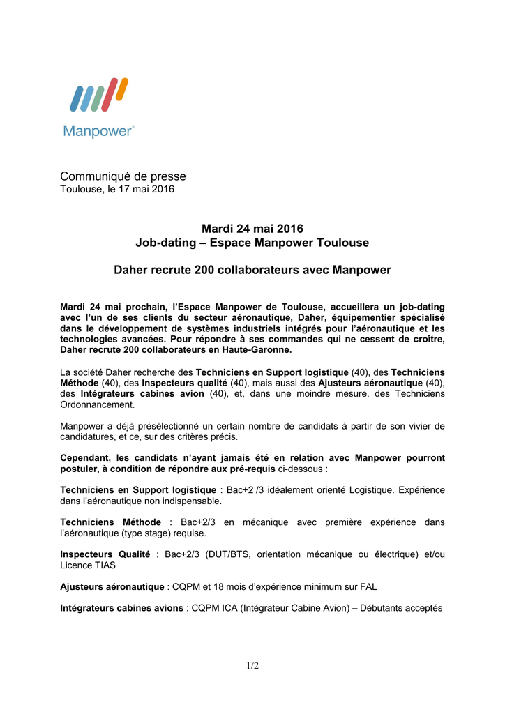 Communiqué de presse Toulouse, le 17 mai 2016 Mardi 24 mai 2016 Job-dating – Espace Manpower Toulouse Daher recrute 200 collaborateurs avec Manpower Mardi 24 mai prochain, l’Espace Manpower de Toulouse, accueillera un job-dating avec l’un de ses clients du secteur aéronautique, Daher, équipementier spécialisé dans le développement de systèmes industriels intégrés pour l’aéronautique et les technologies avancées. Pour répondre à ses commandes qui ne cessent de croître, Daher recrute 200 collaborateurs en Haute-Garonne. La société Daher recherche des Techniciens en Support logistique (40), des Techniciens Méthode (40), des Inspecteurs qualité (40), mais aussi des Ajusteurs aéronautique (40), des Intégrateurs cabines avion (40), et, dans une moindre mesure, des Techniciens Ordonnancement. Manpower a déjà présélectionné un certain nombre de candidats à partir de son vivier de candidatures, et ce, sur des critères précis. Cependant, les candidats n’ayant jamais été en relation avec Manpower pourront postuler, à condition de répondre aux pré-requis ci-dessous : Techniciens en Support logistique : Bac+2 /3 idéalement orienté Logistique. Expérience dans l’aéronautique non indispensable. Techniciens Méthode : Bac+2/3 en mécanique avec première expérience dans l’aéronautique (type stage) requise. Inspecteurs Qualité : Bac+2/3 (DUT/BTS, orientation mécanique ou électrique) et/ou Licence TIAS Ajusteurs aéronautique : CQPM et 18 mois d’expérience minimum sur FAL Intégrateurs cabines avions : CQPM ICA (Intégrateur Cabine Avion) – Débutants acceptés 1/2 Les candidatures devront être envoyées à : [email protected] Manpower reviendra ensuite vers les candidats sélectionnés pour leur proposer un rendezvous lors du job-dating du 24 mai en son Espace de Toulouse. A propos de Manpower France Manpower est une marque de ManpowerGroup qui propose aux entreprises implantées en France des solutions en matière de flexibilité sous la ligne de service Manpower Référence Intérim et des solutions en matière de recrutement permanent sous la ligne de service Manpower Conseil Recrutement. Manpower Référence Intérim est constitué d’un réseau de 700 agences, présentes sur tout le territoire et dans tous les bassins d’emplois, et animé par plus de 3 000 collaborateurs. Manpower Conseil Recrutement est constitué d’un réseau de 70 cabinets de recrutement implantés dans les plus grandes villes de France, et animé par 250 consultants spécialisés par métiers et secteurs d’activité. Avec près de 3 600 collaborateurs permanents, Manpower France a réalisé un chiffre d’affaires de 4 milliards d’euros en 2015. Pour plus d’informations sur Manpower France, visitez le site www.manpower.fr Toutes les actualités de l'emploi, du travail temporaire et de Manpower en direct sur @ManpowerFrance Contact Presse : Julie Gestin Responsable Emploi, Secteur Toulouse-Pyrénées Tél. : 05 61 17 67 75 – E-mail : [email protected] 2/2