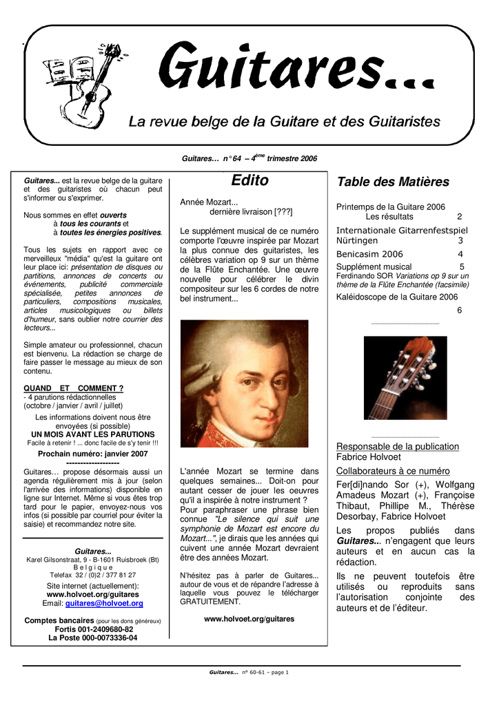 Guitares… La revue belge de la guitare et des guitaristes Guitares… n°64 – 4ème trimestre 2006 Guitares... est la revue belge de la guitare et des guitaristes où chacun peut s'informer ou s'exprimer. Nous sommes en effet ouverts à tous les courants et à toutes les énergies positives. Tous les sujets en rapport avec ce merveilleux "média" qu'est la guitare ont leur place ici: présentation de disques ou partitions, annonces de concerts ou événements, publicité commerciale spécialisée, petites annonces de particuliers, compositions musicales, articles musicologiques ou billets d'humeur, sans oublier notre courrier des lecteurs... Edito Année Mozart... dernière livraison [???] Le supplément musical de ce numéro comporte l'œuvre inspirée par Mozart la plus connue des guitaristes, les célèbres variation op 9 sur un thème de la Flûte Enchantée. Une œuvre nouvelle pour célébrer le divin compositeur sur les 6 cordes de notre bel instrument... Table des Matières Printemps de la Guitare 2006 Les résultats 2 Internationale Gitarrenfestspiel Nürtingen 3 Benicasim 2006 Supplément musical 4 5 Ferdinando SOR Variations op 9 sur un thème de la Flûte Enchantée (facsimile) Kaléidoscope de la Guitare 2006 6 _________________________ Simple amateur ou professionnel, chacun est bienvenu. La rédaction se charge de faire passer le message au mieux de son contenu. QUAND ET COMMENT ? - 4 parutions rédactionnelles (octobre / janvier / avril / juillet) Les informations doivent nous être envoyées (si possible) UN MOIS AVANT LES PARUTIONS _________________________ Facile à retenir ! ... donc facile de s'y tenir !!! Responsable de la publication Fabrice Holvoet Prochain numéro: janvier 2007 ------------------Guitares… propose désormais aussi un agenda régulièrement mis à jour (selon l'arrivée des informations) disponible en ligne sur Internet. Même si vous êtes trop tard pour le papier, envoyez-nous vos infos (si possible par courriel pour éviter la saisie) et recommandez notre site. Guitares... Karel Gilsonstraat, 9 - B-1601 Ruisbroek (Bt) Belgique Telefax 32 / (0)2 / 377 81 27 Site internet (actuellement): www.holvoet.org/guitares Email: [email protected] Comptes bancaires (pour les dons généreux) Fortis 001-2409680-82 La Poste 000-0073336-04 L'année Mozart se termine dans quelques semaines... Doit-on pour autant cesser de jouer les oeuvres qu'il a inspirée à notre instrument ? Pour paraphraser une phrase bien connue "Le silence qui suit une symphonie de Mozart est encore du Mozart...", je dirais que les années qui cuivent une année Mozart devraient être des années Mozart. Collaborateurs à ce numéro N’hésitez pas à parler de Guitares... autour de vous et de répandre l’adresse à laquelle vous pouvez le télécharger GRATUITEMENT. Ils ne peuvent toutefois être utilisés ou reproduits sans l’autorisation conjointe des auteurs et de l’éditeur. www.holvoet.org/guitares Guitares… n° 60-61 – page 1 Fer[di]nando Sor (+), Wolfgang Amadeus Mozart (+), Françoise Thibaut, Phillipe M., Thérèse Desorbay, Fabrice Holvoet Les propos publiés dans Guitares... n’engagent que leurs auteurs et en aucun cas la rédaction. Guitares… La revue belge de la guitare et des guitaristes PRINTEMPS DE LA GUITARE 2006 Les résultats _____________________________________________________________________________________________________________________________________________________________________ La 10ème édition du Concours International d’Interprétation Printemps de la Guitare s'est, comme nous vous l'annoncions dans notre précédente édition déroulé du 22 au 30 septembre au Centre de délassement de Marcinelle. Le programme des épreuves prévoyait que chaque candidat présente en 1ère éliminatoire La La Catedral d’Agustin BARRIOS et un récital libre de 10 minutes. A l'issue de cette épreuve, 18 candidats étaient admis en demi finale: 1 Kresimir BEDEK Croatie 2 Petrit CEKU Croatie 3 Jan DEPRETER Belgique 4 Marie DUBOIS Belgique 5 Runar JAKOBSEN Norvège 6 Irina KULIKOVA Russie 7 Guillaume LACOSTE France 8 Maude LAFOREST France 9 Damien LANCELLE France 10 Cesar LARA Mexique 11 Adrien MAZA France 12 Andrey PARFINOVITCH Russie 13 Anna PIETRZAK Pologne 14 Manuela PUENTE Espagne 15 Natalia RODIONOVA Russie 16 Arturo SORIA Mexique 17 An VOLDERS Belgique 18 Ilya ZAITSEV Russie Une 'grande' sonate [Sonatina meridional de Ponce ou Sonata giocosa de Rodrigo] et 20 minutes de récital plus tard, les finalistes furent désignés pour affronter le jury, le public et l'orchestre lors de la dernière épreuve. And the winners are... 1) Jan Depreter - Belgique 2) Petrit Ceku - Croatie 3) Irina Kulikova - Russie 4) Damien Lancelle - France 5) Kresimir Bedek - Croatie 6) Andre Parfinovich - Russie Pour illustrer ce propos auquel nous n'avons pu assister directement, voici un commentaire à chaud par une de nos fidèles lectrice et collaboratrice à ses heures... Le Printemps de la Guitare … en diagonale … Cette 10è édition, qui a eu lieu au Centre de Délassement de Marcinelle du 22 au 30 septembre 2006, a rassemblé des candidats de haut niveau. Lors des éliminatoires, le vietnamien Tung Cao Sy Anh nous a laissé entendre une merveilleuse pièce du « Léo Brouwer vietnamien » NgocTuan HOANG « Memories of the Highlands », musicalité peaufinée en feu d’artifice sur fond de musique ethnique, un vrai régal. Guitares… n° 64 – page 2 Lors des demi-finales, le russe Ilya Zaitsev présentait son programme avec une technique consommée. Un vrai professionnel – on est tout simplement « heureux » de l’écouter. Quant à la finale avec l’Orchestre Royal de Chambre de Wallonie, on aura eu droit à 3 versions du Concerto en ré majeur Op99 de Castelnuevo-Tedesco : L’interprétation de la russe Irina Kulikova, quoi que « très propre », paraissait bien timide et peu convaincante. Notre compatriote Jan Depreter semblait vouloir se démar