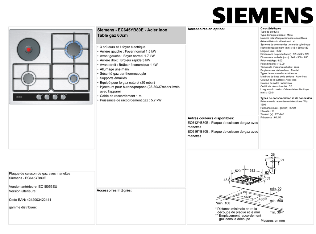 Siemens - EC645YB80E - Acier inox Table gaz 60cm