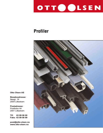 Profiler Otto Olsen AS Besøksadresse: Nesgt. 19 2004 Lillestrøm Postadresse: Postboks 44 2001 Lillestrøm Tlf: 63 89 08 00 Faks: 63 89 08 99 [email protected] www.otto-olsen.no OTTO OLSEN AS Otto Olsen ble etablert i 1886 og er et privat eid aksjeselskap som har 65 ansatte og omsetter for mer enn 200 millioner kroner. Otto Olsen er primært en handelsbedrift som opererer som eneimportør av produkter til industrien og handelen i Norge. Vi representerer mange av de viktigste produsentene. I tillegg har vi en egenproduksjon av produkter i gummi og PTFE. Kataloger Otto Olsen har et meget bredt varesortiment innenfor sine områder, og har laget kataloger som dekker de fleste av produktene. Du kan bestille kataloger ved å kontakte oss på telefon, faks eller e-post. Hvis produktet du søker ikke finnes i en katalog, så ta kontakt med oss. Mulighetene er gode for at vi har produktet, kan produsere det eller kan bestille det fra fabrikk. Otto Olsen holder til i egne, store lokaler på Lillestrøm, med Norges Varemesse som nærmeste nabo. Postadresse: Postboks 44, 2001 Lillestrøm Besøksadresse: Nesg. 19, 2004 Lillestrøm Telefon: 63 89 08 00 Telefaks: 63 89 08 99 [email protected] www.otto-olsen.no Generell informasjon Innledning Katalogen inneholder et bredt utvalg av ekstruderte gummi- og kunststoffprofiler. Profiler leveres i nært sagt “alle” gummimaterialer og utførelser. Hvis du i katalogen ikke finner et produkt som har en slik form eller dimensjon som du søker, ta kontakt med oss. Basert på dine opplysninger vil vi søke oss fram til et eksisterende verktøy på et produkt som er identisk eller tilnærmet likt ditt behov. Skulle dette vise seg vanskelig å finne, vil vi tilby et nytt, skreddersydd verktøy. Ikke bli overrasket om verktøyprisen er lavere enn forventet ! Vi tilbyr: ! Materialkunnskap ! Riktig og funksjonell design ! Konkurransedyktig pris ! Høy servicegrad ! Fleksibilitet ! Leveringspålitelighet Rådgivning og problemløsning er en del av vår service ! Generelt gjelder følgende: • Profiler produsert i kompaktgummi uten innvendig åpning lar seg ikke presse sammen, men vil istedet deformeres. • Graden av deformasjon bestemmes i hovedsak av profilens mulighet for å ekspandere i bredderetningen, avhengig av sporbredde, trykk, gummiens hardhet og gummikvalitet. www.otto-olsen.no • Gummiens hardhet oppgis i Shore A i henhold til DIN-standard 53505. Eksempel: NEO 60 betyr Neoprengummi 60 Shore A. Postadresse: Postboks 44, 2001 Lillestrøm Besøksadresse: Nesg. 19, 2004 Lillestrøm Telefon: 63 89 08 00 Telefaks: 63 89 08 99 [email protected] www.otto-olsen.no 3 Innholdsoversikt Materialegenskaper 6 Eksempel på skjøting 8 Ferdigkappede og sammenlimte profiler 9 Toleransetabeller 10 Rundsnor / O-ring snor Kompaktgummi Svampgummi 11 11 13 Slanger uten armering Silikonslanger Slanger i Fluorgummi Slanger diverse Zero vakuumslange Souplesse laboratorieslange Acida paragummislange Verktøyliste Firkantprofiler Kompaktgummi Svampgummi, ekstrudert / med hud 21 21-22 23-26 Lukepakninger Svampgummi, ekstrudert / med hud Neopren lukepakning etter NS 2511 27 27-28 28 U-profiler Dimensjonsliste Profil-illustrasjoner 29 29-34 35-39 Vindusglidelist 40 P-profiler Dimensjonsliste Profil-illustrasjoner 41 41-42 43-45 T-profiler 46-48 L-profiler 49-53 H-profiler 54 e-profiler 55-56 B-profiler / Brilleprofiler 57-58 www.otto-olsen.no 4 14 14 15 16 16 17 17 18 - 20 Innholdsoversikt Dør- / lukeprofiler 59-62 Profiler til lastebiler og porter 63-64 Gelender- / rekkverksprofiler Containerpakninger Fuge- / spaltetetninger 65-67 68 Klammerprofiler 69-71 Spesialprofiler 72-73 Beskyttelsesprofiler 74-75 Selvklebende tetningslister Tips og råd P- og D- profiler Kronlister Skåret neopren cellegummi, uten hud 76 77 78 78 79-81 Fenderlister D-fendere D-fendere, bestillingsvare Fenderlister, diverse 82-83 83 84-85 86 Trimlister Kantlister Informasjon Kantlister Kantlister med topptetning Kantlister med sidetetning www.otto-olsen.no 64 Klemprofiler Montering Klemprofiler Låsekiler / låselister Verktøy Til klemprofiler Til kapping av profiler 87 88 89 90-92 93-96 97-100 101-102 102 103-109 110 111 112 112 Dør- / vindusprofiler 113-115 Profiloversikt - sortert etter nummer 116-121 5 Sammentrykning av profiler Tetningsprofil av kompaktgummi bør ikke sammenpresses for mye, da den over tid kan miste sin tilbakefjæringskraft og dermed sin tettende funksjon. Tillatt varig belastning av en kompaktgummiprofil på 60 shore A er ca. 1 N/mm2 (10 kp/cm2). Maksimal sammenpressing bør ikke overstige 20 %. Tilsvarende sammenpressing av cellegummiprofil er maks. 40 %. Eksempler på innfesting Spor Skinne Tre innpå Skrue Lime www.otto-olsen.no Klemme fast Nagler Eksempler på ekstruderingsverktøy 7 Eksempel på skjøting Runndsnor/O-ring Slange/slangering www.otto-olsen.no 8 Ferdigkappede og sammenlimte profiler Levering av ferdigkappede profiler Om ønskelig kan vi levere de fleste profiler ferdig kappet i de lengder du ønsker. Toleransetabell side 10. Levering av ferdiglimte eller vulkskjøtte* rammer og ringer Eksempler: Limte/vulkede hjørner Limte/vulkede hjørner www.otto-olsen.no Skrå eller rette sammenføyninger * varmvulkanisert 9 Toleransetabeller Tverrsnitt Leveranser skjer i overenstemmelse med ISO-standard 3302 som i hovedsak er overenstemmende med DIN 7715 del 3. Måltoleranse i forhold til tverrsnitt: Klasse E1 fin Klasse E2 middels Klasse E3 grov Klasse E2 er standard for profiler laget i kompakte materialer. Klasse E1 kan bare opprettholdes i spesielle og kritiske anvendelser og kun i de tilfeller det er produksjonsteknisk mulig. Dette må avtales i hvert enkelt tilfelle. Kompakt gummi (fast) Svampgummi med hud Cellegummi Viton® kompaktgummi Ekstruderte profiler Nominelle mål i mm Klasse E2 Klasse E3 Klasse E3 Klasse E3 Klasse L1 meget fin Klasse L2 middels Klasse L3 grov For profiler produsert i lengder, for fremstilling av rektangulære og andre varianter av profiltetni