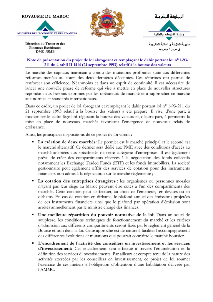 ROYAUME DU MAROC Direction du Trésor et des Finances Extérieures DMC /SMB مديرية الخزينة و المالية الخارجية ب.س. م/ ر.س.ق Note de présentation du projet de loi abrogeant et remplaçant le dahir portant loi n° 1-93211 du 4 rabii II 1414 (21 septembre 1993) relatif à la bourse des valeurs Le marché des capitaux marocain a connu des mutations profondes suite aux différentes réformes menées au cours des deux dernières décennies. Ces réformes ont permis de renforcer son efficience. Néanmoins et dans un esprit de continuité, il est nécessaire de lancer une nouvelle phase de réforme qui vise à mettre en place de nouvelles structures répondant aux besoins exprimés par les opérateurs de marché et à rapprocher ce marché aux normes et standards internationaux. Dans ce cadre, un projet de loi abrogeant et remplaçant le dahir portant loi n° 1-93-211 du 21 septembre 1993 relatif à la bourse des valeurs a été préparé. Il vise, d’une part, à moderniser le cadre législatif régissant la bourse des valeurs et, d’autre part, à permettre la mise en place de nouveaux marchés favorisant l’émergence de nouveaux relais de croissance. Ainsi, les principales dispositions de ce projet de loi visent : La création de deux marchés: Le premier est le marché principal et le second est le marché alternatif. Ce dernier sera dédié aux PME avec des conditions d’accès au marché adaptées aux spécificités de cette catégorie d’entreprises. Il est également prévu de créer des compartiments réservés à la négociation des fonds collectifs notamment les Exchange Traded Funds (ETF) et les fonds immobiliers. La société gestionnaire peut également offrir des services de cotation pour des instruments financiers non admis à la négociation sur le marché réglementé ; La cotation des entreprises étrangères : les organismes ou personnes morales n’ayant pas leur siège au Maroc peuvent être cotés à l’un des compartiments des marchés. Cette cotation peut s’effectuer, au choix de l’émetteur, en devises ou en dirhams. En cas de cotation en dirhams, le plafond annuel des émissions projetées de ces instruments financiers ainsi que le plafond par opération d’émission sont arrêtés annuellement par le ministre chargé des finances. Une meilleure répartition du pouvoir normative de la loi: Dans un souci de souplesse, les conditions techniques de fonctionnement du marché et les critères d’admission aux différents compartiments seront fixés par le règlement général de la Bourse et non dans la loi. Cette approche est de nature à faciliter l’accompagnement des différentes évolutions et mutations que pourrait connaître le marché boursier. L’encadrement de l’activité des conseillers en investissement et les services d’investissement: Cet encadrement sera effectué à travers l’énumération et la définition des services d’investissements. Par ailleurs et compte tenu de la nature des activités exercées par les conseillers en investissement, ce projet de loi soumet l’exercice de ces métiers à l’obligation d’obtention d’une habilitation délivrée par l’AMMC. L’élargissement des activités qui peuvent être exercées par les sociétés de bourse: Ce projet de loi prévoit qu’outre les activités classiques des sociétés de bourse, ces sociétés peuvent exercer des activités connexes aux activités d’intermédiation. Tel est l’objet du présent projet de loi. -2- PROJET DE LOI RELATIF A LA BOURSE DES VALEURS ABROGEANT ET REMPLAÇANT LE DAHIR PORTANT LOI N° 1-93-211 DU 4 RABII II 1414 (21 SEPTEMBRE 1993) RELATIF A LA BOURSE DES VALEURS TEL QUE MODIFIE ET COMPLETE TITRE PREMIER : DEFINITIONS Article premier : La Bourse des valeurs est un marché réglementé par la présente loi et les textes pris pour son application, sur lequel sont négociés publiquement les instruments financiers visés à l’article 3 ci-dessous. La Bourse des valeurs comprend un marché principal et un marché alternatif. Le marché principal comprend au moins quatre compartiments. Les deux premiers compartiments sont destinés à la négociation des titres de capital, le troisième compartiment à la négociation des titres des organismes de placements collectifs tels que définis par la législation en vigueur et le quatrième compartiment dédié à la négociation des titres de créance. Le marché alternatif comprend au moins deux compartiments à fonctionnement allégé dédiés respectivement à la négociation des titres de capital et des titres de créance émis par des petites et moyennes entreprises. Les critères définissant cette catégorie d’entreprises sont précisés au niveau du règlement général de la Bourse visé à l’article 5 de la présente loi. Les conditions d’accès, d’admission et de séjour dans les différents compartiments des deux marchés sont définies au règlement général de la bourse des valeurs visé à l’article 5 de la présente loi. Article 2: La société gestionnaire visée à l’article 4 de la présente loi peut créer des compartiments supplémentaires pour la cotation des instruments financiers visés à l’article 3 ci-dessous. Elle peut également procéder à la modification ou à la suppression de ces compartiments. Les modalités de création, de modification, de fonctionnement de ces compartiments ainsi que les conditions de leur suppression sont définies au niveau du règlement général de la bourse visé à l’article 5 de la présente loi. Article 3 : Pour l’application de la présente loi, on entend par : 1. Instruments financiers : les instruments financiers tels que définis par l’article 2 de la loi n°44-12 relative à l’appel public à l’épargne et aux informations exigées des personnes morales et organismes faisant appel public à l'épargne tel que modifiée et complétée, à l’exclusion des instruments financi