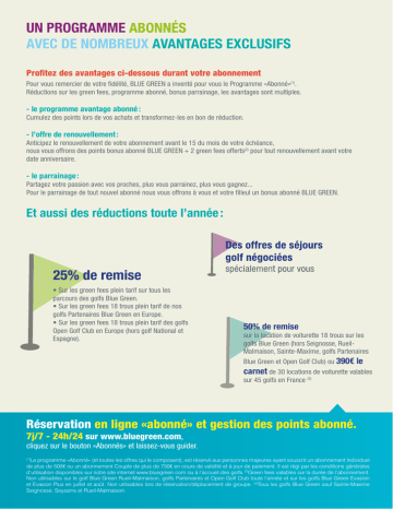 UN PROGRAMME AVEC DE NOMBREUX AVANTAGES EXCLUSIFS Profitez des avantages ci-dessous durant votre abonnement Pour vous remercier de votre fidélité, BLUE GREEN a inventé pour vous le Programme «Abonné»(1). Réductions sur les green fees, programme abonné, bonus parrainage, les avantages sont multiples. - le programme avantage abonné : Cumulez des points lors de vos achats et transformez-les en bon de réduction. - l’offre de renouvellement : Anticipez le renouvellement de votre abonnement avant le 15 du mois de votre échéance, nous vous offrons des points bonus abonné BLUE GREEN + 2 green fees offerts(2) pour tout renouvellement avant votre date anniversaire. - le parrainage : Partagez votre passion avec vos proches, plus vous parrainez, plus vous gagnez... Pour le parrainage de tout nouvel abonné nous vous offrons à vous et votre filleul un bonus abonné BLUE GREEN. Et aussi des réductions toute l’année : 25% de remise • Sur les green fees plein tarif sur tous les parcours des golfs Blue Green. • Sur les green fees 18 trous plein tarif de nos golfs Partenaires Blue Green en Europe. • Sur les green fees 18 trous plein tarif des golfs Open Golf Club en Europe (hors golf National et Espagne). 50% de remise sur la location de voiturette 18 trous sur les golfs Blue Green (hors Seignosse, RueilMalmaison, Sainte-Maxime, golfs Partenaires Blue Green et Open Golf Club) ou 390€ le carnet de 30 locations de voiturette valables sur 45 golfs en France (3) Réservation en ligne «abonné» et gestion des points abonné. 7j/7 - 24h/24 sur www.bluegreen.com, cliquez sur le bouton «Abonnés» et laissez-vous guider. Le programme «Abonné» (et toutes les offres qui le composent), est réservé aux personnes majeures ayant souscrit un abonnement Individuel de plus de 500€ ou un abonnement Couple de plus de 750€ en cours de validité et à jour de paiement. Il est régi par les conditions générales d’utilisation disponibles sur notre site internet www.bluegreen.com ou à l’accueil des golfs.(2)Green fees valables sur la durée de l’abonnement. Non utilisables sur le golf Blue Green Rueil-Malmaison, golfs Partenaires et Open Golf Club toute l’année et sur les golfs Blue Green Evasion et Evasion Plus en juillet et août. Non utilisables lors de réservation/déplacement de groupe. (3)Tous les golfs Blue Green sauf Sainte-Maxime Seignosse, Seyssins et Rueil-Malmaison. (1) BLUE GREEN, DES GOLFS QUI FONT DÉCOUVRIR LEUR DIVERSITÉ 94 FIVE NATIONS Avrillé (49) Bordeaux Pessac (33) Caen (14) Grand Rodez (12) Grenoble Seyssins (38) Guerville (78) Lac au Duc (56) La Domangère (85) Marolles-en-Brie (94) Mazières-en-Gâtine (79) Mignaloux (86) Nantes Erdre (44) Niort Romagné (79) Pau Artiguelouve (64) Tours Ardrée (37) Val d’Amour (39) Villeray (91) Bordeaux-Lac (33) Grand Lyon Chassieu (69) L’Académie (83) Lille Métropole (59) Quetigny Grand Dijon (21) Rennes Saint-Jacques (35) Rueil-Malmaison (92) Saint-Aubin (91) Saint-Étienne (42) St-Quentin-en-Yvelines (78) Savenay (44) Villennes-sur-Seine (78) Baden (56) Domaine des Forges (79) Dunkerque (59) Les Fontenelles (85) Gujan-Mestras (33) Houlgate (14) La Marterie (24) Le Croisic (44) L’Odet (29) Plœmeur Océan (56) Pornic (44) Port Bourgenay (85) Rhuys-Kerver (56) Val Quéven (56) Bellefontaine (95) Estérel (83) Pléneuf-Val-André (22) Sainte-Maxime (83) Saint-Laurent (56) Seignosse (40) ALCAIDESA ARAVELL LAURO COSTA BRAVA GIRONA ESTEPONA Bagnoles de l’Orne (61) Bretesche (44) Château des Vigiers (24) Cap-Ferret (33) Etiolles Country Club (91) Eauze (32) Kerbernez (29) La Bosse (41) La Forge (24) La Prèze (16) La Marionnière (44) Lolivarie (24) Omaha Beach (14) Périgueux (24) Saint-Malo (35) Valenciennes (59) Vire - La Dathée (14) — Durbuy (Belgique) Five Nations (Belgique) Alcaidesa (Espagne) Aravell (Espagne) Costa Brava (Espagne) Estepona (Espagne) Girona (Espagne) Lauro (Espagne) Almkreek (Pays-Bas) De Efteling (Pays-Bas) Dorhout Mess (Pays-Bas) GC Heelsum (Pays-Bas) Liste à jour au 01/11/2015, susceptible de modification. Golf Blue Green Sainte-Maxime Route du Débarquement - BP1 - 83120 SAINTE-MAXIME Tél. 04 94 55 02 02 [email protected] LA CHAÎNE BLUE GREEN SUIVEZ-NOUS SUR FACEBOOK Blue Green, des golfs qui font aimer le golf. www.bluegreen.com Bluegreen.com | 2015 | Document non contractuel | Photos : Blue Green / Thinkstock.com. DURBUY TARIFS GOLF 2016 BLUE GREEN, DES GOLFS QUI FONT AIMER LE GOLF Golf Blue Green SAINTE-MAXIME Route du Débarquement - BP1 - 83120 SAINTE-MAXIME Tél. 04 94 55 02 02 [email protected] www.sainte-maxime.bluegreen.com Abonnement Exclusive 12 mois comptant prélèvement Individuel Couple 26-35 ans individuel 26-35 ans couple Jeune -26 ans Jeune -18 ans(1) Enfant -12 ans(1) 2580€ 4050€ 2240€ 3510€ 1285€ 400€ 200€ 226,40€/mois (2716,80€) 355,30€/mois (4263,60€) 196,50€/mois (2358€) 307,90€/mois (3694,80€) 112,80€/mois (1353,60€) - (2) Exclusive 10 mois Individuel Couple (3) Exclusive 6 mois Individuel Couple (4) Côte d’Azur 12 mois Individuel Couple comptant prélèvement 2330€ 3555€ 204,40€/mois (2452,80€) 311,90€/mois (3742,80€) comptant prélèvement 1750€ 2720€ 307,10€/mois (1843,20€) 477,20€/mois (2863,20€) comptant prélèvement 2665€ 4285€ 233,80€/mois (2805,60€) 375,90€/mois (4510,80€) 2849€ 4690€ 250€/mois (3000€) 411,50€/mois (4938€) (5) France PREMIUM 12 mois Individuel Couple Autre Frais de dossier (pour toute souscription d’abonnement) 35€/pers. Licence Adulte Jeune adulte (né entre 1991 à 1997) Jeune (né entre 1998 et 2003) Enfant (né à partir de 2004 inclus) 52€+5€(5) 28€+2€(5) 17€+2€(5) 14€+2€(5) Tous nos abonnements commencent le 1er du mois, une cotisation achetée en cours de mois déclenchera un prorata temporis pour le mois en cours. Abonnements couple valables uniquement sur présentation d’un justificatif. Une pièce d’identité