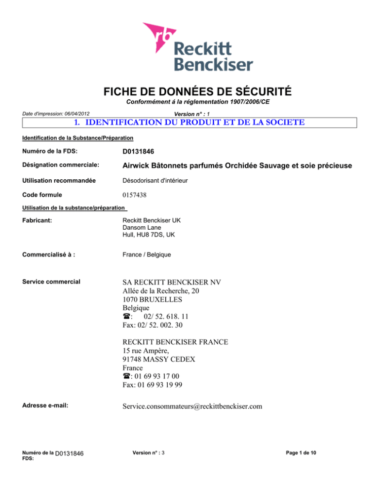 FICHE DE DONNÉES DE SÉCURITÉ Conformément á la réglementation 1907/2006/CE Date d'impression: 06/04/2012 Version n° : 1 1. IDENTIFICATION DU PRODUIT ET DE LA SOCIETE Identification de la Substance/Préparation Numéro de la FDS: D0131846 Désignation commerciale: Airwick Bâtonnets parfumés Orchidée Sauvage et soie précieuse Utilisation recommandée Désodorisant d'intérieur Code formule 0157438 Utilisation de la substance/préparation Fabricant: Reckitt Benckiser UK Dansom Lane Hull, HU8 7DS, UK Commercialisé à : France / Belgique Service commercial SA RECKITT BENCKISER NV Allée de la Recherche, 20 1070 BRUXELLES Belgique : 02/ 52. 618. 11 Fax: 02/ 52. 002. 30 RECKITT BENCKISER FRANCE 15 rue Ampère, 91748 MASSY CEDEX France : 01 69 93 17 00 Fax: 01 69 93 19 99 Adresse e-mail: Numéro de la D0131846 FDS: [email protected] Version n° : 3 Page 1 de 10 FICHE DE DONNÉES DE SÉCURITÉ Conformément á la réglementation 1907/2006/CE Numéro de téléphone d'appel d'urgence: France : ORFILA : 01 45 42 59 59 Belgique : Centre Antipoisons c/o Hôpital Militaire Reine Astrid Rue Bruyn 1, 1120 BRUXELLES Belgique 070/ 245.245 2. IDENTIFICATION DES DANGERS Symbole(s) Xi - Irritant Dangers les plus importants Phrase(s) de risque R36/38 - Irritant pour les yeux et la peau. R43 – Peut entrainer une sensibilisation par contact avec la peau. Combinaison des phrases de risque: R52/53 - Nocif pour les organismes aquatiques, peut entraîner des effets néfastes à long terme pour l'environnement aquatique. contient 3-(p-methoxyphenyl)-2-methylpropionaldehyde, GERANIOL, 2,4-dimethyl-3-cyclohexene carbaldehyde, Alpha-Isomethyl Ionone and Linalool. 3. COMPOSITION/INFORMATION SUR LES COMPOSANTS Ce produit contient : Component 2-Propanol, 1butoxyCyclohexanol, 4(1,1-dimethylethyl)-, acetate Linalool Cyclohexanol, 2(1,1-dimethylethyl)-, Date de révision 10/4/2012 CAS No. 5131-66-8 EINECS No. Registration % in Number Product Not available 15-20 Xi, 36/38 32210-23-4 250-954-9 Not available 5-10 N R51/53 78-70-6 88-41-5 201-134-4 201-828-7 Not available 5-10 Not available 1-5 Xi, R38 N R51/53 Numéro de la FDS: D0131846 Version n° : 1 Classification Désignation commerciale: Airwick Bâtonnets Orchidée Sauvage et soie précieuse Page 2 de 10 FICHE DE DONNÉES DE SÉCURITÉ Conformément á la réglementation 1907/2006/CE acetate Terpineol 8000-41-7 Ionone, methyl1335-46-2 Alpha-Isomethyl Ionone 127-51-5 3-(p 5462-06-6 methoxyphenyl)-2-methylprop ionaldehyde Benzeneethanol 60-12-8 3-Buten-2-one, 414901-07-6 (2,6,6-trimethyl-1cyclohexen-1-yl)Cyclohexanepropan 83926-73-2 ol, .alpha.,.alpha.dimethyl4,7-Methano-1Hinden2500-83-6 5-ol, 3a,4,5,6,7,7ahexahydro-, acetate Geraniol 106-24-1 2(3H)-Furanone, 5104-67-6 heptyldihydro2,4-dimethyl-3-cylcohexene 68039-49-6 carbaldehyde (2,5-Dimethyl-2,3285977-85-7 dihydro-1H-inden2-yl)methanol 2-Buten-1-ol, 228219-61-6 ethyl-4-(2,2,3trimethyl-3cyclopenten-1-yl)- 232-268-1 215-635-0 204-846-3 226-749-5 Not available Not available Not available Not available 200-456-2 238-969-9 Not available 1-5 Not available 0.1-1 Xi, R36 N R51/53 Not available 0.1-1 Xi, N R41,51/53 219-700-4 Not available 0.1-1 R52/53 203-377-1 203-225-4 Not available 0.1-1 Not available 0.1-1 Xi, R38, 41, 43 N R51/53 268-264-1 Not available 0.1-1 Xi, 36/38,43,52/53 Not available 0.1-1 Xi R36, R52/53 Not available 0.1-1 Xi, N, R38, R50/53 248-908-8 1-5 1-5 1-5 1-5 Xi, R38 N R51/53 R52/53 Xi, R43 D'autres ingrédients peuvent être présents comme mentionne´ dans la declaration relative aux ingredients sur l'emballage. Pour le texte complet des phrases R / Phrases-H mentionnées dans cet article, voir chapitre 16. Date de révision 10/4/2012 Numéro de la FDS: D0131846 Version n° : 1 Désignation commerciale: Airwick Bâtonnets Orchidée Sauvage et soie précieuse Page 3 de 10 FICHE DE DONNÉES DE SÉCURITÉ Conformément á la réglementation 1907/2006/CE 4. PREMIERS SECOURS Conseils généraux En cas de contact avec les yeux, la peau ou suite à une ingestion, un examen immédiat médical est recommandé. Contact avec la peau Enlever tout vêtement contaminé et les laver. Laver immédiatement et abondamment à l'eau, en utilisant du savon si possible. Si des signes de lésion de la peau ou une irritation est apparente, demander l’avis d’un médecin immédiatement. Contact avec les yeux Rincer immédiatement et abondamment à l'eau, pendant au moins 10 minutes, y compris sous les paupières. Si les troubles se prolongent, consulter un médecin. Inhalation En cas d’inhalation excessive, amener la victime à l'air libre et la laisser se reposer dans une position confortable. Demander l’avis d’un médecin immédiatement. Ingestion Rincer la bouche. Faire boire beaucoup d'eau ou de lait pour diluer le contenu de l’estomac. Ne PAS faire vomir. Faire immédiatement appel à une assistance médicale. Avis aux médecins Traiter de façon symptomatique 5. MESURES DE LUTTE CONTRE L'INCENDIE Point d'éclair: Voir section 9 Moyen d'extinction approprié: Dioxyde de carbone (CO2). Poudre d'extinction. Equipement de protection pour lutter contre l'incendie Pas d’équipement spécial requis. Dangers spécifiques Le liquide n’est pas classé inflammable mais peut alimenter un incendie. Date de révision 10/4/2012 Numéro de la FDS: D0131846 Version n° : 1 Désignation commerciale: Airwick Bâtonnets Orchidée Sauvage et soie précieuse Page 4 de 10 FICHE DE DONNÉES DE SÉCURITÉ Conformément á la réglementation 1907/2006/CE 6. MESURES À PRENDRE EN CAS DE DISPERSION ACCIDENTELLE Méthodes de nettoyage : Voir aussi sections 8 et 13 Le contact du parfum avec des surfaces peut les endommager : essuyer immédiatement si cela a lieu. Enlever toute source d’ignition. Fournir une ventilation appropriée. Absorber le liquide déversé. Précautions pour la protection de Éviter que le produit arrive dans les égouts. l'environnement: 7. MANIPULATION ET STOCKAGE Manipulation: Eviter le contact av