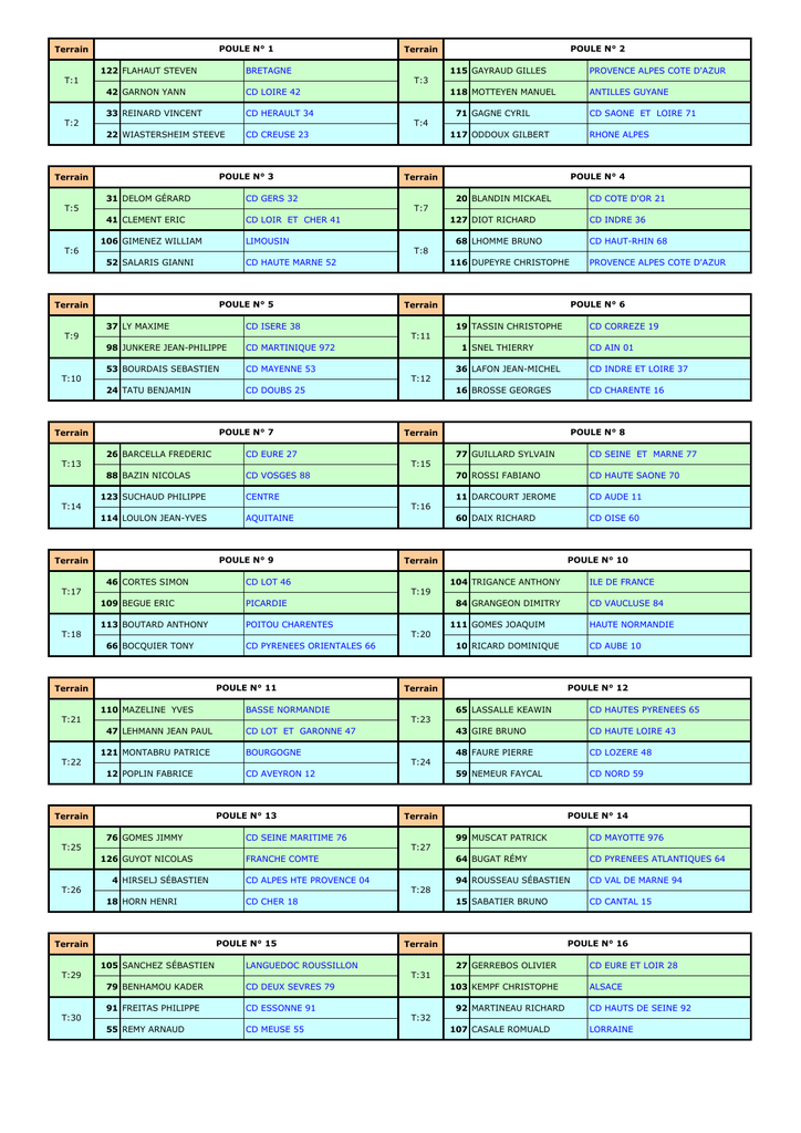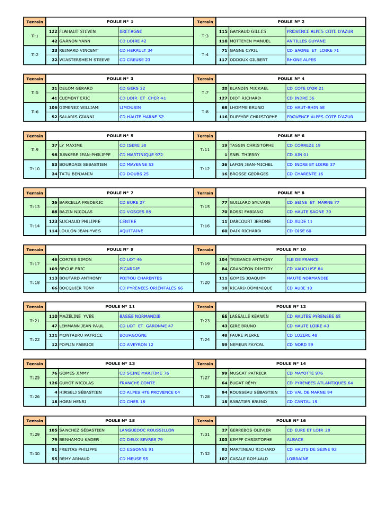 POULE N° 1 Terrain 122 FLAHAUT STEVEN BRETAGNE T:1 POULE N° 2 Terrain 115 GAYRAUD GILLES PROVENCE ALPES COTE D'AZUR 118 MOTTEYEN MANUEL ANTILLES GUYANE T:3 42 GARNON YANN CD LOIRE 42 33 REINARD VINCENT CD HERAULT 34 T:2 71 GAGNE CYRIL CD SAONE ET LOIRE 71 T:4 22 WIASTERSHEIM STEEVE CD CREUSE 23 POULE N° 3 Terrain 117 ODDOUX GILBERT POULE N° 4 Terrain CD GERS 32 31 DELOM GÉRARD T:5 RHONE ALPES 20 BLANDIN MICKAEL CD COTE D'OR 21 T:7 41 CLEMENT ERIC CD LOIR ET CHER 41 106 GIMENEZ WILLIAM 127 DIOT RICHARD LIMOUSIN T:6 CD INDRE 36 68 LHOMME BRUNO CD HAUT-RHIN 68 T:8 52 SALARIS GIANNI CD HAUTE MARNE 52 POULE N° 5 Terrain 37 LY MAXIME 116 DUPEYRE CHRISTOPHE POULE N° 6 Terrain CD ISERE 38 T:9 PROVENCE ALPES COTE D'AZUR 19 TASSIN CHRISTOPHE CD CORREZE 19 T:11 98 JUNKERE JEAN-PHILIPPE CD MARTINIQUE 972 53 BOURDAIS SEBASTIEN CD MAYENNE 53 T:10 1 SNEL THIERRY CD AIN 01 36 LAFON JEAN-MICHEL CD INDRE ET LOIRE 37 16 BROSSE GEORGES CD CHARENTE 16 T:12 24 TATU BENJAMIN CD DOUBS 25 POULE N° 7 Terrain 26 BARCELLA FREDERIC CD EURE 27 88 BAZIN NICOLAS CD VOSGES 88 T:13 POULE N° 8 Terrain 77 GUILLARD SYLVAIN CD SEINE ET MARNE 77 70 ROSSI FABIANO CD HAUTE SAONE 70 11 DARCOURT JEROME CD AUDE 11 60 DAIX RICHARD CD OISE 60 T:15 123 SUCHAUD PHILIPPE CENTRE T:14 T:16 114 LOULON JEAN-YVES AQUITAINE POULE N° 9 Terrain 46 CORTES SIMON CD LOT 46 T:17 POULE N° 10 Terrain 104 TRIGANCE ANTHONY ILE DE FRANCE T:19 109 BEGUE ERIC PICARDIE 113 BOUTARD ANTHONY POITOU CHARENTES T:18 84 GRANGEON DIMITRY CD VAUCLUSE 84 111 GOMES JOAQUIM HAUTE NORMANDIE T:20 66 BOCQUIER TONY CD PYRENEES ORIENTALES 66 POULE N° 11 Terrain 110 MAZELINE YVES 10 RICARD DOMINIQUE POULE N° 12 Terrain BASSE NORMANDIE T:21 CD AUBE 10 65 LASSALLE KEAWIN CD HAUTES PYRENEES 65 43 GIRE BRUNO CD HAUTE LOIRE 43 48 FAURE PIERRE CD LOZERE 48 59 NEMEUR FAYCAL CD NORD 59 T:23 47 LEHMANN JEAN PAUL 121 MONTABRU PATRICE CD LOT ET GARONNE 47 BOURGOGNE T:22 T:24 12 POPLIN FABRICE CD AVEYRON 12 POULE N° 13 Terrain 76 GOMES JIMMY CD SEINE MARITIME 76 T:25 POULE N° 14 Terrain 99 MUSCAT PATRICK CD MAYOTTE 976 64 BUGAT RÉMY CD PYRENEES ATLANTIQUES 64 94 ROUSSEAU SÉBASTIEN CD VAL DE MARNE 94 15 SABATIER BRUNO CD CANTAL 15 T:27 126 GUYOT NICOLAS 4 HIRSELJ SÉBASTIEN FRANCHE COMTE CD ALPES HTE PROVENCE 04 T:26 T:28 18 HORN HENRI CD CHER 18 POULE N° 15 Terrain 105 SANCHEZ SÉBASTIEN LANGUEDOC ROUSSILLON T:29 POULE N° 16 Terrain 27 GERREBOS OLIVIER CD EURE ET LOIR 28 T:31 79 BENHAMOU KADER CD DEUX SEVRES 79 91 FREITAS PHILIPPE CD ESSONNE 91 T:30 103 KEMPF CHRISTOPHE 92 MARTINEAU RICHARD ALSACE CD HAUTS DE SEINE 92 T:32 55 REMY ARNAUD CD MEUSE 55 107 CASALE ROMUALD LORRAINE POULE N° 17 Terrain CD MEURTHE ET MOSELLE 54 54 POIRET ERIC T:33 POULE N° 18 Terrain 9 STEIS FRANCIS CD ARIEGE 09 T:35 125 PALAZON JOSÉ CORSE 49 DELORME ANDRÉ CD MAINE ET LOIRE 49 T:34 67 BOHN PATRICK CD BAS-RHIN 67 45 LEMAIRE ANTHONY CD LOIRET 45 90 VIEIRA EMMANUEL CD TERRITOIRE BELFORT 90 T:36 78 PIERROT GEZIM CD YVELINES 78 POULE N° 19 Terrain 28 VERGOZ STÉPHANE CD FINISTERE 29 T:37 POULE N° 20 Terrain 83 BANDINI ERIC CD VAR 83 30 BENAMRA MOHAMED CD HTE GARONNE 31 39 SECRETANT ALAIN CD JURA 39 50 LE CANN IVAN CD MANCHE 50 T:39 112 RENARD GAYLOR PAYS DE LA LOIRE 80 KUBLER KEVIN CD SOMME 80 T:38 T:40 73 VIALLET ANDRÉ CD SAVOIE 73 POULE N° 21 Terrain NLLE CALEDONIE 988 102 WEMA GLENN T:41 POULE N° 22 Terrain 61 LANGLOIS YOHANN CD ORNE 61 23 GARGAUD XAVIER CD DORDOGNE 24 74 PERRET MICHEL CD HAUTE SAVOIE 74 51 HARNICK CHRISTOPHE CD MARNE 51 T:43 58 BRIOUDE CHRISTIAN CD NIEVRE 58 32 HOFFMANN PIERRE CD GIRONDE 33 T:42 T:44 69 AMIRAULT EMILIEN CD RHONE 69 POULE N° 23 Terrain 85 VINCENDEAU JAMES CD VENDEE 85 T:45 POULE N° 24 Terrain 120 FAZZINO CHRISTIAN AUVERGNE T:47 8 MASUY MICKAEL CD ARDENNES 08 14 FOUCHER ROMUALD 25 QUILES SERGE CD CALVADOS 14 T:46 CD DROME 26 119 CORDIER GAETAN HAUTS de FRANCE 124 LAURENT FREDERIC CHAMPAGNE ARDENNE T:48 95 DEROLEZ ANDRÉ CD VAL D'OISE 95 POULE N° 25 Terrain 3 PINTO MIGUEL CD ALLIER 03 T:49 POULE N° 26 Terrain 93 LEPERCQ PATRICK CD SEINE ST DENIS 93 T:51 44 PERROCHAUD VINCENT CD LOIRE ATLANTIQUE 44 87 BOUSSAT RENAUD CD HAUTE VIENNE 87 T:50 5 BOIN JEAN 101 FUCHON JAMES CD HAUTES ALPES 05 FEDERATION POLYNESIENNE T:52 82 SAMARA JACQUES CD TARN ET GARONNE 82 POULE N° 27 Terrain 38 PEYROT ALAIN 63 GAUTHIER HUGO POULE N° 28 Terrain CD ISERE 38 T:53 CD PUY de DOME 63 128 ROCHER BRUNO PAYS DE LA LOIRE 108 LELLOUCHE KEVIN MIDI PYRENEES T:55 96 SANTIAGO ANTOINE CD CORSE DU SUD 2A 72 VEAU FLORIAN CD SARTHE 72 T:54 17 MONIER JEROME CD CHARENTE MARITIME 17 97 FERRARI ANGE CD HAUTE CORSE 2B T:56 34 LAUNAY CÉDRIC CD ILLE ET VILAINE 35 POULE N° 29 Terrain 35 MARGOT CHRISTOPHE CD INDRE 36 T:57 POULE N° 30 Terrain 81 BENAZETH LAURENT CD TARN 81 T:59 29 STIEVENART PHILIPPE CD GARD 30 21 DEVEMY JAMES CD COTES D'ARMOR 22 T:58 6 LAKHAL KHALED 100 VALAO SOANE USU CD ALPES MARITIMES 06 WALLIS ET FUTUNA T:60 86 PROUX BRUNO CD VIENNE 86 POULE N° 31 Terrain 62 DECROIX STÉPHANE CD PAS DE CALAIS 62 57 PISPICO TONY CD MOSELLE 57 40 DELMAS STÉPHANE CD LANDES 40 T:61 56 COPPOLA ANGELO CD MORBIHAN 56 POULE N° 32 Terrain 13 SCARDILLI MAURICE CD BOUCHES du RHONE 13 T:63 T:62 2 DROUILLET MAXIME 89 CHERTIER ERIC CD AISNE 02 CD YONNE 89 T:64 75 MALBEC KÉVIN CD COMITE DE PARIS 75 7 JULIEN JEAN-PIERRE CD ARDECHE 07