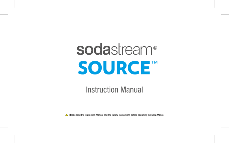 Now you can simply turn tap water into your favorite sparkling drink in seconds. SodaStream is the new way to enjoy delicious bubbles without the bottles Intuitive and easy experience with new Snap-Lock bottle mechanism. Choose your carbonation level with LED indicator. Enjoy great soda at home, ready in just seconds. 100+ flavours to choose from. FOR YOUR SAFETY It is important that you read and understand all use and care instructions and the important safety information before operating the Drinks Maker. IMPORTANT SAFEGUARDS 1. Close supervision is necessary when the Drinks Maker is used near children. Keep out of reach of children. 2. WARNING: DO NOT expose the carbonating bottles to temperatures above 120°F (49°C) or below 34°F (1°C). DO NOT wash the carbonating bottles in the dishwasher and DO NOT rinse the bottle in hot water. DO NOT place the bottles in the freezer. Doing so will compromise the integrity of the carbonating bottle material and may result in serious personal injury. 3. WARNING: DO NOT use the Drinks Maker to carbonate any liquids other than plain water. Add flavour only after carbonation. 4. WARNING: DO NOT carbonate with any bottle not specifically designed to work with this Drinks Maker. Only SodaStream 1 Liter PET bottles are designed to work with this Drinks Maker. SAVE THESE INSTRUCTIONS AND PROVIDE THEM TO ANY SUBSEQUENT USERS BEFORE THE MACHINE IS USED. GENERAL WARNINGS DANGER: Misuse of this Drinks Maker may result in serious personal injury. WARNING: DO NOT use the Drinks Maker if it is not in its upright position as dangerous levels of CO2 may accumulate in bottle. DO NOT carbonate an empty bottle. WARNING: Carbonating bottle must be properly in place before operating the Drinks Maker. DO NOT move the Drinks Maker during the carbonation process. DO NOT remove the carbonating bottle during the carbonation process. WARNING: DO NOT use the Drinks Maker for anything other than carbonating water. Use of this Drinks Maker for any unintended purposes may result in serious personal injury. WARNING: Always use the Drinks maker on a flat, stable, heat-resistant surface away from sources of heat. DO NOT place the Drinks maker on a hot surface (e.g., heating plate) and never use it close to an open flame. To reduce the risk of personal injury or property damage, any servicing other than cleaning and user maintenance should be performed by a SodaStream-authorised service representative. CO2 CYLINDERS WARNING: The cylinder should be inspected prior to use for any dents, punctures, or other damage. If any are detected, DO NOT use the cylinder and contact a SodaStream-authorised service representative. WARNING: Mishandling the cylinder can result in serious personal injury. Always keep cylinder away from any heat source and out of direct sunlight. DO NOT transport the Drinks Maker with the cylinder in place. DO NOT tamper with the cylinder in any way. DO NOT attempt to puncture or incinerate the cylinder. DO NOT throw the cylinder or cause it to fall. DO NOT handle a cylinder while it is discharging CO2. BOTTLES WARNING: DO NOT carbonate with any bottle not specifically designed to work with this Drinks Maker. Only SodaStream 1 Litre PET bottles are designed to work with this Drinks Maker. SodaStream glass bottles and 0.5 Litre PET bottles should not be used with this Drinks Maker, as they are not designed to work with this model. WARNING: DO NOT expose the carbonating bottles to temperatures above 120°F (49°C) or below 34°F (1°C). DO NOT wash the SodaStream carbonating bottles in the dishwasher and DO NOT rinse the bottle in hot water. DO NOT place the bottle next to a heat source such as your kitchen stove. DO NOT leave the bottles in your car. DO NOT place the bottles in the freezer. Doing so will compromise the integrity of the carbonating bottle material and may result in serious personal injury. WARNING: DO NOT use carbonating bottles if changes in shape have occurred, as that indicates the bottle is damaged. DO NOT use bottles that are scratched, worn, discolored, or damaged in any way. WARNING: SodaStream carbonating bottles are clearly marked with an expiration date near the base of the bottle. DO NOT use bottles after this date. Replace and recycle expired bottles in accordance with local recycling laws. CARBONATION WARNING: DO NOT add flavouring prior to carbonation. WARNING: DO NOT carbonate an empty bottle. Close adult supervision is required when the product is used near children. Drinks Maker must be in an upright position when in use. Source Overview 3 Get Started 4 Make Sparkling Water 5-7 Make Sparkling Drinks: Add Flavouring 7 Care 8 Replace Your Cylinder & Specifications 8 Troubleshooting 9-10 Warranty And Legal Information 10-11 Français Deutsch 12 Italiano 34 23 SOURCE OVERVIEW Carbonation LED Indicator SodaStream Source Carbonating Block Back cover Snap-Lock Bottle Mechanism Bottle Loader Tab Carbonating Tube Base 60L CO2 Cylinder Reusable BPA-Free Carbonating Bottle with FizzPreserving Cap Flavour Samples GET STARTED – ASSEMBLY 1. Place Drinks Maker on flat, sturdy surface, in an upright position. Remove packaging materials. To remove back cover: (i) Put your index finger in the hole;(ii) Grasp back cover; and (iii) Pull away from unit. Set cover aside. 2. Remove seal and cap from cylinder. Tip Drinks maker forward and insert 60L* cylinder into Drinks Maker: first downward into the hole in the base of the Drinks Maker, and then upward into the valve fitting. 3. Turn cylinder clockwise until it stops. Hand-tighten only; DO NOT use tools. 4. Reinstall back cover: tilt back cover toward you; insert bottom tab into slot and push the cover into place. * The 60L cylinders produce up to 60 litres of sparkling drinks, depending on the level of carbonation and type of Drinks Maker used. MAKE SPARKLING WATER 1. Rinse the bottle before using it for the first time. Prior to making sparkling drinks, fill carbonating bottles with tap water up to the 