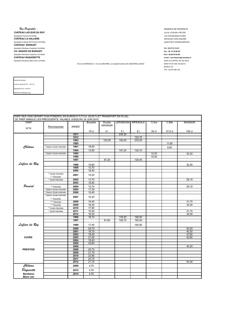Nos Propriétés : RESERVE DE PROPRIETE CHÂTEAU LAFLEUR DU ROY Loi du 12.05.80 n°80 335 Appellation Pomerol Contrôlée Les marchandises livrées CHÂTEAU LA VALLIERE demeurent notre propriété Appellation Lalande de Pomerol Contrôlée jusqu'à leur complet paiement CHÂTEAU BOSSUET Appelation Bordeaux Supérieur Contrôlée Tél : 05.57.51.74.57. CH. GRAVES DE BOSSUET Fax : 05. 57.25.99.95. Appelation Bordeaux Supérieur Contrôlée Port : 06.84.54.52.88. CHÂTEAU PAQUERETTE e-mail : sarl.dubost.l@ wanadoo.fr Appelation Bordeaux Blanc Sec Contrôlée SARL AU CAPITAL DE 232 000 € 30 km de BORDEAUX, 1 km de LIBOURNE, sur départementale 244 LIBOURNE-LUSSAC SIRET N°351 995 162 00010 RC89 B 153 TVA : 42.351.995.162 Heures de Bureau : Lundi au Jeudi 9/12 H - 14/17 H. Vendredi 9/12 H -14/16 H, VISITES sur Rendez-vous TARIF DES VINS DEPART CHAI POMEROL EN EUROS H.T.(T.V.A. 20,00 % ET TRANSPORT EN PLUS). CE TARIF ANNULE LES PRECEDENTS, VALABLE JUSQU'AU 30 JUIN 2015. TARIF Bouteille Double JEROBOAM IMPERIALE MAGNUM Récompenses ANNEE N°74 75 cl 3 l. 5 l. 6.l 1971 235,30 1972 153,70 1983 120,00 192,00 230,50 1985 Citation Guide Hachette 1991 18,90 Château Citation Guide Hachette Lafleur du Roy ** Guide Hachette 11,60 9,80 128,10 10,20 10,20 67,20 32,30 126,40 32,30 28,10 *** Decanter Citation Guide Hachette 2004 2005 2006 13,70 17,30 15,40 28,10 2007 15,20 2008 2009 2010 2011 2012 1996 1997 15,40 16,30 17,90 15,40 16,30 18,10 1999 2000 2001 2002 2003 2004 2005 2006 2008 2009 2010 2011 2012 17,40 24,70 19,70 18,40 21,00 18,40 23,60 2009 4,70 2013 2014 4,70 4,70 *** Decanter ** Guide Hachette * Guide Hachette Bordeaux Blanc sec 150 cl 13,70 15,80 *** Decanter Château Pâquerette 37,5 cl 15,20 **** Decanter PRESTIGE 15,80 13,70 18,40 50 cl 2002 2003 Citation Guide Hachette CUVEE 1998 1999 2000 107,20 MAGNUM 2001 Citation Guide Hachette Lafleur du Roy 13,00 ½ Blle * Guide Hachette *** Decanter Pomerol 1994 1995 1996 1997 ½ litre 31,70 33,40 31,70 33,40 81,60 139,20 129,70 166,50 155,30 165,80 50,20 40,30 37,60 42,80 42,20 20,70 21,70 23,90 20,70 21,70 44,30 TARIF DES VINS DEPART CHAI POMEROL EN EUROS H.T.(T.V.A. 20,00 % ET TRANSPORT EN PLUS). CE TARIF ANNULE LES PRECEDENTS, VALABLE JUSQU'AU 30 JUIN 2015. TARIF Bouteille Double JEROBOAM IMPERIALE MAGNUM Récompenses ANNEE N°74 75 cl 3 l. 5 l. 6.l 1971 164,90 198,50 1983 78,40 123,30 147,30 1985 112,00 134,50 Citation Guide Hachette 1990 Château 1994 49,70 76,00 89,70 1995 52,80 96,10 1996 78,40 92,80 * Guide Hachette 1998 80,00 94,40 1999 92,30 La Vallière 2000 11,60 2001 Citation Guide Hachette 2002 2004 Citation Guide Hachette 2005 10,90 * Guide Hachette 2006 9,70 * Guide Hachette 2007 9,50 ½ litre ½ Blle MAGNUM 50 cl 37,5 cl 150 cl 6,20 6,20 17,10 6,20 18,10 18,10 23,90 19,30 18,10 18,10 22,70 Médaille d'OR Lalande de Pomerol 2008 9,70 Médaille d'OR Concours de Bordeaux * Guide Hachette 2010 11,00 Médaille d'OR Concours de Bordeaux Citation Guide Hachette 2011 9,70 Médaille d'OR Concours de Bordeaux 2012 10,20 Concours de Bordeaux * Guide Hachette 1983 Château Médaille d'OR Concours de Paris 1985 ** Guide Hachette 1989 1991 Citation Guide Hachette 3,85 67,10 3,35 5,70 5,30 6,60 2001 5,50 2002 5,30 2004 5,30 Médaille d'OR Concours de Paris Médaille d'OR Concours de Bordeaux 2005 6,20 2008 5,50 11,80 *** Decanter Médaille Bronze Paris ARGENT Bordeaux * Guide Hachette 2009 5,80 12,40 2010 6,20 13,20 2011 5,50 11,80 2012 5,80 12,40 Médaille de Bronze Concours de Paris Médaille d'ARGENT Concours de Bordeaux Médaille d'ARGENT Concours de Paris Château Graves de Bossuet 71,65 44,20 1992 1994 1996 1997 1998 1999 2000 Bossuet Bordeaux supérieur 50,30 2,30 33,50 50,30 51,80 58,70 61,00 33,50 9,60 51,80 61,00 1995 2,10 4,70 Bordeaux supérieur Ces divers millésimes ne sont donnés qu'à titre pûrement indicatif, des ventes pouvant intervenir à chaque instant. Pour des millésimes n'apparaissant pas sur ce tarif, veuillez nous consulter. A la demande, nous faisons des Blles de : DOUBLES MAGNUMS, JEROBOAMS, IMPERIALES. Les prix indiqués sur ce tarif sont compris en Emballages Cartons, ceux-ci sont par 12 Blles en 75 cl, 24 Blles en 37,5 cl, 6 Blles en 150 cl. Pour des commandes en Caisses Bois, il s'ajoute une majoration de 0,34 Euro par blle de 75 cl - 0,18 Euro par blle de 37,5 cl - 0,61 Euro par blle de 150 cl. Tous ces vins ( sauf le Blanc) vieillissent deux ans en Barriques de Chêne. Pour les Vins en Primeurs, nous consulter pour les conditions. CONDITIONS GENERALES DE VENTES : Nos offres sont faites sans engagement. Les ordres de nos représentants ne sont valables qu'après notre acceptation. Les marchandises voyagent aux risques et périls des destinataires et sont payables à LIBOURNE quel que soit le mode d'expédition. En cas de contestation, le Tribunal de Commerce de LIBOURNE est seul compétent, même en cas de pluralité de défendeurs ou d'appel en garantie. Toute somme non payée à son échéance normale, entraînera le paiement d'une indemnité de 1,2 % par mois. TRES IMPORTANT : EN FONCTION DU NOMBRE CROISSANT D'IMPAYES, NOUS DEMANDONS LE REGLEMENT INTEGRAL DE LA COMMANDE TOUTES TAXES COMPRISES AINSI QUE LE TRANSPORT, AVANT L'EXPEDITION DE CELLE-CI. NOUS ESPERONS QUE VOUS COMPRENDREZ NOTRE ATTITUDE, ET VOUS REMERCIONS DE VOTRE COMPREHENSION. 10,80 10,80 2,30 1999 2002 3,00