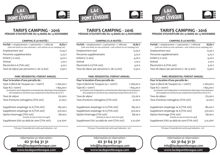 TARIFS CAMPING - 2016 PÉRIODE D’OUVERTURE DU 19 MARS AU 13 NOVEMBRE 2015 2015 2015 TARIFS CAMPING - 2016 PÉRIODE D’OUVERTURE DU 19 MARS AU 13 NOVEMBRE TARIFS CAMPING - 2016 PÉRIODE D’OUVERTURE DU 19 MARS AU 13 NOVEMBRE CAMPING À LA NUITÉE : Forfait : 1 emplacement + 2 personnes + 1 véhicule 18,80 € CAMPING À LA NUITÉE : Forfait : 1 emplacement + 2 personnes + 1 véhicule 18,80 € CAMPING À LA NUITÉE : Forfait : 1 emplacement + 2 personnes + 1 véhicule 18,80 € Emplacement seul Personne supplémentaire Enfant (-12 ans) Animal Électricité 6 A (TVA 20%) Taxe de séjour par personne (+ de 13 ans) 12,55 € 5,25 € 4,20 € 2,10 € 3,10 € 0,50 € Emplacement seul Personne supplémentaire Enfant (-12 ans) Animal Électricité 6 A (TVA 20%) Taxe de séjour par personne (+ de 13 ans) 12,55 € 5,25 € 4,20 € 2,10 € 3,10 € 0,50 € Emplacement seul Personne supplémentaire Enfant (-12 ans) Animal Électricité 6 A (TVA 20%) Taxe de séjour par personne (+ de 13 ans) 12,55 € 5,25 € 4,20 € 2,10 € 3,10 € 0,50 € (soit une tente ou une caravane + une voiture ou un camping car) (soit une tente ou une caravane + une voiture ou un camping car) (soit une tente ou une caravane + une voiture ou un camping car) PARC RÉSIDENTIEL FORFAIT ANNUEL Pour la location d’une parcelle de : Type A (Bord de Touques ou > 120m²) 2 260,00 € Type B (< 120m²) 1 835,00 € PARC RÉSIDENTIEL FORFAIT ANNUEL Pour la location d’une parcelle de : Type A (Bord de Touques ou > 120m²) 2 260,00 € Type B (< 120m²) 1 835,00 € PARC RÉSIDENTIEL FORFAIT ANNUEL Pour la location d’une parcelle de : Type A (Bord de Touques ou > 120m²) 2 260,00 € Type B (< 120m²) 1 835,00 € Taxe de séjour Taxe d’ordures ménagères (TVA 20%) 175.00 € 41.00 € Taxe de séjour Taxe d’ordures ménagères (TVA 20%) 175.00 € 41.00 € Taxe de séjour Taxe d’ordures ménagères (TVA 20%) 175.00 € 41.00 € Supplément ampérage 10 A (TVA 20%) Supplément ampérage 16 A (TVA 20%) Option hivernage (TVA 20%) 185.00 € 370.00 € 68.00 € Supplément ampérage 10 A (TVA 20%) Supplément ampérage 16 A (TVA 20%) Option hivernage (TVA 20%) 185.00 € 370.00 € 68.00 € Supplément ampérage 10 A (TVA 20%) Supplément ampérage 16 A (TVA 20%) Option hivernage (TVA 20%) 185.00 € 370.00 € 68.00 € Supplément EAU au-delà de 20m3 (TVA 20%) 3.15 €/m3 Supplément EAU au-delà de 20m3 (TVA 20%) 3.15 €/m3 Supplément EAU au-delà de 20m3 (TVA 20%) 3.15 €/m3 (La location met à disposition un branchement électrique d’une puissance de 6 ampères et une borne eau comprenant la fourniture de 20 m3 ) (remise en eau et mise hors gel) TVA pour l’ensemble des tarifs sauf indication : 10% (La location met à disposition un branchement électrique d’une puissance de 6 ampères et une borne eau comprenant la fourniture de 20 m3 ) (remise en eau et mise hors gel) TVA pour l’ensemble des tarifs sauf indication : 10% (La location met à disposition un branchement électrique d’une puissance de 6 ampères et une borne eau comprenant la fourniture de 20 m3 ) (remise en eau et mise hors gel) TVA pour l’ensemble des tarifs sauf indication : 10% Information et réservation : Information et réservation : Information et réservation : [email protected] www.lacdepontleveque.com [email protected] www.lacdepontleveque.com [email protected] www.lacdepontleveque.com 02 31 64 31 31 02 31 64 31 31 02 31 64 31 31 Extrait du règlement intérieur du Camping du Lac de Pont-l’Évêque Extrait du règlement intérieur du Camping du Lac de Pont-l’Évêque Extrait du règlement intérieur du Camping du Lac de Pont-l’Évêque - Un emplacement est prévu au maximum pour 1 voiture et 6 personnes. Au-delà de ce nombre il faut prévoir un emplacement supplémentaire. Les caravanes à double essieux sont interdites. - Un emplacement est prévu au maximum pour 1 voiture et 5 personnes. Au-delà de ce nombre il faut prévoir un emplacement supplémentaire. Les caravanes à double essieux sont interdites. - Un emplacement est prévu au maximum pour 1 voiture et 5 personnes. Au-delà de ce nombre il faut prévoir un emplacement supplémentaire. Les caravanes à double essieux sont interdites. - Un badge pour l’ouverture des barrières du camping et de la base de loisirs sera remis en échange d’un chèque de caution de 40 €. - Un badge pour l’ouverture des barrières du camping et de la base de loisirs sera remis en échange d’un chèque de caution de 40 €. - Un badge pour l’ouverture des barrières du camping et de la base de loisirs sera remis en échange d’un chèque de caution de 40 €. - Les arrivées peuvent se faire à partir de 17h00 et les départs doivent se faire le jour prévu entre 10h00 et 12h00. Après 12h30, les campeurs qui n’ont pas rendu leur badge à l’accueil seront considérés comme restant une nuit supplémentaire. Le règlement de cette dernière nuit sera à régler à l’accueil. - Les arrivées peuvent se faire à partir de 14h00 et les départs doivent se faire le jour prévu entre 10h00 et 12h00. Après 12h30, les campeurs qui n’ont pas rendu leur badge à l’accueil seront considérés comme restant une nuit supplémentaire. Le règlement de cette dernière nuit sera à régler à l’accueil. - Les arrivées peuvent se faire à partir de 14h00 et les départs doivent se faire le jour prévu entre 10h00 et 12h00. Après 12h30, les campeurs qui n’ont pas rendu leur badge à l’accueil seront considérés comme restant une nuit supplémentaire. Le règlement de cette dernière nuit sera à régler à l’accueil. - Par respect vis-à-vis des autres campeurs et résidents, le bruit et la musique devront être réduits à partir de 22h30. La direction se réserve le droit d’intervenir et voire d’expulser les campeurs en cas de non respect de cet alinéa. - Par respect vis-à-vis des autres campeurs et résidents, le bruit et la musique devront êt