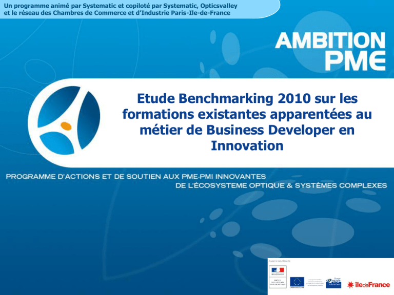 Un programme animé par Systematic et copiloté par Systematic, Opticsvalley et le réseau des Chambres de Commerce et d’Industrie Paris-Ile-de-France Etude Benchmarking 2010 sur les formations existantes apparentées au métier de Business Developer en Innovation AMBITION PME SOMMAIRE SOMMAIRE Petit rappel du contexte de l'étude Contexte et objectifs Cartographie des compétences clés du business developer en innovation Préconisations des entreprises Présentation des 21 formations étudiées en 2010 Carte de France des formations étudiées en 2009 & 2010 Méthodologie d'analyse des formations Résultats du Benchmarking et proposition d’un contenu de formation 2 AMBITION PME Contexte de l'étude Conscient de la place d’une organisation commerciale dans le développement des entreprises innovantes, le pôle de compétitivité Systematic Paris Région, associé au Réseau des Chambres de Commerce et d’Industrie d’Ile-de-France et Opticsvalley, pilote pour la période 2009-2011, un programme d’actions visant à créer les conditions optimales au développement de cet écosystème à fort potentiel de croissance. Dans le cadre de ce programme, le Pôle a mené en 2009 une étude sur les besoins à venir en compétences « Business Developer en innovation » et « Commercial en innovation » de l’écosystème Optique et Systèmes Complexes. Les travaux ont permis d’élaborer la cartographie des compétences clés de ces deux métiers et d’évaluer auprès de 90 entreprises, par le biais d’une enquête emploi leurs besoins éventuels en ressources humaines sur ces profils. En outre, ces travaux se sont accompagnées d’une étude Benchmarking sur des formations existantes en France et à l’International afin d’analyser leurs articulations avec les cartographies des compétences clés élaborées, et les éventuelles carences sur certains domaines. 3 La chaîne de valeurs de l’innovation "Business developer" en innovation, un chef d'entreprise ou une équipe de direction "Business developer" en innovation, un manager ou chef de projet de l'innovation "Business developer", une direction commerciale et de l'avant-vente Commercial en innovation Recherche Développement Production Commercialisation La cartographie du Business Developer en Innovation Objectifs Innovation Marché Co-conception 5 Moyens Métiers de l’entreprise Open innovation Pré requis Pluridisciplinaire Qualités humaines AMBITION PME Des préconisations exprimées par les entreprises… A l’issue de notre enquête réalisée auprès des entreprises en 2009, nous avons pu extraire quelques préconisations à l’égard de la formation : La nécessité d’une expérience professionnelle (au minimum entre 2 et 5 ans) Le souhait d’une formation préalable scientifique ou d’une forte appétence pour la technologie est recherchée par les entreprises Apporter une complémentarité à la formation initiale en développant une approche articulée au contexte des entreprises afin de : Faire muter progressivement les compétences vers ce profil Favoriser les mises en situation et les études de cas Proposer des modules pratico-pratiques afin de permettre à ce type de profil d’être rapidement opérationnel sur certaines missions Intégrer (dans la formation continue ou l’accompagnement des entreprises) une dimension coaching via l’accompagnement d’experts. 6 AMBITION PME Business Developer en innovation - L'étude en bref 2009 • • • Cartographie des compétences clés du Business developer en innovation et du commercial en innovation Enquête emploi auprès de 90 entreprises Etude Benchmarking sur 32 formations françaises et étrangères 2010 • • • 7 Suite de l’étude Benchmarking portant sur 21 nouvelles formations françaises et étrangères Une analyse de l’échantillon de formations au regard de la cartographie des compétences clés Proposition d’un projet de contenu de formation AMBITION PME Les 21 formations analysées en 2010 En France : 9 IAE : 1 master français (M1 et M2) 5 masters professionnels (M2) 1 executive master/MBA 2 diplômes universitaires (DU) 4 autres établissements français de formation : 1 master professionnel (M2) 2 mastères spécialisés ; 1 MBA français A l’international 8 5 MBA étrangers (Allemagne, Canada et Etats-Unis) Un executive master Belge Un master suisse 1 programme à la carte américain AMBITION PME Liste des IAE étudiés en 2010 Liste des IAE analysés Type de formation Nom Durée & ECTS Ecole ou Université Pays Master 2 Management spécialité : "Innovation technologique et gestion industrielle" 1 an (60 ECTS) IAE Bordeaux France Master 2 Master 2 Administration des Entreprises “Parcours entrepreunariat et innovation” 1 an (60 ECTS) IAE France Comte France Master 2 “Management des opérations Spécialité professionnelle : Management de l'innovation” 1 an (60 ECTS) IAE Lyon France 2 ans (120 ECTS) IAE Metz France 1 an (60 ECTS) IAE Nantes France 1 an IAE Perpignan France IAE RENNES France IAE Paris France IAE Toulouse France Master 1 & 2 Master 2 9 Marketing de l'innovation "Projet d'innovation et entrepreunariat" DU "Accompagnement de l'innovation" DU "Innovation et intelligence économique d'entreprise" Executive Master Administration des entreprises MBA Master 2 “Management de l'innovation” Temps partiel sur un an (formation continue) 1 an à temps plein ou 2 ans à temps partiel (formation continue) 1 an (60 ECTS) AMBITION PME Autres formations françaises étudiées en 2010 Liste des autres formations françaises analysées Type de formation Nom Durée & ECTS Ecole ou Université Pays Master professionnel (M2) "Innovation et valorisation de la recherche" 1 an (60 ECTS) Paris 11 - Faculté Jean Monnet France Mastère spécialisé Mastère spécialisé “Management de la technologie et de l'innovation” 1 an EMLYON France Mastère spécialisé Mastère spécialisé “Management de l'innovation et de la 