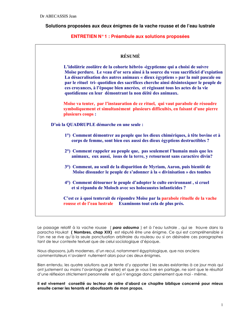 Dr ABECASSIS Jean Solutions proposées aux deux énigmes de la vache rousse et de l’eau lustrale ENTRETIEN N° 1 : Préambule aux solutions proposées RÉSUMÉ L’idolâtrie zoolâtre de la cohorte hébréo -égyptienne qui a choisi de suivre Moïse perdure. Le veau d’or sera ainsi à la source du veau sacrificiel d’expiation La désacralisation des autres animaux « dieux égyptiens » par la nuit pascale ou par le rituel tri- quotidien des sacrifices cherche ainsi désintoxiquer le peuple de ces croyances, à l’époque bien ancrées, et régissant tous les actes de la vie quotidienne en leur démontrant la non déité des animaux. Moïse va tenter, par l’instauration de ce rituel, qui vaut parabole de résoudre symboliquement et simultanément plusieurs difficultés, en faisant d’une pierre plusieurs coups : D’où la QUADRUPLE démarche en une seule : 1°) Comment démontrer au peuple que les dieux chimériques, à tête bovine et à corps de femme, sont bien eux aussi des dieux égyptiens destructibles ? 2°) Comment rappeler au peuple que, pas seulement l’humain mais que les animaux, eux aussi, issus de la terre, y retournent sans caractère divin? 3°) Comment, au seuil de la disparition de Myriam, Aaron, puis bientôt de Moïse dissuader le peuple de s’adonner à la « divinisation » des tombes 4°) Comment détourner le peuple d’adopter le culte environnant , si cruel et si répandu de Moloch avec ses holocaustes infanticides ? C’est ce à quoi tenterait de répondre Moïse par la parabole rituelle de la vache rousse et de l’eau lustrale Examinons tout cela de plus prés. Le passage relatif à la vache rousse ( para adouma ) et à l’eau lustrale , qui se trouve dans la paracha Houkat ( Nombres, chap XIX) est réputé être une énigme. Ce qui est compréhensible si l’on ne se rive qu’à la seule ponctuation arbitraire du rouleau ou si on désinsére ces paragraphes tant de leur contexte textuel que de celui sociologique d’époque. Nous disposons, juifs modernes, d’un recul, notamment égyptologique, que nos anciens commentateurs n’avaient nullement alors pour ces deux énigmes. Bien entendu, les quatre solutions que je tente d’y apporter ( les seules existantes à ce jour mais qui ont justement au moins l’avantage d’exister) et que je vous livre en partage, ne sont que le résultat d’une réflexion strictement personnelle et qui n’engage donc pleinement que moi - même. Il est vivement conseillé au lecteur de relire d’abord ce chapitre biblique concerné pour mieux ensuite cerner les tenants et aboutissants de mon propos. 1 RESUMÉ DU CHAPITRE Une vache rousse, choisie comme symboliquement la plus belle et la plus parfaite qui soit des vaches, une « miss vache », sera brûlée en dehors du camp avec ses fientes et avec trois ingrédients (hysope, cèdre, écarlate ) . Tous les intervenants à cet holocauste deviennent aussitôt impurs jusqu’au soir. De l’extérieur du camp le Pontife doit diriger son aspersion en direction de l’autel Par contre les cendres recueillies, quant à elles, et après dilution dans de l’eau , formeront « l’eau lustrale » Cette eau est dotée d’une vertu purificatrice de toute personne qui a eu un contact direct ou indirect avec un mort et qui a obligation d’en être aspergée.. Toute personne qui n’obéirait pas à ce rituel, sera impure et retranchée de son peuple. Par « contamination » celui qui y touche est inclus dans le lot des endeuillés impurs. Auparavant, pour ceux qui sont de culture non maïmonidienne, rappelons les éléments suivants qui s’imbriquent successivement l’un avec l’autre en logique de « dominos » dans la Torah. Faire ces liens préalables de cohérence, en les rejoignant bout à bout, est nécessaire pour que le thème énigmatique de la vache rousse puisse devenir ensuite compréhensible. A savoir et dans l’ordre, et chacun s’imbriquant de connexité avec l’autre : • les bases zoomorphes de l’idolâtrie zoolâtre égyptienne puis • le sens du sacrifice pascal et la nuit de mortalité des premiers nés puis • l’épisode du veau d’or puis • le principe des sacrifices dans une vision Maïmonidienne puis • les raisons de la mort subite de Nadav et Abihou, les deux fils de Aaron • et enfin l’épisode de Coré Car l’énigme de la vache rousse s’insére dans un récit biblique parfaitement cohérent, I – RAPPEL INDISPENSABLE DE L’IMPORTANCE DE LA ZOOLÂTRIE EGYPTIENNE Les égyptiens incluaient dans leur croyance tout un bestiaire d’animaux comme étant des dieux. Une excellente exposition au grand Palais ( déc 2006) sur les trésors engloutis d’Alexandrie montrait très bien combien, du lever au coucher, le moindre des gestes quotidiens des égyptiens était sous la protection d’un animal - dieu spécifique. Mais parmi eux, deux espèces étaient particulièrement vénérées : le bélier sacré et la vache sacrée. Le bélier, ( le même que celui de la constellation du bélier), était considéré intouchable, en particulier parce que son sang était supposé être le vecteur des démons. (Il est rappelé que les démons incluent tant les mauvais que les bons que les païens appellent alors des anges) Tuer un bélier revenait donc à libérer ces démons … Quant à la vache sacrée, (appelée Apis), son culte était localisé surtout à Memphis dans la 2 haute Egypte. Elle était le support du dieu égyptien ph’ta censé avoir créé la terre… Or nous avions démontré par ailleurs, en nous fondant sur le rouleau explicite, que la descendance endogame des douze fils de Jacob n’excédait pas de facto un millier d’individus dans la cohorte du Sinaï et donc que 99,92% de la multitude de cette cohorte était quasi exclusivement de mixité par mères égyptiennes, voire de parents exclusivement égyptiens et autochtones pour 100.000 d’entre eux ( qualifiés alors de érev « tourbe ») (Pour plus de déta