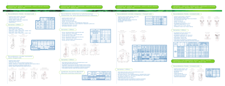 S O U PA P E S D E S U R E T E - P R E S S I O N / S A F E T Y R E L I E F V A L V E S Modèle 500 – Model 500 S O U PA P E S D E S U R E T E - P R E S S I O N / S A F E T Y R E L I E F V A L V E S Modèle 500 – Model 500 S O U PA P E S D E S U R E T E - P R E S S I O N / S A F E T Y R E L I E F V A L V E S Modèle 100 – Model 100 S O U PA P E S – P R E S S I O N / D E P R E S S I O N / P R E S S U R E & V A C U U M RELIEF VALVES - Modèle 600 – Model 600 Raccordements filetés / Screwed ends Raccordements alimentaire et pharmaceutique Connections for food and pharmaceutical industries Raccordements à brides intégrales / Flanged ends Raccordements filetés / Screwed ends - SOUPAPES DE SURETE D’EQUERRE A RESSORT – PN40 ou PN16 SPRING SAFETY RELIEF VALVES – PN40 or PN16 - CONSTRUCTION ACIER/ FONTE/ INOX MATERIAL : CARBON STEEL/ CAST IRON/ STAINLESS STEEL - RACCORDEMENTS A BRIDES INTEGRALES FLANGED ENDS - SOUPAPES DE SURETE PRESSION – DEPRESSION ET PRESSION / DEPRESSION A RESSORT – PN10 SAFETY RELIEF VALVES, VACUUM SAFETY RELIEF VALVES, PRESSURE AND VACUUM RELIEF VALVES – PN10 - SOUPAPES DE SURETE A RESSORT – PN25 OU PN40 SPRING SAFETY RELIEF VALVES – PN25 OR PN40 - SOUPAPES DE SURETE A RESSORT – PN10 SPRING SAFETY RELIEF VALVES – PN10 - CONSTRUCTION BRONZE- ACIER – INOX MATERIAL : BRONZE – CARBON STEEL – STAINLESS STEEL - CONSTRUCTION INOX 316L OU CF8M MATERIAL : 316L OR CF8M STAINLESS STEEL - RACCORDEMENTS PAR FILETAGES GAZ SCREWED ENDS BSP TYPE 610 DEPRESSION VACUUM TYPE 650 PRESSION/ DEPRESSION PRESSURE/ VACUUM - CONSTRUCTION INOX 316L MATERIAL : 316L STAINLESS STEEL - ENTREE RACCORD CLAMP OU S.M.S. – SORTIE TARAUDEE GAZ, CLAMP OU S.M.S. INLET CONNECTION : CLAMP OR S.M.S – OUTLET CONNECTION : THREADED BSP, CLAMP OR S.M.S. Variantes / Others TYPE 600 BASSE PRESSION LOW PRESSURE - RACCORDEMENTS PAR FILETAGES GAZ – 3/4’’ à 2’’ CONNECTIONS SCREWED ENDS BSP – 3/4’’ to 2’’ - CONDITIONS DE SERVICE MAXI : 10 bar/ 200°C MAXI WORKING CONDITIONS : 10 bar/ 200°C - TARAGE +15 mbar à 5 bar/ -10 mbar à –800 mbar SET PRESSURE +15 mbar to 5 bar/ -10 mbar to –800 mbar - MOYENNE ET HAUTE PRESSION MEDIUM PRESSURE AND HIGH PRESSURE - ACIER : 510ARMP – INOX : 510IRMP – PN100 CARBON STEEL : 510ARMP – STAINLESS STEEL : 5510IRMP – PN100 Variantes / Others - ACIER : 510ARHP – INOX : 510IRHP – PN250 CARBON STEEL : 510ARHP – STAINLESS STEEL : 5510IRHP – PN250 - TYPE 560 – BOUCHON NON-ETANCHE+ LEVIER (RACCORD CLAMP) TYPE 560 – UNTIGHT PLUG + LEVER (CLAMP) TYPE 510 BOUCHON ETANCHE SANS LEVIER TIGHT PLUG WITHOUT LEVER - TYPE 580 – BOUCHON ETANCHE + LEVIER (RACCORD CLAMP) TYPE 580- TIGHT PLUG + LEVER (CLAMP) TYPE 550 BOUCHON NON ETANCHE + LEVIER UNTIGHT PLUG WITH LEVER TYPE 110-130 BOUCHON ETANCHE SANS LEVIER TIGHT WITHOUT LEVER TYPE 120-140 BOUCHON ETANCHE + LEVIER TIGHT WITH LEVER TYPE 111-121 MODELE A BUSE LONGUE FULL NOZZLE - AUTRES MATIERES : HASTELLOY, PVDF… OTHER MATERIALS : HASTELLOY, PVDF… - TYPE 582 - – BOUCHON ETANCHE + LEVIER (RACCORD S.M.S.) TYPE 582- TIGHT PLUG + LEVER (S.M.S.) TYPE 520 RACCORD CLAMP CLAMP TYPE 521 RACCORD CLAMP ENTREE/ SORTIE CLAMP INLET/ OUTLET BRIDE TOURNANTE LOOSE FLANGE - RACCORDEMENTS FILETES NPT, CLAMP, S.M.S, DIN… CONNECTIONS : NPT, CLAMP, S.M.S, DIN… - RACCORDEMENTS A BRIDES DN20 à 100 – PN10/ 20/ 50 CONNECTIONS : FLANGES DN20 to 100 – PN10/ 20/ 50 - TYPE 562 – BOUCHON NON-ETANCHE+ LEVRIER (RACCORD S.M.S) TYPE 562 – UNTIGHT PLUG + LEVER (S.M.S.) TYPE 570 BOUCHON ETANCHE + LEVIER TIGHT PLUG WITH LEVER Variantes / Others * AUTRES TARAGES, RACCORDEMENTS OU MATERIAUX SUR DEMANDE. * OTHER WORKING CONDITIONS, CONNECTIONS OR MATERIALS ON REQUEST. TYPE 522 RACCORD S.M.S. S.M.S. TYPE 523 RACCORD S.M.S. ENTREE/ SORTIE S.M.S. INLET/ OUTLET A A TYPE 200 MODELE A CONTREPOIDS MODEL WITH COUNTER WEIGHT A2 Raccordements à brides tournantes Loose flanged ends A1 A1 Variantes / Others - SOUPAPES DE SURETE A RESSORT SPRING SAFETY RELIEF VALVES A - CONSTRUCTION : ACIER – INOX/ RACCORDEMENT PAR BRIDES PN40/ 16 MATERIAL : CARBON STEEL – STAINLESS STEEL/ CONNECTIONS LOOSE FLANGES ISO PN40/ 16 - JOINTS TORIQUE FPM, EPDM OU JOINT PLAT PTFE RAPPORTE DANS LE CLAPET O’RING FPM, EPDM OR DISC WITH PTFE GASKET - CONSTRUCTION : BRONZE/ RACCORDEMENT PAR BRIDES PN25/ 16 MATERIAL : BRONZE/ CONNECTIONS LOOSE FLANGES ISO PN 25/ 16 - RACCORDEMENTS PAR FILETAGES NPT, RACCORDS DIN, BRIDES ISO PN20 A ISO PN250… CONNECTIONS : SCREWED ENDS NPT, DIN FLANGES, FLANGES ISO PN20 TO ISO PN250 TYPE 511 BOUCHON ETANCHE SANS LEVIER TIGHT PLUG WITHOUT LEVER TYPE 511 BOUCHON NON ETANCHE + LEVIER UNTIGHT PLUG WITH LEVER A2 TYPE 571 BOUCHON ETANCHE + LEVIER TIGHT PLUG WITH LEVER TYPE 512/ 552/ 572 ENTREE BRIDE/ SORTIE TARAUDEE INLET FLANGE/ OUTLET THREADED D Raccordements filetés / Screwed ends * AUTRES CONDITIONS DE SERVICE, RACCORDEMENTS ET MATERIAUX SUR DEMANDE * OTHER WORKING CONDITIONS, CONNECTIONS AND MATERIALS ON REQUEST Variantes / Others Conditions de Service Maximum Maximum working conditions - JOINTS TORIQUE FPM, EPDM OU JOINT PLAT PTFE RAPPORTE DANS LE CLAPET O’RING FPM, EPDM OR DISC WITH PTFE GASKET - BUSE LONGUE EN INOX 316L – PIECES INTERNES EN INOX 316L – REVETEMENT EPOXY A CHAUD … FULL NOZZLE 316L STAINLESS STEEL – INNER PARTS 316L STAINLESS STEEL – EPOXY PLATING … - RACCORDEMENTS PAR BRIDES CLASS 150 ou 300 Lbs… CONNECTIONS FLANGES CLASS 150 or 300 Lbs A2 S O U PA P E S A E N C O M B R E M E N T R E D U I T / S A F E T Y V A L V E S WITH REDUCED SIZE - Modèle 700 – Model 700 * AUTRES CONDITIONS DE SERVICE, RACCORDEMENTS ET MATERIAUX SUR DEMANDE. * OTHER WORKING CONDITIONS, CONNECTIONS AND MATERIALS ON REQUEST. - SOUPAPES DE SURETE A RESSORT – PN16 SPRING SAFETY RELIEF VALVES – PN16 - ENCOMBREMENT REDUIT REDUCED SIZE TYPE 700 BOUCHON ETANCHE TIGHT PLUG TYPE 750 BOUCHON NON ETANCHE + ANNEAU DE RELEVAGE UNTIGHT PLUG+ LIFTING RING - CONSTRUCTION INOX 316L CONSTRUCTION 316L STAI