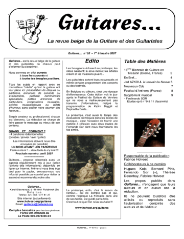 Guitares… La revue belge de la guitare et des guitaristes Guitares… n°65 – 1er trimestre 2007 Guitares... est la revue belge de la guitare et des guitaristes où chacun peut s'informer ou s'exprimer. Nous sommes en effet ouverts à tous les courants et à toutes les énergies positives. Tous les sujets en rapport avec ce merveilleux "média" qu'est la guitare ont leur place ici: présentation de disques ou partitions, annonces de concerts ou événements, publicité commerciale spécialisée, petites annonces de particuliers, compositions musicales, articles musicologiques ou billets d'humeur, sans oublier notre courrier des lecteurs... Simple amateur ou professionnel, chacun est bienvenu. La rédaction se charge de faire passer le message au mieux de son contenu. QUAND ET COMMENT ? - 4 parutions rédactionnelles (octobre / janvier / avril / juillet) Edito Table des Matières Les bourgeons éclosent au printemps; les idées naissent; la sève monte; les artistes créent et les musciens jouent... 16ème Biennale de Guitare en Tricastin (Drôme, France) 2 En Bref... 4 Les guitaristes sortent leurs nouveautés et même certains programment des concerts ou des festivals. En Belgique ou ailleurs, c'est une époque d'effervescence. Cette édition voit le jour après le Festival de Guitare de Verviers qui ne nous a malheureusement pas transmis d'informations, malgré la programmation de Katim Baggili et Raphaëlla Smits... Le printemps, c'est aussi le temps des évaluations techniques dans les écoles de musique... c'est l'occasion de fournir une matière à réflexion avec deux études de Fernando Sor dont nous fournissons les fac-simile. Jad AZKOUL à Louvain-la-Neuve 5 Nouveaux Cds 7 Festival d'Anthony (France) 8 Supplément musical - Ferdinando SOR 9 Etudes op 6 n° 9 & 11 (facsimile) _________________________ Les informations doivent nous être envoyées (si possible) UN MOIS AVANT LES PARUTIONS Facile à retenir ! ... donc facile de s'y tenir !!! _________________________ Prochain numéro: avril 2007 Responsable de la publication Fabrice Holvoet Collaborateurs à ce numéro ------------------Guitares… propose désormais aussi un agenda régulièrement mis à jour (selon l'arrivée des informations) disponible en ligne sur Internet. Même si vous êtes trop tard pour le papier, envoyez-nous vos infos (si possible par courriel pour éviter la saisie) et recommandez notre site. Hugues Kolp, Bernard Piris, Fernando Sor (+), Thérèse Desorbay, Fabrice Holvoet Guitares... Karel Gilsonstraat, 9 - B-1601 Ruisbroek (Bt) B e lg i q ue Telefax 32 / (0)2 / 377 81 27 Site internet (actuellement): www.holvoet.org/guitares Email: [email protected] Comptes bancaires (pour les dons généreux) Fortis 001-2409680-82 La Poste 000-0073336-04 Le printemps, enfin, c'est la saison de l'amour... qui ne compte pas et qui, comme l'explique La Fontaine dans une de ses fables, est guidé par la folie. C'est tout ce quel l'on nous souhaite !!! www.holvoet.org/guitares Guitares… n° 60-61 – page 1 Les propos publiés dans Guitares... n’engagent que leurs auteurs et en aucun cas la rédaction. Ils ne peuvent toutefois être utilisés ou reproduits sans l’autorisation conjointe des auteurs et de l’éditeur. Guitares… La revue belge de la guitare et des guitaristes 16ème Biennale de Guitare en Tricastin Saint-Paul-Trois-Châteaux du 30 mars au 7 avril 2007 _________________________________________________________Fabrice HOLVOET_____________ En avril 2007, ce sera la 16ème fois que Saint Paul Trois Châteaux, municipalité drômoise fera la fête autour de la guitare. Bernard piris, guitariste, luthiste et compositeur lui-même, défendra une fois encore 'sa' conception de la guitare, ouverte sur le monde et sur les autres disciplines artistiques, mais en même temps ancrée dans le prestigieux héritage de son histoire avec toute sa richesse et son exigence. Il est organisé sur deux W-E comme l'édition précédente l'avait déjà proposé, avec, pour les participants à l'ensemble, le travail de la pièce commandée spécialement au compositeur Sergio Assad. ______________________________________ L'ouverture du Festival, puisque c'est bien de cela qu'il s'agit en définitive, sera assumée par la guitariste Tania CHAGNOT, élève de Maurice Rosset puis Alberto Ponce à l’École Normale de Musique de Paris et lauréate de concours internationaux prestigieux. Carpentras, Sassari, Rome, Toronto, Benicasim, et surtout le Prix de Paris / Radio France en 1985 lui ouvriront les portes d'une carrière internationale et la produiront sur les scène du monde entier. Bien qu'elle joue des musiques de toutes les époques, elle avoue une réelle vocation à promouvoir la musique contemporaine (Ohana, Takemitsu, Ibarrondo, Lejet...), ainsi qu’un désir d’imposer son instrument dans le cadre de créations. La générosité et le talent de cette soliste sont unanimement célébrés et, à n'en pas douter, s'exprimeront dans les pièces de son programme de ce soir (Dowland, Huwet, Rodrigo, Ponce, Henze...) Guitares… n° 65 – page 2 UN WEEK - END AVEC LEO BROUWER Il est difficile en peu de lignes de présenter l’immense personnalité de Leo BROUWER et d’évoquer sa place dans l’univers de la musique, bien au-delà des frontières de la guitare dont il a pourtant renouvelé radicalement l’écriture, l’inspiration et la vitalité... Guitariste virtuose (il s’est produit dans le monde entier et a enregistré pour Deutsche Grammophon, Erato, Music Heritage Society...), compositeur (musique symphonique, électro-acoustique, ballets, opéras, musiques de films, formations de chambre...), il s'est plus récemment converti en chef d'orchestre; il a dirigé plus d’une centaine d’orchestres, incluant la Guitares… La revue belge de la guitare et des guitaristes Philharmonie de Berlin et a été chef attitré de la Orquesta Sinfonica Nacional de Cuba (1981-2003), ainsi que de la Orquesta de Cordob