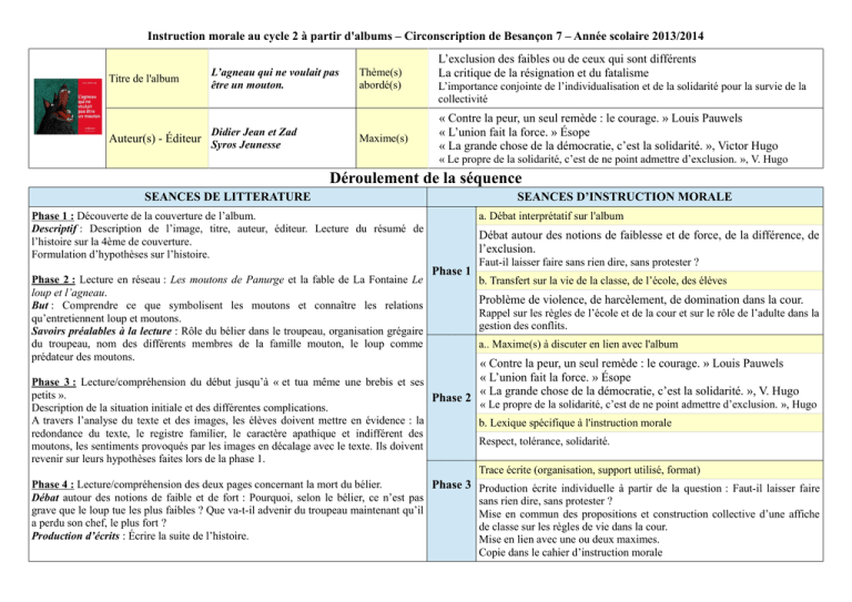 Instruction morale au cycle 2 à partir d'albums – Circonscription de Besançon 7 – Année scolaire 2013/2014 Titre de l'album L’agneau qui ne voulait pas être un mouton. Didier Jean et Zad Auteur(s) - Éditeur Syros Jeunesse Thème(s) abordé(s) Maxime(s) L’exclusion des faibles ou de ceux qui sont différents La critique de la résignation et du fatalisme L’importance conjointe de l’individualisation et de la solidarité pour la survie de la collectivité « Contre la peur, un seul remède : le courage. » Louis Pauwels « L’union fait la force. » Ésope « La grande chose de la démocratie, c’est la solidarité. », Victor Hugo « Le propre de la solidarité, c’est de ne point admettre d’exclusion. », V. Hugo Déroulement de la séquence SEANCES DE LITTERATURE SEANCES D’INSTRUCTION MORALE Phase 1 : Découverte de la couverture de l’album. Descriptif : Description de l’image, titre, auteur, éditeur. Lecture du résumé de l’histoire sur la 4ème de couverture. Formulation d’hypothèses sur l’histoire. Phase 2 : Lecture en réseau : Les moutons de Panurge et la fable de La Fontaine Le loup et l’agneau. But : Comprendre ce que symbolisent les moutons et connaître les relations qu’entretiennent loup et moutons. Savoirs préalables à la lecture : Rôle du bélier dans le troupeau, organisation grégaire du troupeau, nom des différents membres de la famille mouton, le loup comme prédateur des moutons. a. Débat interprétatif sur l'album Débat autour des notions de faiblesse et de force, de la différence, de l’exclusion. Phase 1 Faut-il laisser faire sans rien dire, sans protester ? b. Transfert sur la vie de la classe, de l’école, des élèves Problème de violence, de harcèlement, de domination dans la cour. Rappel sur les règles de l’école et de la cour et sur le rôle de l’adulte dans la gestion des conflits. a.. Maxime(s) à discuter en lien avec l'album « Contre la peur, un seul remède : le courage. » Louis Pauwels « L’union fait la force. » Ésope « La grande chose de la démocratie, c’est la solidarité. », V. Hugo Phase 3 : Lecture/compréhension du début jusqu’à « et tua même une brebis et ses petits ». Phase 2 « Le propre de la solidarité, c’est de ne point admettre d’exclusion. », Hugo Description de la situation initiale et des différentes complications. A travers l’analyse du texte et des images, les élèves doivent mettre en évidence : la b. Lexique spécifique à l'instruction morale redondance du texte, le registre familier, le caractère apathique et indifférent des Respect, tolérance, solidarité. moutons, les sentiments provoqués par les images en décalage avec le texte. Ils doivent revenir sur leurs hypothèses faites lors de la phase 1. Trace écrite (organisation, support utilisé, format) Phase 4 : Lecture/compréhension des deux pages concernant la mort du bélier. Phase 3 Production écrite individuelle à partir de la question : Faut-il laisser faire Débat autour des notions de faible et de fort : Pourquoi, selon le bélier, ce n’est pas sans rien dire, sans protester ? grave que le loup tue les plus faibles ? Que va-t-il advenir du troupeau maintenant qu’il Mise en commun des propositions et construction collective d’une affiche a perdu son chef, le plus fort ? de classe sur les règles de vie dans la cour. Production d’écrits : Écrire la suite de l’histoire. Mise en lien avec une ou deux maximes. Copie dans le cahier d’instruction morale Phase 5 : Suite et fin de l’histoire : L’union des moutons contre le loup. Mise en évidence de l’importance de la solidarité pour la survie de la collectivité et du fait que l’idée de l’union vient du plus petit et du plus faible. A travers l’analyse du texte et des images, les élèves doivent mettre en évidence : la redondance du texte, le registre familier, le changement de posture du troupeau (Sontils encore des moutons ?), le côté humoristique des images. Ils doivent revenir sur leurs productions écrites : pouvait-on se douter de la tournure de l’histoire ? Phase 6 : Travail autour du poème de la 3ième de couverture. – Lecture magistrale du poème et explicitation rapide du contexte historique du poème. – Débat : quels liens ce poème entretient-il avec l'album ? – Production d'écrits : Compléter le poème à trous (cf. Annexe) en reconstituant la succession des épisodes de l'histoire que nous avons lue. Possibilité de relire l'album si besoin. Évaluation Elle peut prendre plusieurs formes : - La qualité du raisonnement ou de l’argumentation. - La pertinence de l’utilisation du vocabulaire de la morale en prenant appui sur de petites rédactions. - L’observation des élèves, une classe ce n’est pas seulement un groupe, ce sont aussi des individualités. Le respect de soi Phase 4 La maîtrise de soi (savoir accepter une réprimande, savoir écouter, savoir se taire, être pertinent, être patient, être persévérant…) - La co-évaluation : travailler avec les élèves en débat sur les critères de pertinence des arguments (toujours justifier un argument). - L’auto-évaluation : conduire les élèves à réfléchir sur leurs comportements et attitudes. Réflexions sur la séquence mise en œuvre en classe Auteur(s) de la grille Élodie PERRITAZ, Stéphanie ROUHIER. Conseillères Pédagogiques de Besançon VII ANNEXE Consigne : Complète le poème à trous suivant en reconstituant la succession des épisodes de l'histoire que nous avons lue. Vous pouvez relire l'album si nécessaire. Quand le loup est venu chercher le _____________________ malade je n'ai rien dit car je n'étais pas ___________________________ Quand le loup est venu chercher le mouton ___________________________ je n'ai rien dit car je n'étais pas noir Quand le __________________ est venu chercher le _____________________ je n'ai rien dit car je n'étais pas handicapé Quand __________________ est venu