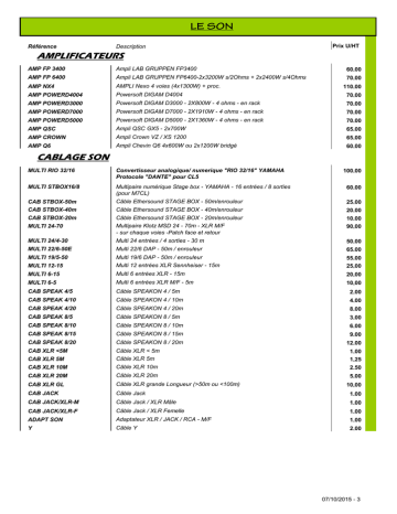 LE SON Référence Description Prix U/HT AMPLIFICATEURS AMP FP 3400 Ampli LAB GRUPPEN FP3400 60,00 AMP FP 6400 Ampli LAB GRUPPEN FP6400-2x3200W s/2Ohms + 2x2400W s/4Ohms 70,00 AMP NX4 AMPLI Nexo 4 voies (4x1300W) + proc. AMP POWERD4004 Powersoft DIGAM D4004 70,00 AMP POWERD3000 Powersoft DIGAM D3000 - 2X800W - 4 ohms - en rack 70,00 AMP POWERD7000 Powersoft DIGAM D7000 - 2X1910W - 4 ohms - en rack 70,00 AMP POWERD5000 Powersoft DIGAM D5000 - 2X1360W - 4 ohms - en rack 70,00 AMP QSC Ampli QSC GX5 - 2x700W 65,00 AMP CROWN Ampli Crown VZ / XS 1200 65,00 AMP Q6 Ampli Chevin Q6 4x600W ou 2x1200W bridgé 60,00 110,00 CABLAGE SON MULTI RIO 32/16 Convertisseur analogique/ numerique "RIO 32/16" YAMAHA Protocole "DANTE" pour CL5 MULTI STBOX16/8 Multipaire numérique Stage box - YAMAHA - 16 entrées / 8 sorties (pour M7CL) Câble Ethersound STAGE BOX - 50m/enrouleur CAB STBOX-50m CAB STBOX-40m CAB STBOX-20m MULTI 24-70 Câble Ethersound STAGE BOX - 40m/enrouleur Câble Ethersound STAGE BOX - 20m/enrouleur Multipaire Klotz MSD 24 - 70m - XLR M/F - sur chaque voies -Patch face et retour 100,00 60,00 25,00 20,00 10,00 90,00 MULTI 24/4-30 MULTI 22/6-50E Multi 24 entrées / 4 sorties - 30 m Multi 22/6 DAP - 50m / enrouleur 50,00 65,00 MULTI 19/5-50 MULTI 12-15 Multi 19/6 DAP - 50m / enrouleur Multi 12 entrées XLR Sennheiser - 15m 55,00 MULTI 6-15 Multi 6 entrées XLR - 15m 20,00 MULTI 6-5 Multi 6 entrées XLR M/F - 5m 10,00 CAB SPEAK 4/5 Câble SPEAKON 4 / 5m 2,00 CAB SPEAK 4/10 Câble SPEAKON 4 / 10m 4,00 CAB SPEAK 4/20 Câble SPEAKON 4 / 20m 8,00 CAB SPEAK 8/5 Câble SPEAKON 8 / 5m 3,00 CAB SPEAK 8/10 Câble SPEAKON 8 / 10m 6,00 CAB SPEAK 8/15 Câble SPEAKON 8 / 15m 9,00 CAB SPEAK 8/20 Câble SPEAKON 8 / 20m 12,00 CAB XLR <5M CAB XLR 5M CAB XLR 10M Câble XLR < 5m Câble XLR 5m Câble XLR 10m 1,00 1,25 2,50 CAB XLR 20M Câble XLR 20m 5,00 CAB XLR GL Câble XLR grande Longueur (>50m ou <100m) CAB JACK Câble Jack 1,00 CAB JACK/XLR-M Câble Jack / XLR Mâle 1,00 CAB JACK/XLR-F Câble Jack / XLR Femelle 1,00 ADAPT SON Adaptateur XLR / JACK / RCA - M/F 1,00 Y Câble Y 2,00 25,00 10,00 07/10/2015 - 3 ENCEINTES ENC MS1262 Tête Slingshot MS 1262 80,00 ENC MS118 Sub Slingshot MS118i 60,00 TT SPEKTRIX Adamson tête Spektrix 50,00 SB SPEKTRIX Adamson Sub Spektrix sur roulettes SUB MDC 3 Sub MDC-3 ADAMSON 3 x 18" SUB LS600 Sub NEXO LS600 - Renfort de grave 60,00 ENC MTD115 Enceinte proc. MTD115 L. Acoustics 40,00 ENC PS15 Enceinte Nexo PS15 - 1000W 40,00 ENC PS15 R2 Enceinte Nexo PS15R2 - 1000W 50,00 ENC PS10 R2 Enceinte Nexo PS10 - 1000W 35,00 ENC ALTO Enceinte retour ALTO SXM 112A 40,00 ENC 1000 Sub Basse amplifié - 1kW RMS 50,00 ENC EON 515 Enceinte JBL EON 450W RMS amplifiée + Mixage 3 voies intégré Enceinte JBL EON 450W RMS amplifiée + Mixage 3 voies intégré Enceinte JBL EON 175W RMS amplifiée 55,00 ENC COMP200 Enceinte compacte 3 voies 200W -la paire Attention : loc. uniquement par paires! 30,00 ENC MSP3 Enceinte de monitoring Yamaha MSP3 - 20V 30,00 ENC RUN 100 Enc.amplifiée s/batterie avec micro HF / CD / USB - 100W 60,00 ENC SPRINTER120 Enc.amplifiée s/batterie avec micro HF / CD / USB - 120W 90,00 ENC EON 515XT ENC EON 10G2 60,00 120,00 55,00 35,00 INTERCOM / CASQUE 60,00 IC HF C+B ALT Intercom HF ALTAIR : centrale (compatible avec IC filaire) Intercom HF ALTAIR : Casque + boitier IC FIL CENT.ALT Intercom filaire ALTAIR : centrale 30,00 IC FIL C+B ALT Intercom filaire ALTAIR : Casque + boitier 20,00 IC FIL CENTRALE Intercom filaire : centrale 20,00 IC FIL C+B Intercom filaire : Casque + boitier ceinture 15,00 IC TK CH/OR Intercom / Talkie Kenwood PRO + chargeur + oreillettes ou casque 20,00 CQ-AUDIO Casque-audio IC HF CENT.ALT 40,00 5,00 LECTEURS LEC CDJ2000 Lecteur CD pro pioneer - CDJ2000 80,00 LEC CDJ1000MK3 Lecteur CD pro pioneer - CDJ1000MK3 60,00 LEC DVD Lecteur DVD 30,00 LEC CD/MP3 Lecteur CD / MP3 + USB - TASCAM 25,00 LEC CD/USB/TUN Lecteur CD / USB / TUNER FM - Rack 1U 40,00 LEC CD Lecteur CD 20,00 LEC DBL CD LECTEUR DOUBLE CD vitesse variable 40,00 LEC 3CD+MD Lecteur 3CD + lecteur/enreg. MD Sharp 40,00 LEC 200CD Lecteur 200 CD Kenwood 50,00 LEC NUM MP3 Lecteur/enregistreur MP3 - USB/SD/MMC 50,00 LEC DAT Lecteur / enregistreur DAT (Digital Audio Tape) 40,00 LEC MD Lecteur / enregistreur Mini Disc Sony 30,00 MD V Mini Disc Vierge - PRIX NET LEC K7 Lecteur double K7 - double auto-reverse 20,00 LEC SL1200 Platine disque vinyl DJ Technics SL1200 40,00 LEC B77 Magnétophone Revox à bandes 19/38 40,00 7,00 07/10/2015 - 4 TUNER YAMAHA RDS 20,00 CLE USB 4G Clé USB 4GB - VENTE net HT 15,00 CD R 74MN CD vierge enregistrable 74 mn 4,00 TUNER ACCESSOIRES,,, REGIE,,, REGIE DJM900N Régie pioneer Pro: 2 lecteurs CDJ 2000 + 1 mixage DJM900N 220,00 REGIE CDJ1000 Régie Pioneer Pro : 2 lecteurs CDJ1000MK3 + 1 mixage DJM600 160,00 REGIE NUMARK Regie Numark "MIXDECK" 2 lecteur CD/USB/MP3/IPOD + Mixage 100,00 REGIE DISCO Régie disco : 2 lecteurs CD + 1 mixage 70,00 LIGNE 100V L1V HP Haut-parleur pr L 100V - extérieur L1V AMP200 Ampli 200WRMS pr ligne 100V -Mix. intég 40,00 L1V AMP70 Ampli 70W RMS pour ligne 100V 20,00 L1V AMP40 Ampli 40W RMS pr ligne 100V-mix integré - Alim. 12 ou 220V 15,00 CAB Cablage 100m (vente uniquement) PRIX NET 35,00 SUP HP L1V Support à chaine pour 2 HP Ligne 100V 7,00 5,00 MICROS HF MHF UR4D Système HF SHURE UR4D double avec 2 Micros mains (SM58 ou BT58 ou BT87) MHF SLX SM58 Système HF SLX Shure micro MAIN SM58 (fourni sans pile) 60,00 MHF SLX 2SM58 Système HF SLX Shure 2 micro MAIN SM58 + BOOSTER 80,00 MHF SLX C Système HF SLX Shure micro casque 60,00 MHF SM58 Système VHF Shure micro MAIN SM58 (fourni sans pile) 60,00 MHF ULXSBETA58 Système HFShure ULXS 200MHz avec micro Beta 58 (fourni sans pile) 60,00 MHF ULX BETA87 Système HF ULX Shure micro main Beta 87 (fourni sans pile) 60,00 MHF ULXP BETA54 Système HF ULXP Shure micro CASQUE B54 (fourni sans pile) 60,00 MHF EW100 C Système HF micro casque ou cravate Senn. 800MHz (fourni sans pile) 60,00 PSM600 PSM 600