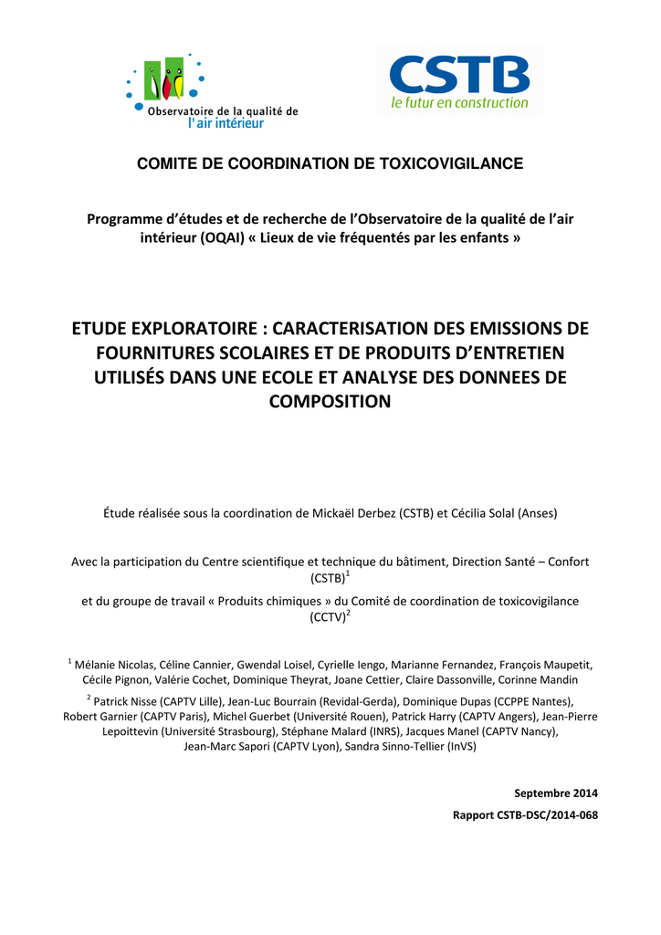 COMITE DE COORDINATION DE TOXICOVIGILANCE Programme d’études et de recherche de l’Observatoire de la qualité de l’air intérieur (OQAI) « Lieux de vie fréquentés par les enfants » ETUDE EXPLORATOIRE : CARACTERISATION DES EMISSIONS DE FOURNITURES SCOLAIRES ET DE PRODUITS D’ENTRETIEN UTILISÉS DANS UNE ECOLE ET ANALYSE DES DONNEES DE COMPOSITION Étude réalisée sous la coordination de Mickaël Derbez (CSTB) et Cécilia Solal (Anses) Avec la participation du Centre scientifique et technique du bâtiment, Direction Santé – Confort (CSTB)1 et du groupe de travail « Produits chimiques » du Comité de coordination de toxicovigilance (CCTV)2 1 Mélanie Nicolas, Céline Cannier, Gwendal Loisel, Cyrielle Iengo, Marianne Fernandez, François Maupetit, Cécile Pignon, Valérie Cochet, Dominique Theyrat, Joane Cettier, Claire Dassonville, Corinne Mandin 2 Patrick Nisse (CAPTV Lille), Jean-Luc Bourrain (Revidal-Gerda), Dominique Dupas (CCPPE Nantes), Robert Garnier (CAPTV Paris), Michel Guerbet (Université Rouen), Patrick Harry (CAPTV Angers), Jean-Pierre Lepoittevin (Université Strasbourg), Stéphane Malard (INRS), Jacques Manel (CAPTV Nancy), Jean-Marc Sapori (CAPTV Lyon), Sandra Sinno-Tellier (InVS) Septembre 2014 Rapport CSTB-DSC/2014-068 Validation Ce rapport a été validé : • par le GT « Produits chimiques » du CCTV le 27 février 2014 ; • par la cellule opérationnelle du CCTV le 14 avril 2014 ; • par le CCTV le 23 avril 2014 ; • par le Conseil Scientifique de l’OQAI par approbation électronique en juin 2014. Diffusion CAPTVs, Anses, InVS, DGS Site de l’OQAI : http://www.oqai.fr Site des centres antipoison : http://www.centres-antipoison.net/index.html Toute reproduction ou représentation intégrale ou partielle, par quelque procédé que ce soit, des pages publiées dans le présent document, faite sans l’autorisation du CSTB est illicite et constitue une contrefaçon. Seules sont autorisées, d’une part, les reproductions strictement réservées à l’usage du copiste et non destinées à une utilisation collective et, d’autre part, les analyses et courtes citations justifiées par le caractère scientifique ou d’information de l’œuvre dans laquelle elles sont incorporées (Loi du 1er juillet 1992 - art. L 122-4 et L 122-5 et Code Pénal art. 425). Toute citation d’extraits ou reproduction doit obligatoirement faire apparaitre la référence de ce document sous la forme : Derbez M et al.. 2014. Etude exploratoire : caractérisation des émissions de fournitures scolaires et de produits d’entretien utilisés dans une école et analyse des données de composition. 74 pages avec annexes. RESUME L’impact des fournitures scolaires et des produits d’entretien sur la pollution de l’air des salles de classe a été très peu étudié dans le monde et en France en particulier. Dans le cadre de son programme de travail « Lieux de vie fréquentés par les enfants », l’Observatoire de la qualité de l’air intérieur (OQAI) a réalisé une étude exploratoire visant à caractériser les émissions de composés organiques volatils (COV) et d’aldéhydes issues de produits liés aux activités scolaires et des produits d’entretien utilisés dans les salles de classe. Les produits ont été sélectionnés d’après un inventaire réalisé par l’équipe technique de l’OQAI dans une école de la région parisienne. Vingt-trois produits ont été retenus in fine afin d’être évalués en chambre d’essai d’émission (19 fournitures et 4 produits d’entretien). Les protocoles d’évaluation des émissions des produits sélectionnés ont été élaborés à partir de la procédure de qualification des émissions de composés organiques volatils par les matériaux de construction et produits de décoration (corpus de normes ISO 16000, protocole ANSES), et appliqués tels quels aux types de produits testés, en l’absence actuelle de protocole ad hoc pour ces derniers. Les essais ont été réalisés dans des chambres d’émission selon la norme EN ISO 16000-9, sous conditions contrôlées de température, d’humidité relative et de taux de renouvellement d’air. Afin de compléter l’étude, l’OQAI a associé le Comité de coordination de toxicovigilance (CCTV) afin d’acquérir des données sur les compositions des fournitures et produits sélectionnés. Les résultats des essais d’émission montrent que de nombreux COV sont émis lors de l’utilisation de produits liés aux activités scolaires et qu’ils sont très variés. Pour quelques produits, certaines substances détectées n’ont pu être identifiées avec précision, puisqu’elles ne figuraient pas dans les bibliothèques internationales de recherche. Des émissions de benzène et d’hexane ont été mesurées à des niveaux plus faibles que celles d’autres COV : n-butanol, propylène glycol, 2-éthylhexanol, 2butoxyéthanol, méthylisobutylcétone (MIBK), par exemple. Certaines fournitures scolaires testées, comme la peinture acrylique, l’encre de Chine, le feutre effaçable à sec, la gouache liquide et la peinture vitrail, ont attiré l’attention car les émissions de certains COV et/ou aldéhydes étaient plus élevées que pour les autres produits testés. Pour le volet « étude des compositions », les données de 8 produits sur les 23 testés ne sont pas disponibles (absence de réponse des fabricants ou difficulté à identifier les interlocuteurs). En l’absence de réponse du fabricant, la consultation des fiches de données de sécurité peut permettre d’apporter des éléments sur la composition. Toutefois ces fiches n’apportent pas d’informations exhaustives sur la composition, et ne sont pas toutes de qualité équivalente. Il est donc aujourd’hui nécessaire d’améliorer l’accès à l’information relative aux compositions des produits susceptibles d’émettre des substances dans les environnements intérieurs. L’an