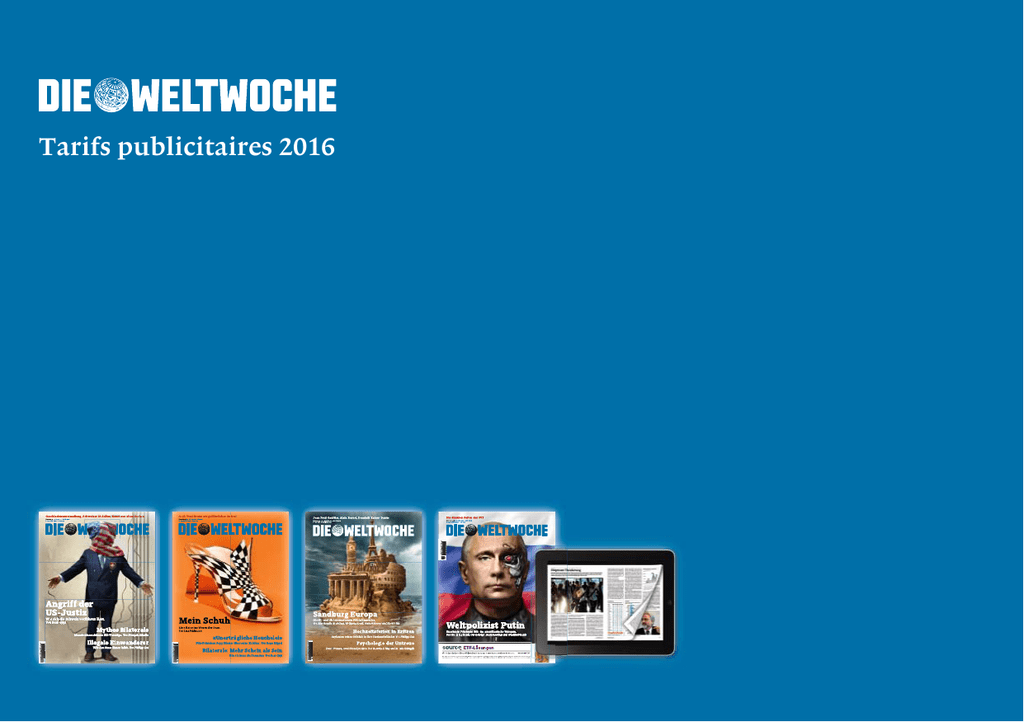 Tarifs publicitaires 2016 Editorial Lectorat Tirages et parution Michael Lauber, James Patterson, glückliche Eritreer Nummer 26 — 25. Juni 2015 – 83. Jahrgang Fr. 8.50 (inkl. MwSt.) – Euro 6.90 Suisse alémanique: 245 000 Lecteurs, 5.2% Structure Total du tirage diffusé: Total du tirage vendu: 65 139 Exemplaires 50 982 Exemplaires r Meili, Gigi Kracht ques Rousseau, Gebrüde Jakob Tanner, Jean-Jac – 83. Jahrgang Nummer 23 — 4. Juni 2015 Euro 6.90 Fr. 8.50 (inkl. MwSt.) – Yanis Varoufakis, Nummer 30 — 23. Juli 2015 – 83. Jahrgang Fr. 8.50 (inkl. MwSt.) – Euro 6.90 Jasmin Hutter, Thomas Maisse n, Felix Starker Franken, starke Schweiz Bächli, Goethe Wie gut es der Wirtschaft wirklich geht. Von Beat Gygi und Florian Schwab Der unglaubliche Fall Schlegel Abgründe und FDP-Filz in St. Gallen. Von Philipp Gut Blatters tragischer Abgang Hilfe, meine Tochter ist eine Schlampe Der Fifa-Präsident opfert amerikanischer Druck: Vorverurteilungen und Beat Gygi, Peter Hartmann u.a. Von Roger Köppel, Alex Baur, Zum richtigen Umgang mit freizügigen Kleidersitten. Von Antje Joel sich. Anjelica Huston Leben. d-Schaupielerin über ihr Die legendäre Hollywoo Von Sven Michaelsen 02.06.2015 21:56:38 Arche Schweiz Wehrhafte Asyltra dition seit 1685. Von Markus Schär und Rico Bandle Danke, Mann! «Junckers Alko holproblem» ... ...und Ein überfälliges Kompliment. Von Dominique Feusi andere Brüsse Ein EU-Report von ler Spitzen. Wolfgang Koydl WEW_30_001_COV ER 1 Pour un plan média de qualité Depuis plus de quatre-vingts ans, Die Weltwoche est incontestablement l’hebdomadaire non conformiste de la Suisse. Il découvre, va à l’essentiel et s’efforce de donner aussi un éclairage insolite des choses. Die Weltwoche se voit comme la voix dérangeante du raisonnable. L’hebdomadaire est connu pour son approche libérale de l’économie et son approche critique de l’Etat. Des auteurs et chroniqueurs indépendants contribuent à faire de Die Weltwoche un forum unique où sont débattues d’intéressantes analyses et opinions de toute obédience. Notre lectorat est, lui aussi, unique puisqu’il se distingue par une culture supérieure à la moyenne, un revenu élevé, une propension à consommer et un souci de la qualité. Lecteurs Part Affinité 89 156 36.4% 63.6% 72 128 59 85 102 24.2% 34.4% 41.4% 78 97 124 29 123 94 11.6% 50.0% 38.3% 62 96 132 84 34.1% 129 14 51 15 5.8% 20.7% 6.2% 189 143 148 Sexe Femme Homme Age De 14 à 34 De 35 à 54 De 55+ Formation Obligatoire Secondaire Hautes études Revenu par ménage Au-dessus de CHF 10 000.– Classification par métier Cadre supérieur, employé Cadre moyen, employé Entrepreneur, indépendant Sources: MACH Basic 2016-1 WEMF accréditation des tirages 2015 2 Formats et prix édition principale 2e de couverture Prix brut: CHF 21 300.– 1re 1/1 page, face éditorial Prix brut: CHF 18 160.– Miroir: Francs-bords: 208 · 269 mm 230 · 300 mm +4 mm de marge Miroir: Francs-bords: 4e de couverture Prix brut: CHF 23 200.– 1/1 page, face index Prix brut: CHF 17 740.– Miroir: Francs-bords: 208 · 269 mm 230 · 300 mm +4 mm de marge Miroir: Francs-bords: 208 · 269 mm 230 · 300 mm +4 mm de marge Coverspread Prix brut: CHF 52 720.– Miroir: Francs-bords: 430 · 269 mm 460 · 300 mm +4 mm de marge page double Prix brut: CHF 27 700.– Miroir: Francs-bords: 434 · 269 mm 460 · 300 mm +4 mm de marge Ouverture Prix brut: CHF 36 700.– 1/1 page Prix brut: CHF 15 400.– Miroir: Francs-bords: 434 · 269 mm 460 · 300 mm +4 mm de marge Miroir: Francs-bords: 208 · 269 mm 230 · 300 mm +4 mm de marge 3e de couverture Prix brut: CHF 16 910.– 2/3 page verticale Prix brut: CHF 13 500.– Miroir: Francs-bords: 208 · 269 mm 230 · 300 mm +4 mm de marge Miroir: Francs-bords: 137 · 269 mm 150 · 300 mm +4 mm de marge 208 · 269 mm 230 · 300 mm +4 mm de marge 3 1/2 page horizont. Prix brut: CHF 10 200.– 1/4 page horizontale Prix brut: CHF 5 480.– Miroir: Francs-bords: 208 · 131 mm 230 · 149 mm +4 mm de marge Miroir: Francs-bords: 208 · 65 mm 230 · 75 mm +4 mm de marge 1/3 page verticale Prix brut: CHF 7 060.– 1/6 page verticale Prix brut: CHF 3 900.– Miroir: Francs-bords: 66 · 269 mm 79 · 300 mm +4 mm de marge Miroir: Francs-bords: 1/3 page horizontale Prix brut: CHF 7 060.– 1/9 page verticale Prix brut: Miroir: Francs-bords: Miroir: Francs-bords: 208 · 85 mm 230 · 103 mm +4 mm de marge Notes Tous les prix s’entendent TVA de 8% en sus. Annonces consécutives: supplément de 20% sur le prix brut. Edition spéciale: supplément de 10% sur le prix brut. Commission Conseil: 15%. RACHA: 15% à partir de CHF 40 000.– brut. Rabais social: 50% (non cumulable avec rabais et CC /RACHA). Uniquement pour les organisations avec Label ZEWO. Ordres d’insertion: la suppression ou le déplacement d’ordres d’insertion passés ne peut être accepté(e) que jusqu’au délai d’insertion. Weltwoche se réserve le droit de facturer toute annulation qui interviendra passé ce délai. Annonces francs-bords: +4 mm de marge de rognage sur tous les côtés extérieurs. Les textes et parties d’illustrations qui ne doivent pas être rognésnécessitent une marge de 10 mm. Conditions d’insertion: Prière de consulter www.weltwoche.ch/agb 66 · 131 mm 79 · 149 mm +4 mm de marge CHF 2 800.– 66 · 90 mm 79 · 100 mm +4 mm de marge Rabais de quantité CHF CHF CHF CHF CHF CHF CHF CHF 40 000.– 60 000.– 80 000.– 100 000.– 150 000.– 200 000.– 250 000.– 300 000.– 2% 3% 4% 5% 6% 8% 12% 14% CHF CHF CHF CHF CHF CHF CHF CHF 400 000.– 450 000.– 500 000.– 600 000.– 700 000.– 800 000.– 900 000.– 1 000 000.– 18% 19% 20% 21% 22% 23% 24% 25% Rabais de quantité pour les éditions principales et WW Magazin (cumulables sur les annonces et tous les encarts). Délai d’enlèvement: 12 mois 4 Formats et prix WW Magazin 4e de couverture Prix brut: CHF 28 350.– 1re 1/1 page, face éditorial Prix brut: CHF 20 500.– Francs-bords: