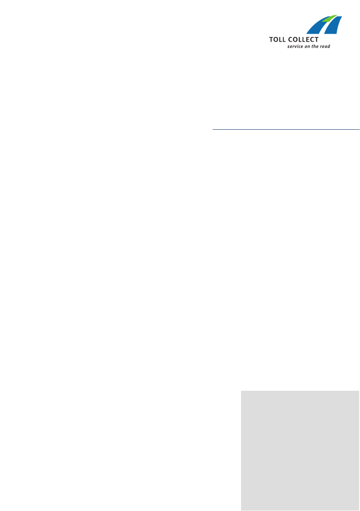F Appareil embarqué Mode d’emploi Version 3.7 B.C.DG Remarque sur l’indication et la représentation de la limite du tonnage soumis au péage dans cette version du manuel d’utilisation Conformément à l’annonce faite par le ministère allemand des transports et infrastructures numériques, une baisse du péage est prévue pour les véhicules à partir d’un poids total autorisé en charge de 7,5 t minimum à partir du 1er octobre 2015. En conséquence, ce document prend d’ores et déjà en compte la nouvelle limite de poids pour le réglage des données du véhicule (pages 8 et 14) afin de garantir la validité du manuel d’utilisation à partir d’octobre 2015. Jusqu’à l’introduction obligatoire de la baisse du tonnage, la limite actuellement valable de 12 tonnes sera indiquée dans le menu de l’appareil embarqué. Informez-vous sur le site Internet www.toll-collect.de de l’état actuel concernant la baisse du tonnage. Responsable du contenu : Toll Collect GmbH Linkstr. 4 10785 Berlin 2015 © Toll Collect GmbH. Tous droits réservés. Les utilisateurs du système de perception automatique du péage sont tenus, conformément au point 32 des Conditions générales de vente de la société Toll Collect GmbH, de manipuler les appareils embarqués de manière conforme. Ils s’engagent notamment, avant chaque utilisation de routes à péage, à s’assurer que la fonction de paiement de l’appareil embarqué est opérationnelle et à vérifier l’exactitude des données sur l’état du véhicule. La société Toll Collect GmbH attire leur attention sur le fait que le lancement simultané des appareils embarqués, au démarrage du PL, ainsi que toutes les modifications de réglages effectués par les conducteurs sur l’appareil embarqué et dysfonctionnements dans la fonction de paiement de l’appareil sont enregistrés de manière horodatée. Dans le cadre des contrôles de péages, les agents de la Direction fédérale du transport de marchandises (BAG) peuvent interroger ces informations dans n’importe quel appareil embarqué et contrôler le respect des obligations de chaque utilisateur de manière horodatée. Version 3.7 B C DG Sommaire 1 Remarques générales.......................................................2 2 Le système de péage automatique..................................3 3 Eléments de commande....................................................4 4Fonctionnement................................................................4 4.1 Saisie des données utilisateur.......................................8 4.2Services de calcul du péage en Allemagne et Autriche....11 4.3 Affichages de service .................................................. 12 4.3.1Affichages de service sur les trajets en Allemagne...................................................... 12 4.3.2Affichages de service sur les trajets en Autriche......................................................... 12 4.4 Réglages des menus.................................................... 14 4.5 Messages d’avertissements et d’erreurs....................... 21 4.5.1Messages d’avertissements et d’erreurs en cas de pannes techniques............................... 21 4.5.2Messages d’avertissements et d’erreurs concernant le service de perception de péage...... 23 4.6 Remarques concernant la baisse du tonnage................. 25 1 1 Remarques générales 1 Remarques générales Avant votre premier trajet, familiarisez-vous avec les fonctions de votre appareil embarqué. La commande pendant la conduite est rigoureusement interdite. ▪▪ ▪▪ ▪▪ ▪▪ ▪▪ ▪▪ ▪▪ ▪▪ ▪▪ 2 Le réglage correct du poids et du nombre d’essieux du véhicule incombe au chauffeur avant l’entrée sur des routes payantes en Allemagne. Avant l’entrée sur des routes à péage en Autriche, le nombre correct d’essieux (catégorie) doit être déclaré conformément au règlement concernant les péages sur les autoroutes et voies rapides d’Autriche « Mautordnung für die Autobahnen und Schnellstraßen Österreichs ». Vous pouvez lire la dernière version de ce règlement à tout moment à l’adresse www.asfinag.at. En cas de dysfonctionnements de l’appareil embarqué en Allemagne, vous devez imputer manuellement la section payante via Internet ou le terminal de péage. En cas de dysfonctionnements de l’appareil embarqué en Autriche, vous devez régler a posteriori la section payante à un point de vente GO. En cas de panne durable de l’appareil embarqué, vous pourrez obtenir un boîtier GO au point de vente GO. L’appareil embarqué doit être posé et scellé dans votre véhicule, de manière conforme, par un partenaire de service autorisé par Toll Collect. Merci de ne pas intervenir sur l’appareil embarqué ou sur les câbles d’alimentation et de ne pas modifier la position de montage. N’utilisez pas d’objets pointus pour actionner les touches de l’appareil embarqué. Pour nettoyer l’appareil embarqué, n’utilisez pas de produit à récurer ni de dissolvant, tel que du diluant ou de l’essence. Nettoyez l’appareil embarqué Grundig à l’aide d’un chiffon légèrement humidifié. Pour garantir un parfait fonctionnement de l’appareil embarqué, aucun objet ne doit se trouver entre le pare-brise et le module DSRC. De même, avec l’appareil Continental, aucun objet ne doit se trouver à proximité, sur l’appareil ou au-dessus de l’appareil. 2 L e s y s t è m e d e p é a g e a u t o m at i q u e 2 Le système de péage automatique Cher utilisateur, La société Toll Collect vous remercie d’avoir choisi de faire poser le présent appareil embarqué dans votre véhicule. L’appareil embarqué constitue l’élément de base pour la perception automatique des péages sur les routes à péage en Allemagne ainsi que pour la perception facultative des péages en Autriche. En Allemagne, le rôle de l’appareil embarqué est ▪▪ de localiser e