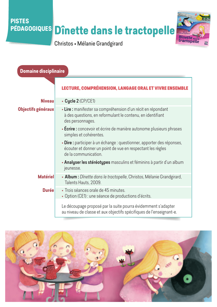 PISTES PÉDAGOGIQUES Dînette dans le tractopelle Christos • Mélanie Grandgirard Domaine disciplinaire LECTURE, COMPRÉHENSION, LANGAGE ORAL ET VIVRE ENSEMBLE Niveau Objectifs généraux • Cycle 2 (CP/CE1) •Lire : manifester sa compréhension d’un récit en répondant à des questions, en reformulant le contenu, en identifiant des personnages. •Écrire : concevoir et écrire de manière autonome plusieurs phrases simples et cohérentes. •Dire : participer à un échange : questionner, apporter des réponses, écouter et donner un point de vue en respectant les règles de la communication. •Analyser les stéréotypes masculins et féminins à partir d’un album jeunesse. Matériel Durée • Album : Dînette dans le tractopelle, Christos, Mélanie Grandgirard, Talents Hauts, 2009. • Trois séances orale de 45 minutes. • Option (CE1) : une séance de productions d’écrits. Le découpage proposé par la suite pourra évidemment s’adapter au niveau de classe et aux objectifs spécifiques de l’enseignant-e. PISTES PÉDAGOGIQUES Dînette dans le tractopelle Christos • Mélanie Grandgirard Déroulé des séances OBJECTIFS SPÉCIFIQUES COMPÉTENCES DE L’ÉLÈVE Séance 1 Discussion sur le sujet et découverte de la couverture • répondre à des questions de culture générale, • observer une couverture et la décrire, • émettre des hypothèses. MATÉRIEL • Couverture Lecture et découverte des premières doubles pages • observer des illustrations et les décrire, • écouter ou lire le texte, • reformuler le texte. • Pages 2 et 3 • Pages 4 et 5 Retour à la page de couverture • observer à nouveau la couverture, • vérifier les hypothèses émises en début de séance, • anticiper la suite de l’histoire • Couverture Séance 2 Lecture et découverte des autres doubles pages • observer et décrire l’illustration d’une double page, • écouter ou lire le texte, • reformuler le texte, • répondre à des questions de compréhension. • Pages 6 à 17 DURÉE 45 min 45 min Conclusion • donner son avis personnel. Débat • participer à un débat (écouter, émettre son point de vue de manière intelligible). Séance 3 Séance-bilan • étudier un ou plusieurs catalogue(s) de jouets, • créer un catalogue de jouet mixte. • Catalogue(s) de 45 min jouets PISTES PÉDAGOGIQUES Dînette dans le tractopelle Christos • Mélanie Grandgirard Séance 1 Introduction : Les représentations des élèves ❱ Couverture Séance 2 Des pages roses et des pages bleues ❱P ages 2 à 5 emander aux élèves : D • En général, qui joue à la dînette ? Qui joue avec un tractopelle ? •Qu’est-ce qu’un catalogue de jouets ? •Comment sont rangés les jouets dans un catalogue de jouets ? bservation de la couverture : des hypothèses sur l’histoire O L’illustration de couverture (cacher le titre avec une bande de papier) : •Que voyez-vous ? Qui sont les personnages ? Que font-ils ? Où sont-ils ? •Sont-ils dans le même endroit ? Expliquez. •Quelles sont les couleurs dominantes ? (Amener à formuler le stéréotype du bleu pour les garçons, rose pour les filles) •Que fait le garçon ? (Réponse probable : il regarde la petite fille.) À votre avis, pourquoi ? (Réponse probable : parce qu’il souhaite jouer avec elle. Creuser cette hypothèse.) Le titre du livre (enlever la bande de papier qui cache le titre) : •Faire lire le titre par les élèves. •D’après vous, que raconte cette histoire ? Les pages roses : •Observation de l’illustration : laisser les élèves parler librement de la scène (les personnages, les objets, la couleur, les activités des poupées…). •Après lecture du texte : demander aux élèves de reformuler le texte avec leurs propres mots et compléter éventuellement avec ces questions : •Qui est Annabelle ? Où vit-elle ? Que fait-elle ? •Qu’aimerait-elle faire aussi ? Qu’est-ce qui lui manque ? •Pourquoi n’en parle-t-elle pas aux autres poupées ? •Pourquoi a-t-elle peur que les autres poupées se moquent d’elle ? •Que regarde Annabelle ? •Pourquoi n’y a-t-il pas de bulldozer dans les pages roses ? FICHES D’ACTIVITÉS ÉLÈVES Dînette dans le tractopelle Christos • Mélanie Grandgirard L es pages bleues : •Observation de l’illustration : laisser les élèves parler librement de la scène (les personnages, les objets, la couleur, les activités des personnages…). •Après lecture du texte : demander aux élèves de reformuler le texte avec leurs propres mots et compléter éventuellement avec ces questions : •Qui est Grand Jim ? Où vit-il ? Que fait-il ? •Qu’aimerait-il faire aussi ? Qu’est-ce qui lui manque ? •Pourquoi n’en parle-t-il pas à ses copains ? •Pourquoi a-t-il peur que ses copains se moquent de lui ? •Que regarde Grand Jim ? •Pourquoi n’y a-t-il pas de service à thé dans les pages bleues ? Séance 3 Anticiper la suite de l’histoire ❱C ouverture etour à la page de couverture : R •Observation de l’illustration et vérification des hypothèses émises en début de séance : Que fait Grand Jim ? À votre avis, pourquoi ? (Hypothèse confirmée : il souhaite jouer avec Annabelle et son service à thé.) nticiper la suite de l’histoire : A •Proposer aux élèves (à l’oral ou à l’écrit) d’imaginer la suite de l’histoire : •D’après vous, que va-t-il se passer ? Que va faire Grand Jim ? Que va faire Annabelle ? Séance 4 Découvrir le reste du livre ❱P age 6 à 17 Pour les doubles pages suivantes, reprendre le même déroulement : •Observation de l’illustration : laisser les élèves parler librement. •Après lecture du texte par l’enseignant-e : demander aux élèves de reformuler le texte avec leurs propres mots et compléter éventuellement avec les questions suivantes : Pages 8-9 •À quel événement le « paf ! » fait-il référence ? •Que signifie « Annabelle s’enflamme » ? •Q