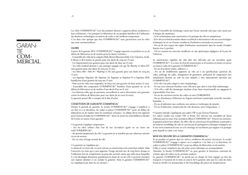 GARANTIE COMMERCIAL _FR. _EN. Les vélos COMMENCAL® sont des produits destinés à apporter pleine satisfaction à leurs utilisateurs, c’est pourquoi la fabrication de ces produits bénéficie de l’utilisation des dernières technologies en matière de cycles et des meilleurs composants. C’est dans cette optique que chez COMMENCAL® nous garantissons tous les vélos que nous commercialisons. - Pour l’ensemble des dommages causés par l’usure normale ainsi que ceux causés par la fatigue des matériaux, - Si les réclamations sont consécutives à la pratique du vélo en compétition, - Si le vélo est utilisé de manière abusive au delà de sa destination et des ses caractéristiques techniques ou en cas d’autres conditions d’utilisation anormales ou excessives, - En cas de non respect des règles d’utilisation mentionnées dans les modes d’emploi fournis avec le produit, - S’il est constaté un entretien insuffisant ou une quelconque négligence de la part de l’acheteur. Durée A partir de la gamme 2014, COMMENCAL® s’engage à garantir ses produits en cas de défaut de fabrication ou de matière pour les durées suivantes : - L’ensemble des vélos de la catégorie Baby Boom (Ramones Kid), City (Uptown, Acid), le Route et El Camino est garanti pour une durée de cinq ans (5 ans), - Les Supernormal sont garantis pour une durée de deux ans (2 ans), - Les vélos hardtail destinés à une pratique engagée tels que les Absolut et Meta HT sont garantis pour une durée de cinq ans (5 ans), - Les Meta AM / AM 29 / HipHop et SX sont garantis pour une durée de cinq ans (5 ans), - Les Suprême (Suprême 20, Suprême 24, Suprême jr, Suprême Fr et Suprême DH) bénéficient d’une garantie de cinq ans (5 ans), - Pour tous les vélos tout suspendus, les bases ont une garantie de deux années (2 ans), - L’ensemble des composants COMMENCAL® bénéficie d’une garantie en cas de défaut de fabrication ou de matière d’une durée d’un an (1 an), - Les finitions telles que les peintures, autocollants et autres décorations sont garanties contre les défauts de fabrication pour une durée de six mois (6 mois), La garantie prend effet à compter de la date d’achat. Conditions de garantie COMMENCAL® Durant la période de garantie, la société COMMENCAL® s’engage à remplacer à ses frais et à sa discrétion, les cadres et pièces COMMENCAL® ayant un défaut de fabrication ou de matière dans les conditions suivantes : Le défaut devra être apprécié par le bureau d’études de COMMENCAL®. Ainsi, ils seront les seuls habilités à décider de la mise en oeuvre d’une garantie. • La garantie s’applique uniquement : - Sur les vélos achetés chez l’un de nos revendeurs agréés ou sur notre site web COMMENCAL®, - Au premier propriétaire du vélo. La garantie ne se transfère pas aux acheteurs suivants en cas de revente, - En cas strict d’usage normal du vélo. • La garantie ne s’applique pas : La durée de vie d’un vélo va varier suivant sa construction et les matériaux utilisés. Mais l’entretien, les soins qui y sont apportés, l’usage intensif avec de trop fortes charges et l’utilisation lors de compétitions ou pour des activités autres que celles pour lesquelles il a été développé diminuent grandement la durée de vie du vélo et peuvent entraîner une rupture aléatoire et en annuler la garantie. Ainsi la garantie COMMENCAL® ne s’appliquera pas dans les cas suivants : La maintenance régulière du vélo doit être effectuée par un revendeur agréé COMMENCAL®. A ce titre, les frais de maintenance et d’entretien n’entrent en aucun cas dans le cadre de la garantie COMMENCAL® : - En cas d’accident (chute, collision...), - En cas de modification apportée au vélo ou à ses spécifications (peinture du cadre, polissage du cadre, changement de géométrie, utilisation de composants non initialement destinés au vélo ou non adaptés...) non expressément autorisée par COMMENCAL®, - Si le vélo n’est plus adapté à votre morphologie, - Si vous avez continué d’utiliser votre vélo alors que celui-ci était déjà endommagé, - Si le vélo a subi des dommages résultant d’une faute intentionnelle ou engageant la responsabilité d’un tiers, - En cas de corrosion interne des cadres en acier CHROMOLY, - En cas d’incidences d’éléments ou d’agents extérieurs (catastrophe naturelle, incendie, humidité...), - En cas d’utilisation non conforme aux normes et techniques de sécurité, - En cas d’utilisation commerciale du vélo (location, mise à disposition...). • Garantie spéciale s’appliquant aux cadres VIP et aux Factory Frameset : Les cadres vendus nus (cadres VIP et Frame Set) doivent être assemblés de façon cohérente par les soins d’un revendeur officiel COMMENCAL®. Dans le cas contraire, la garantie pourra être refusée. En effet, elle ne couvrira pas les problèmes consécutifs à un mauvais assemblage du vélo ne suivant pas les prérogatives techniques indiquées sur le site www.commencal.com, ou si le montage est incohérent par rapport à la pratique pour laquelle le cadre a été conçu. Mise en oeuvre de la garantie COMMENCAL® Si un produit est garanti dans les strictes conditions du présent document, la société COMMENCAL® s’engage à réparer ou à remplacer à ses frais et à sa discrétion, les cadres et pièces COMMENCAL® ayant un défaut de fabrication ou de matière. Celles-ci seront remplacées par une pièce neuve identique ou correspondante. Toutefois, la Société COMMENCAL® ne peut garantir la fourniture constante de certains types de cadres ou de certaines couleurs. La garantie COMMENCAL® ne prend pas en charge les frais engagés au titre du transport à l’occasion de la mise en oeuvre de la garantie ainsi que les coûts de main d’oeuvre relatifs à la manutention et de l’assemblage des pièces de remplacement. _FR. GARANTIE COMMERCIAL Le remplace