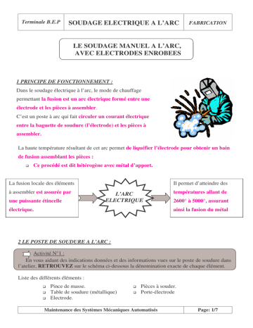 Terminale B.E.P SOUDAGE ELECTRIQUE A L’ARC FABRICATION LE SOUDAGE MANUEL A L’ARC, AVEC ELECTRODES ENROBEES 1 PRINCIPE DE FONCTIONNEMENT : Dans le soudage électrique à l’arc, le mode de chauffage permettant la fusion est un arc électrique formé entre une électrode et les pièces à assembler. C’est un poste à arc qui fait circuler un courant électrique entre la baguette de soudure (l’électrode) et les pièces à assembler. La haute température résultant de cet arc permet de liquéfier l’électrode pour obtenir un bain de fusion assemblant les pièces : Ce procédé est dit hétérogène avec métal d’apport. La fusion locale des éléments à assembler est assurée par une puissante étincelle Il permet d’atteindre des L’ARC ELECTRIQUE températures allant de 2600° à 5000°, assurant ainsi la fusion du métal électrique. 2 LE POSTE DE SOUDURE A L’ARC : Activité N°1 : En vous aidant des indications données et des informations vues sur le poste de soudure dans l’atelier, RETROUVEZ sur le schéma ci-dessous la dénomination exacte de chaque élément. Liste des différents éléments : Pince de masse. Table de soudure (métallique) Electrode. Pièces à souder. Porte-électrode Maintenance des Systèmes Mécaniques Automatisés Page: 1/7 Terminale B.E.P SOUDAGE ELECTRIQUE A L’ARC FABRICATION Porte-électrode Electrode Pince de masse Pièces à souder Table métallique 2.1 Les différents postes de soudure : Pour la soudure électrique à l’arc deux types de courant peuvent être utilisés : Le courant continu (poste rotatif). Le courant alternatif (poste statique). LES POSTES DE SOUDAGE A L’ARC ELECTRIQUE POSTE ROTATIF POSTE STATIQUE Moteur + dynamo Transformateur (courant continu) (courant alternatif) L’une des deux bornes du poste à souder est reliée aux pièces à souder, l’autre borne étant reliée à une électrode Pièce à souder ARC ELECTRIQUE Maintenance des Systèmes Mécaniques Automatisés Electrode Page: 2/7 Terminale B.E.P SOUDAGE ELECTRIQUE A L’ARC FABRICATION Le poste rotatif: Il est composé d’un moteur thermique ou électrique qui entraîne une génératrice de courant continu : ’’ la dynamo’’ . Moteur Dynamo Le poste statique: Il transforme le courant alternatif, fourni par le réseau de distribution, en un courant également alternatif mais cette fois, approprié au soudage. Transformateur 3 L’ELECTRODE : L’électrode est fusible, elle constitue le métal d’apport. C’est un fil métallique (âme) enduit d’un revêtement appelé enrobage. (poudre métallique ou minérale). Enrobage Ame Diamètre de l'électrode L’enrobage, également fusible, dépose un laitier protecteur sur le bain de métal fondu. Maintenance des Systèmes Mécaniques Automatisés Page: 3/7 Terminale B.E.P SOUDAGE ELECTRIQUE A L’ARC FABRICATION Nota: Ce laitier (péllicule superficielle) a pour rôle d’isoler la soudure de toute oxydation avec l’oxygène contenu dans l’air. Les diamètres courants d’électrodes sont : ∅ standard 1 1.5 2 2.5 3.2 4 5 6.3 8 3.1 Choix de l’électrode: En fonction de l’épaisseur des pièces à souder, il faut sélectionner : Son diamètre d’électrode (tableau 1). L’intensité de soudage du poste à souder (tableau 2). DIAMETRE 2 2.5 3.2 4 5 6.3 1.5 1 1 25 2 2 35 EPAISSEUR DES PIECES A SOUDER EPAISSEUR DES PIECES A SOUDER 1.5 DIAMETRE 3 3 2 2.5 3.2 4 5 6.3 45 60 55 4 70 5 85 100 130 6 90 110 130 160 8 120 140 160 9 125 150 170 10 130 160 190 230 12 130 170 200 250 15 180 210 270 20 190 220 300 25 25 200 230 320 30 30 200 250 320 4 5 6 8 9 10 12 15 20 tableau 1 90 tableau 2 Pour le choix du diamètre de l’électrode (tableau 1), choisir une case blanche et si possible avec une croix. Maintenance des Systèmes Mécaniques Automatisés Page: 4/7 Terminale B.E.P SOUDAGE ELECTRIQUE A L’ARC FABRICATION 4 PREPARATION DU TRAVAIL : Avant la phase de soudage, certaines opérations sont nécessaires pour préparer le matériel et le poste : 4.1 Préparer les pièces : Pour réaliser une bonne soudure, les pièces doivent être : Dégraissées et exemptes de peinture (isolant). Ebavurées et chanfreinées à l’emplacement de la soudure. Positionnées l’une par rapport à l’autre. Immobilisées en position. 4.2 Choisir l’électrode : Se reporter au tableau 1 (paragraphe 3.1). 4.3 Monter la baguette dans le porte-électrode : Il faut positionner la baguette, du côté de l’âme, dans la pince du porteélectrode 4.4 Préparer le poste : Régler l’intensité de soudage du poste à souder (se reporter au tableau 2, paragraphe 3.1). Serrer avec la pince de masse, la table de travail ou les pièces à souder (l’important est de fermer le circuit électrique de soudage). 5 MODE OPERATOIRE POUR LE SOUDAGE A l’ARC : Etudions la réalisation d’un assemblage classique : deux pièces perpendiculaires. Tracez et positionnez les pièces. Maintenance des Systèmes Mécaniques Automatisés Page: 5/7 SOUDAGE ELECTRIQUE A L’ARC FABRICATION 80 Terminale B.E.P 100 45 80 pièces avant soudage (épaisseur 10 mm) pièces après soudage Réaliser les points de soudage dans l’ordre 1, 2, 3, 4, 5, 6 (figure 1) en tenant l’électrode à 45° par rapport aux pièces (figure 2). figure 1 figure 2 figure 3 Nota : Le pointage a pour but de conserver la perpendicularité (figure 3). Pour cela, faire toucher l’électrode pour amorcer, puis l’écarter légèrement pour obtenir un arc de fusion. Redresser si besoin les pièces pour un bon équerrage. Souder en déplaçant lentement l’électrode (figure 2). Si une deuxième passe est nécessaire, il faut piquer la soudure,c’est à dire enlever le laitier (enrobage fondu), à l’aide d’un marteau de soudeur Maintenance des Systèmes Mécaniques Automatisés Page: 6/7 Terminale B.E.P SOUDAGE ELECTRIQUE A L’ARC FABRICATION Brosser ensuite la soudure avec une brosse métallique. Attention : Pour ces opérations, le port des lunettes de protec
